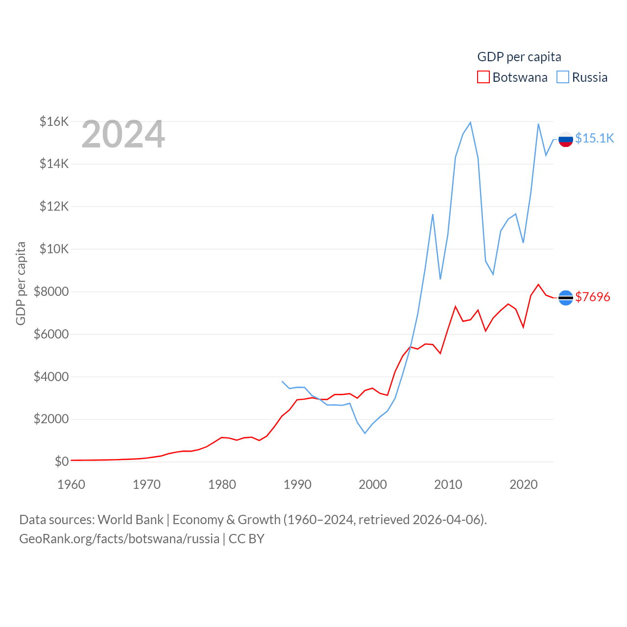 By GDP, Botswana ranks 133/197 ($19.4B) and Russia ranks 11/197 ($2.17T). By GDP per capita, Botswana ranks 97/197 ($7,696), while Russia ranks 68/197 ($15,145).