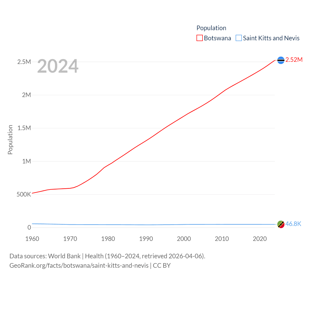 Botswana has a population of 2.52M (ranked 142/197), compared with 46.8K in Saint Kitts and Nevis (ranked 189/197). Botswana's land area is 218,816 sq mi versus 100.4 sq mi for Saint Kitts and Nevis (ranked 47th vs. 189th).