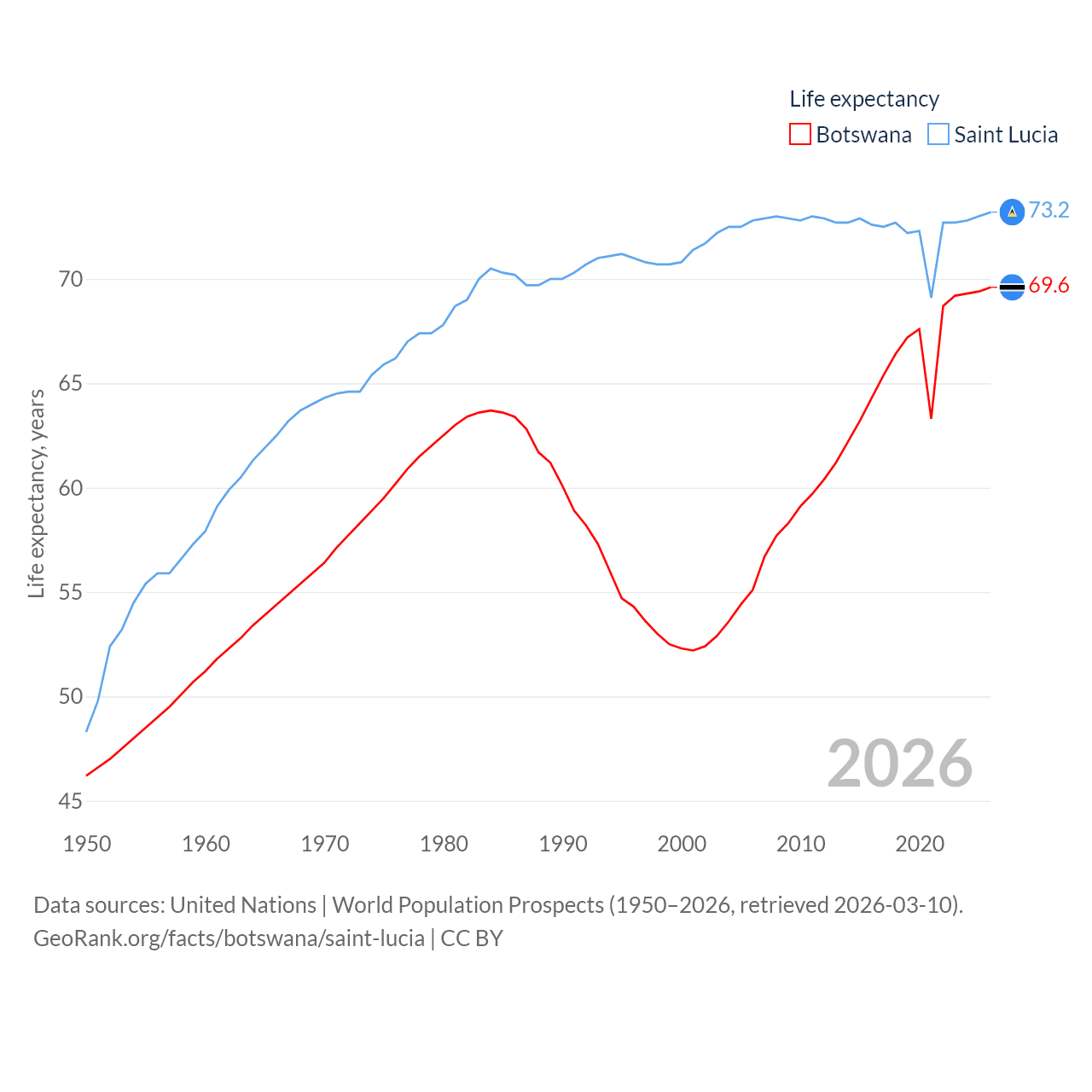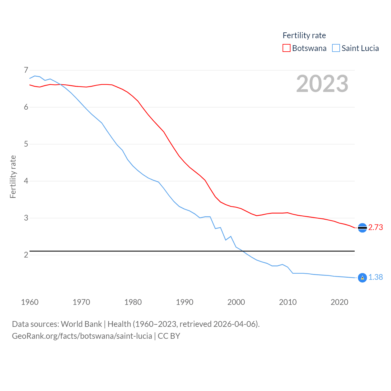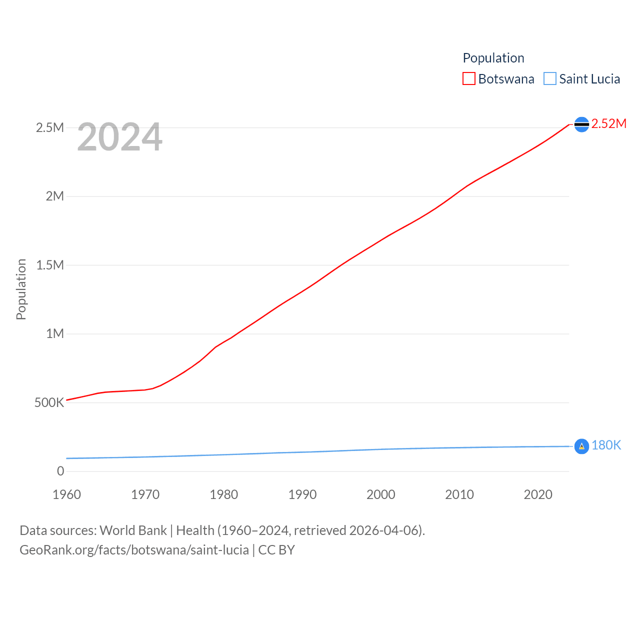 Botswana has a population of 2.52M (ranked 142/197), compared with 180K in Saint Lucia (ranked 178/197). Botswana's land area is 218,816 sq mi versus 235.5 sq mi for Saint Lucia (ranked 47th vs. 178th).