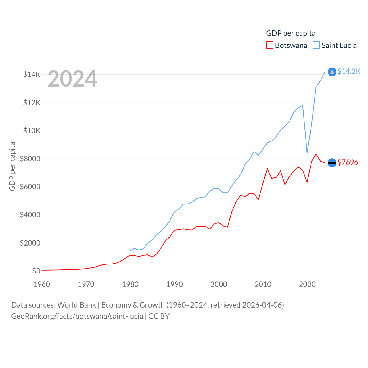 By GDP, Botswana ranks 133/197 ($19.4B) and Saint Lucia ranks 173/197 ($2.55B). By GDP per capita, Botswana ranks 97/197 ($7,696), while Saint Lucia ranks 70/197 ($14,182).