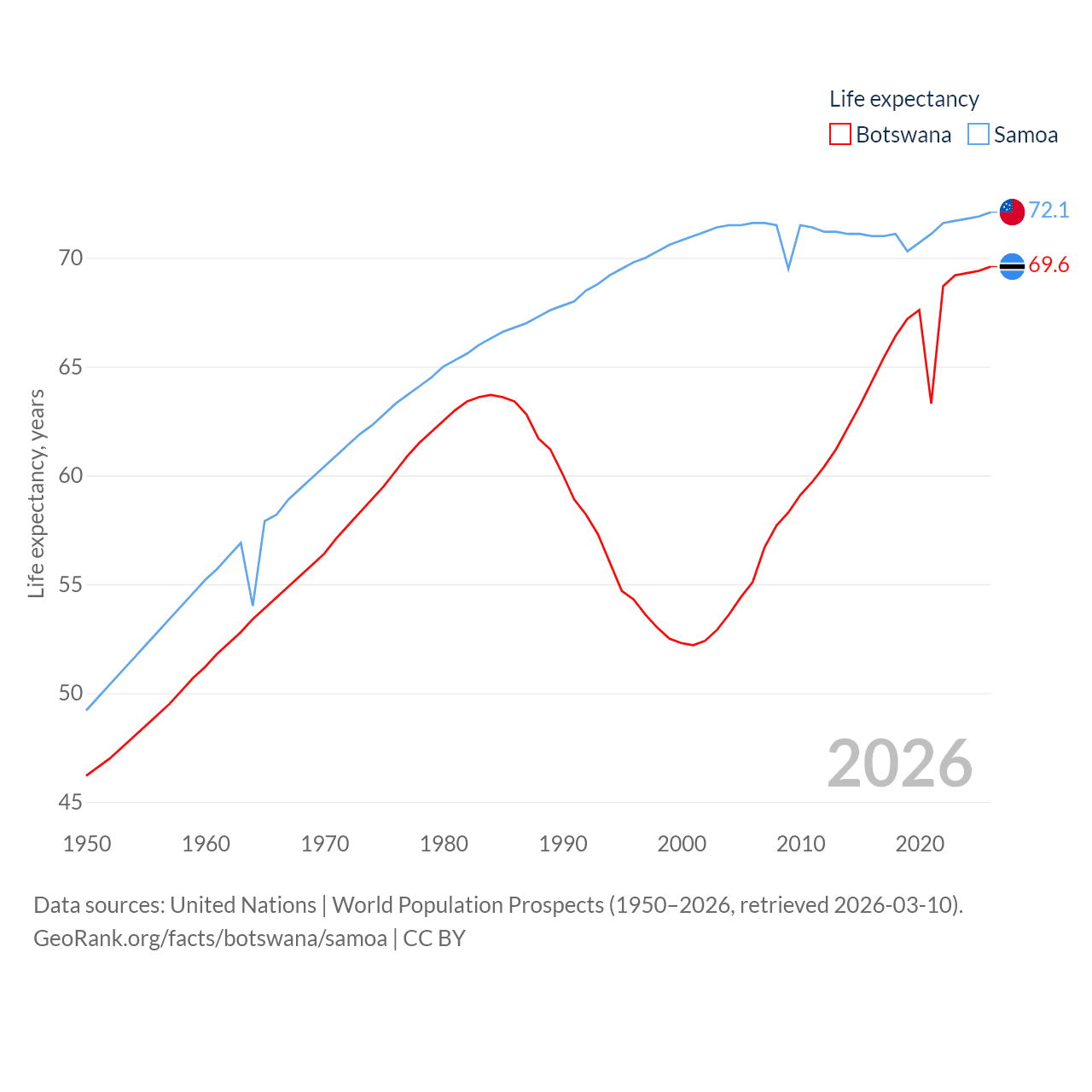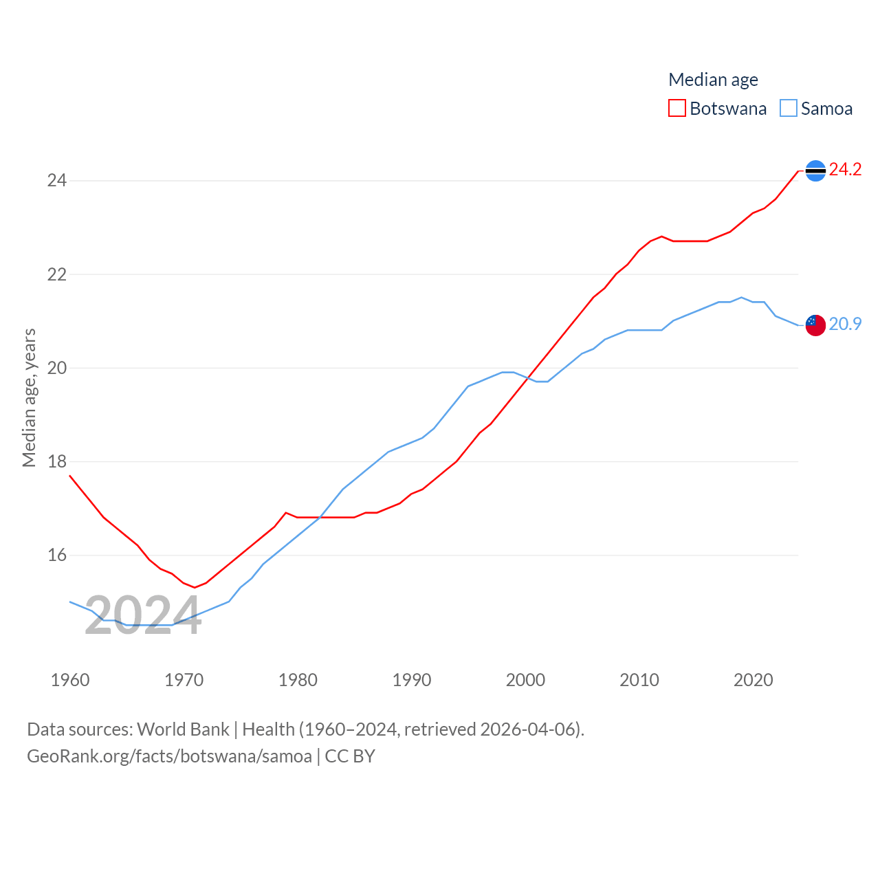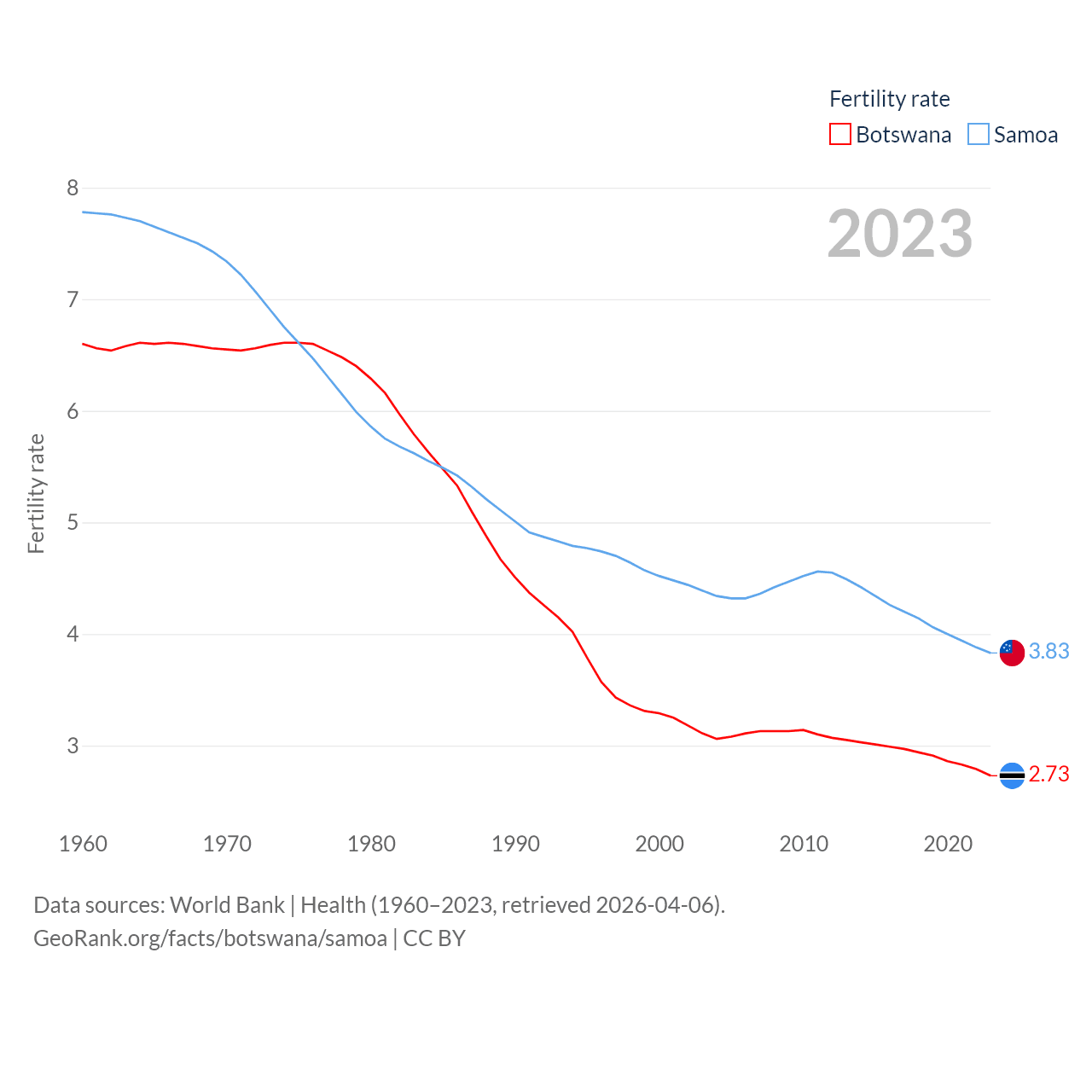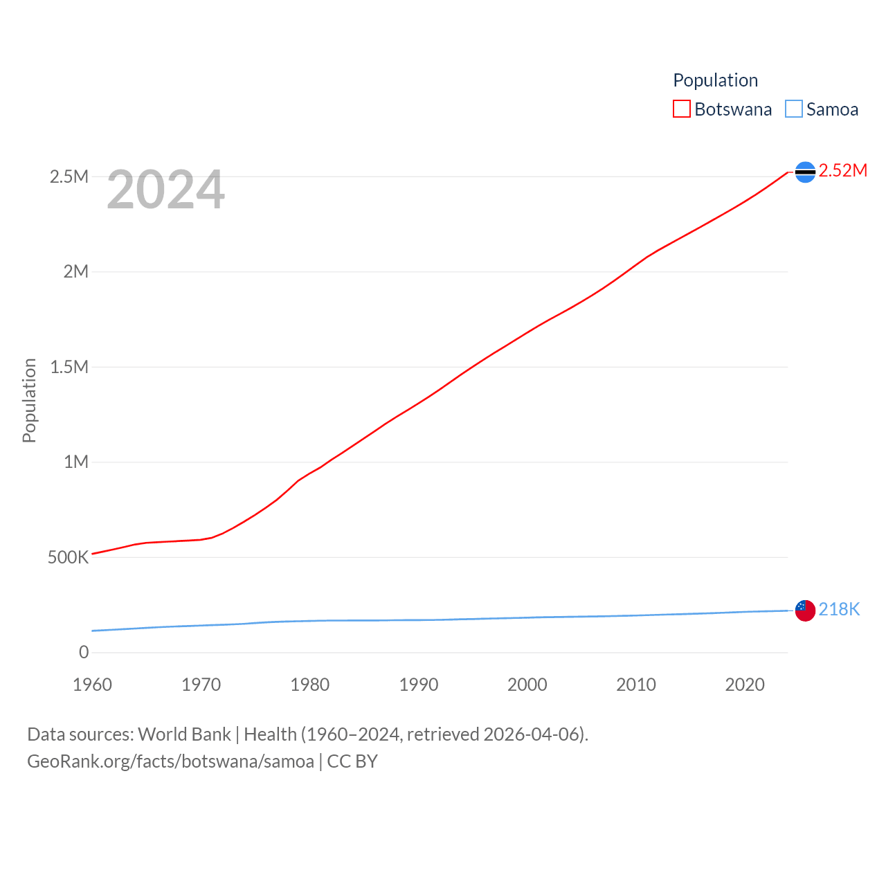 Botswana has a population of 2.52M (ranked 142/197), compared with 218K in Samoa (ranked 177/197). Botswana's land area is 218,816 sq mi versus 1,073 sq mi for Samoa (ranked 47th vs. 168th).
