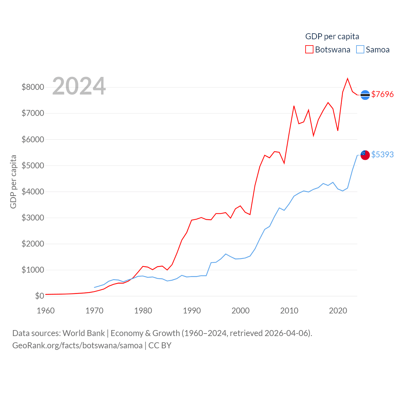 By GDP, Botswana ranks 133/197 ($19.4B) and Samoa ranks 185/197 ($1.18B). By GDP per capita, Botswana ranks 97/197 ($7,696), while Samoa ranks 117/197 ($5,393).