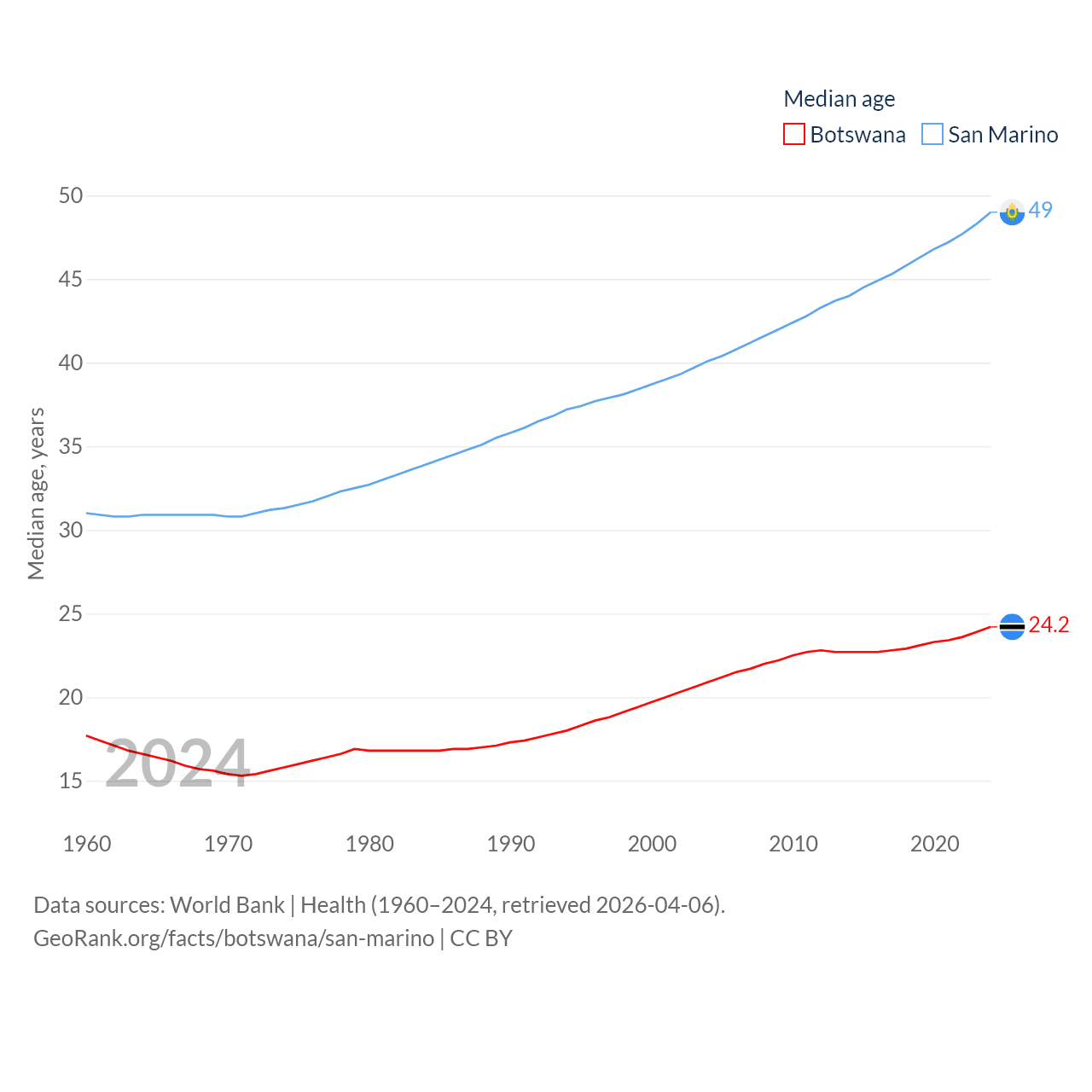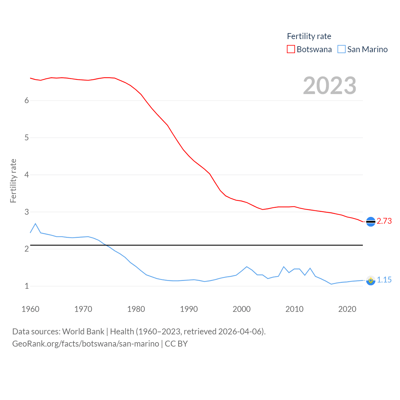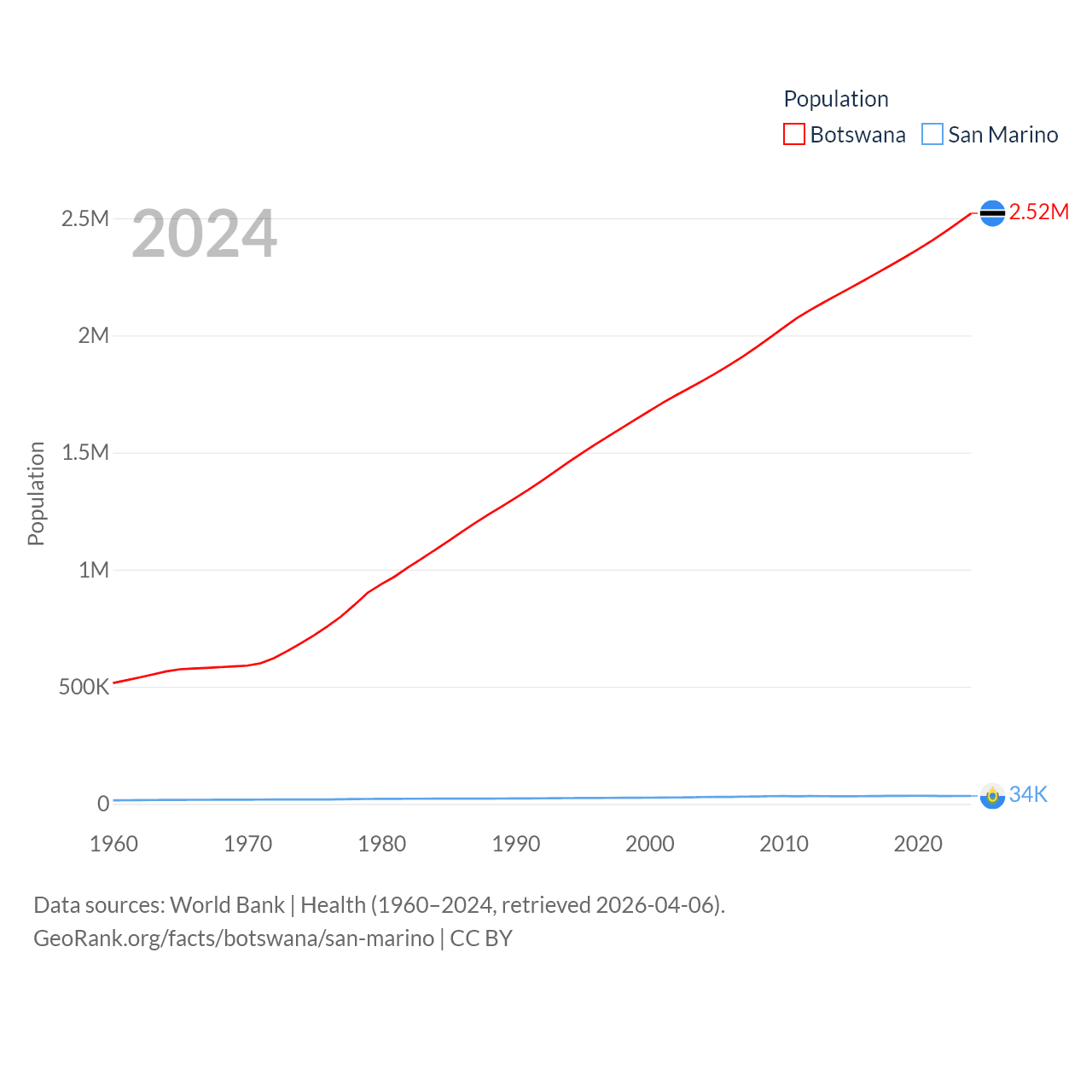 Botswana has a population of 2.52M (ranked 142/197), compared with 34K in San Marino (ranked 193/197). Botswana's land area is 218,816 sq mi versus 23.2 sq mi for San Marino (ranked 47th vs. 193rd).