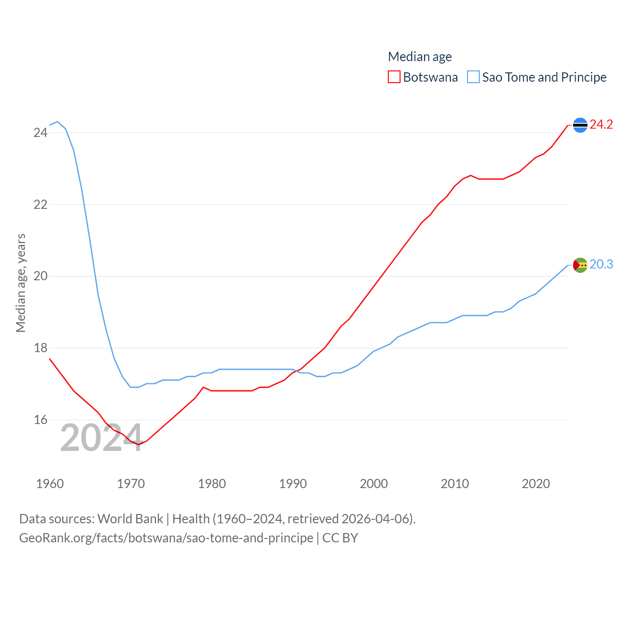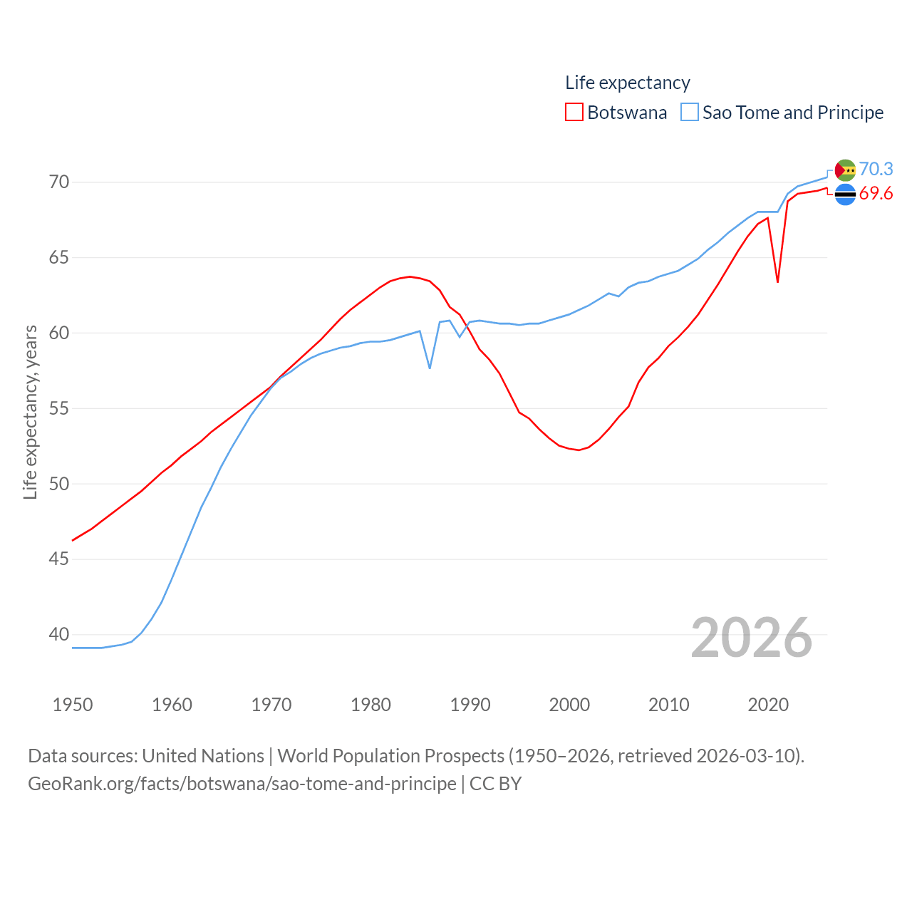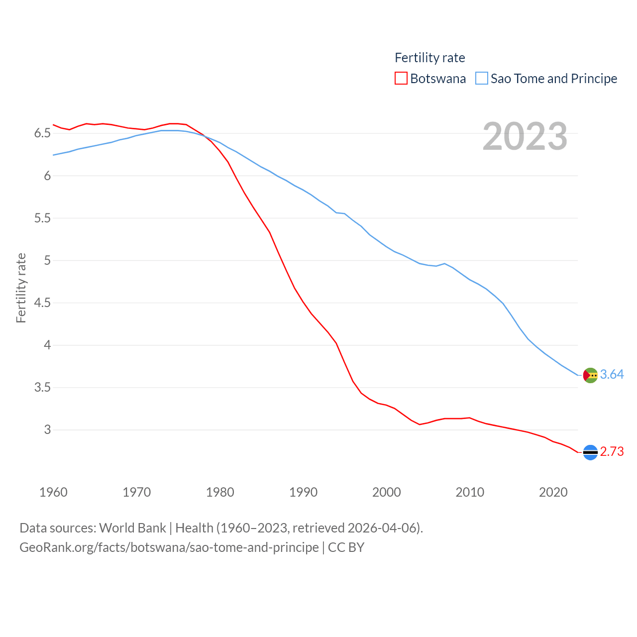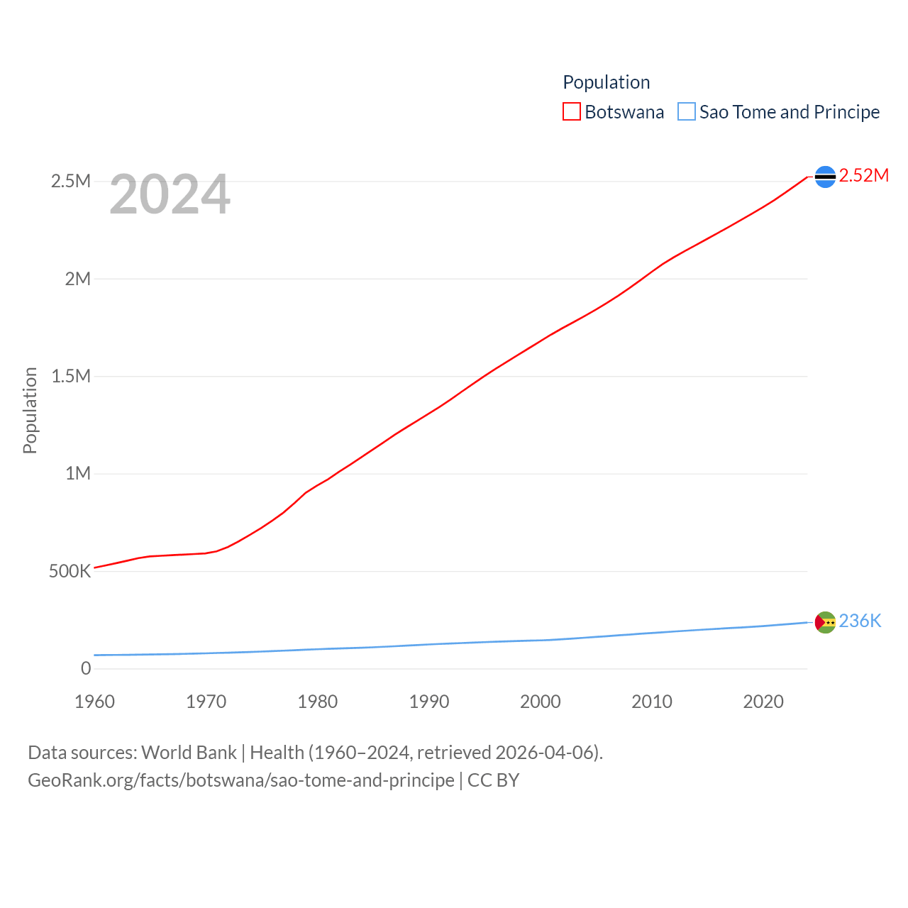 Botswana has a population of 2.52M (ranked 142/197), compared with 236K in Sao Tome and Principe (ranked 176/197). Botswana's land area is 218,816 sq mi versus 371 sq mi for Sao Tome and Principe (ranked 47th vs. 172nd).