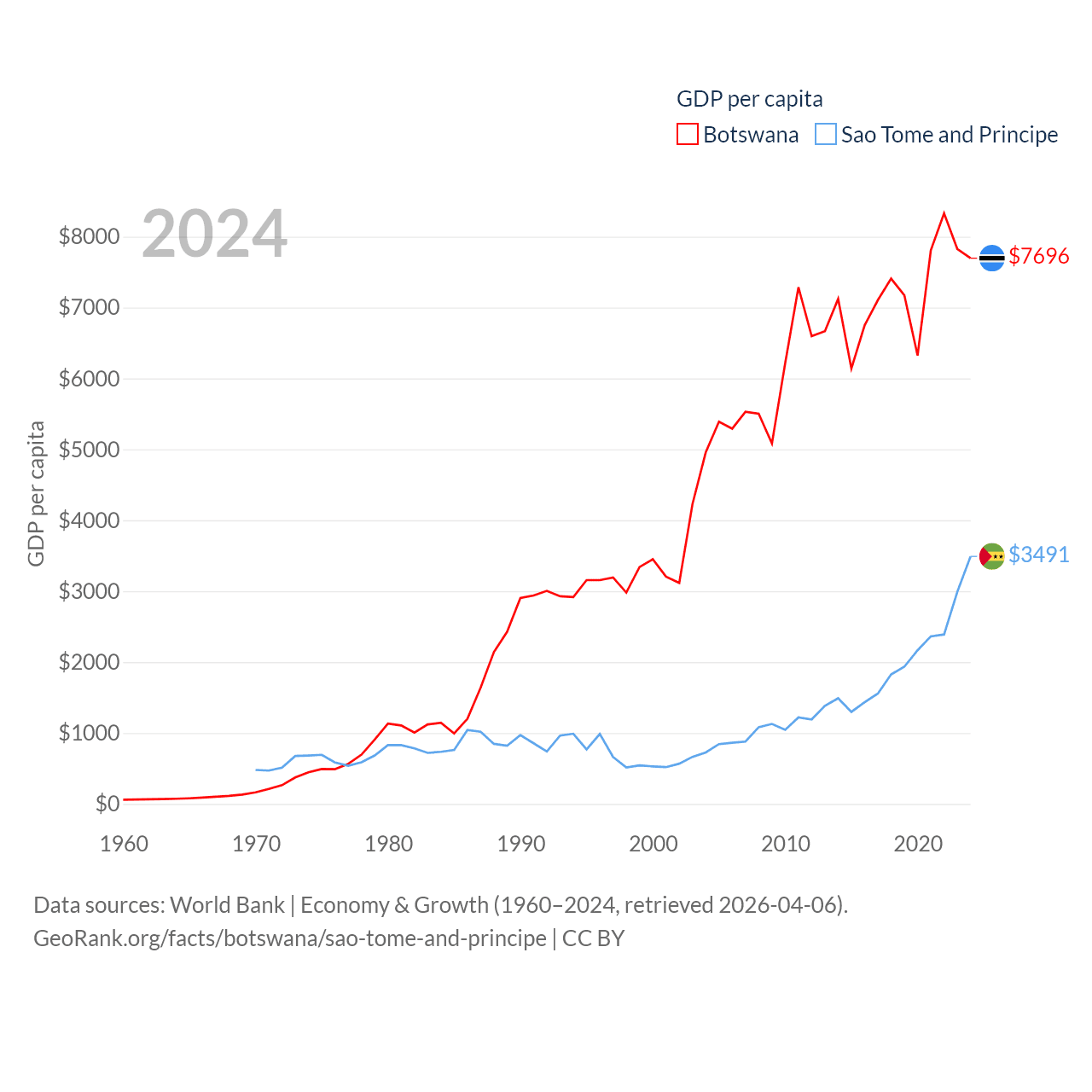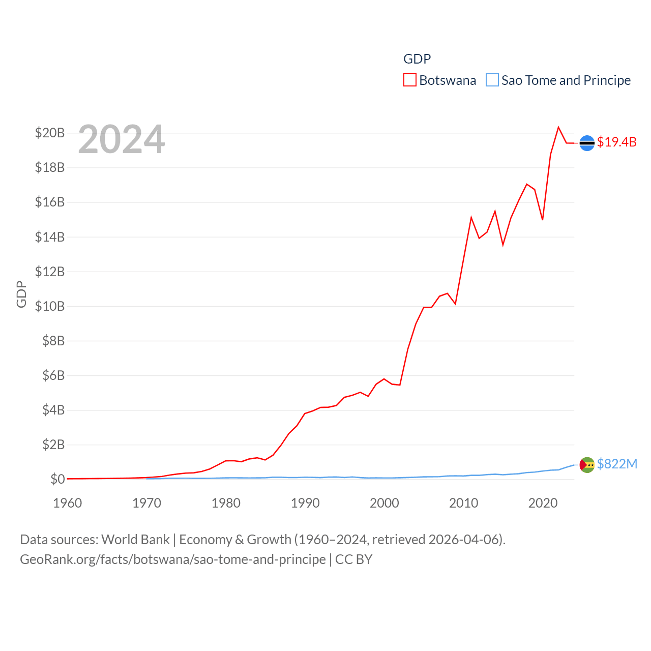 By GDP, Botswana ranks 133/197 ($19.4B) and Sao Tome and Principe ranks 189/197 ($822M). By GDP per capita, Botswana ranks 97/197 ($7,696), while Sao Tome and Principe ranks 134/197 ($3,491).