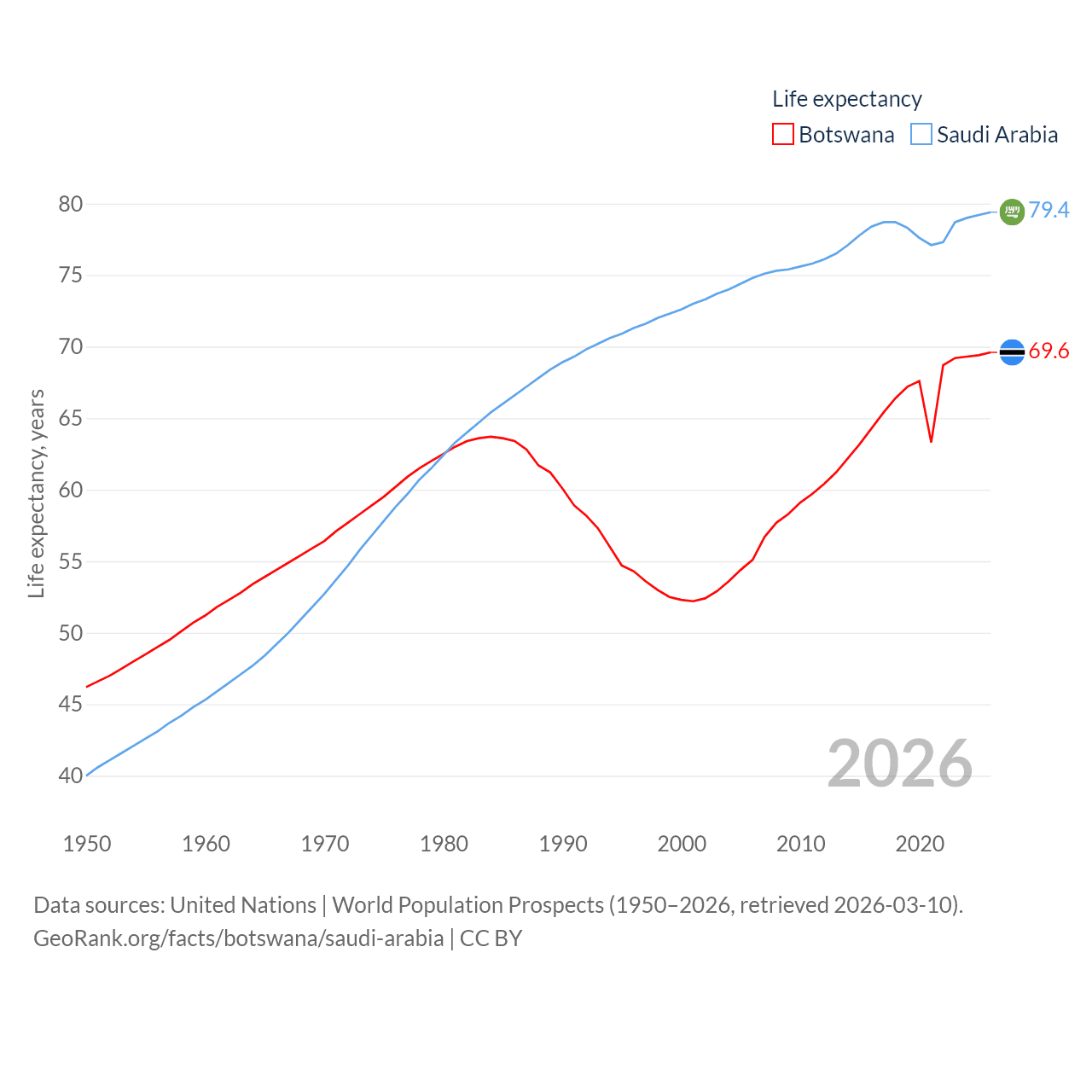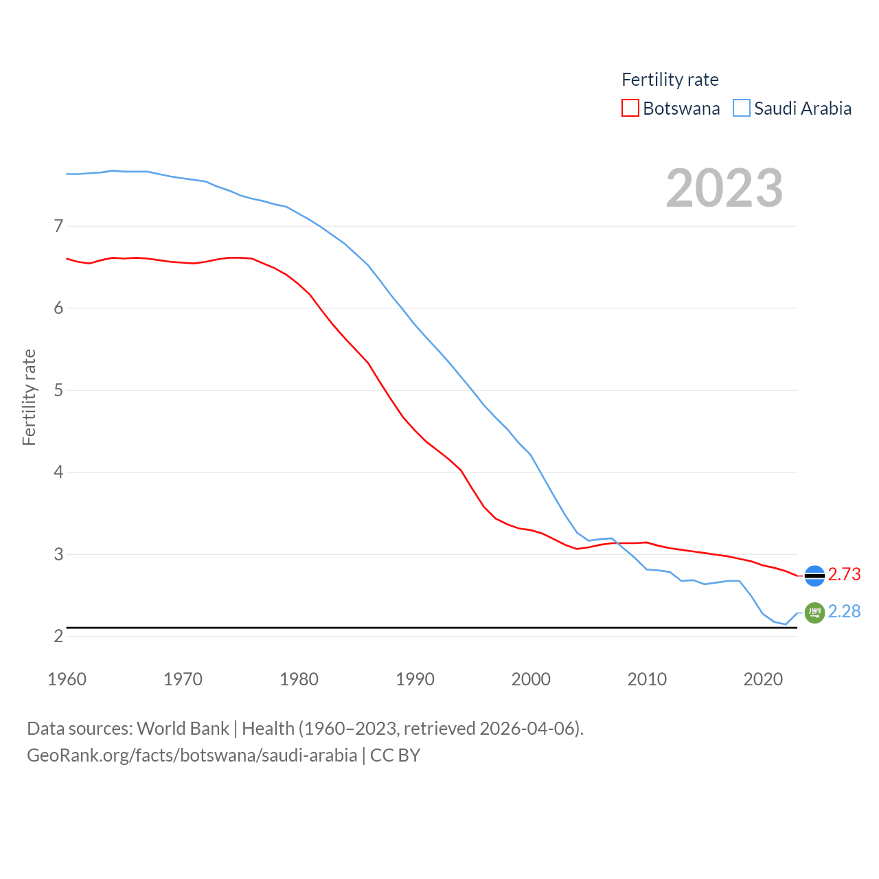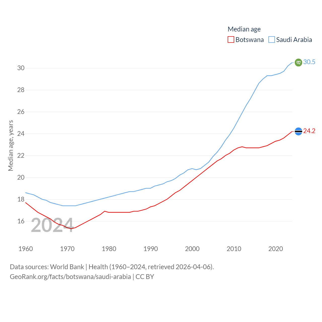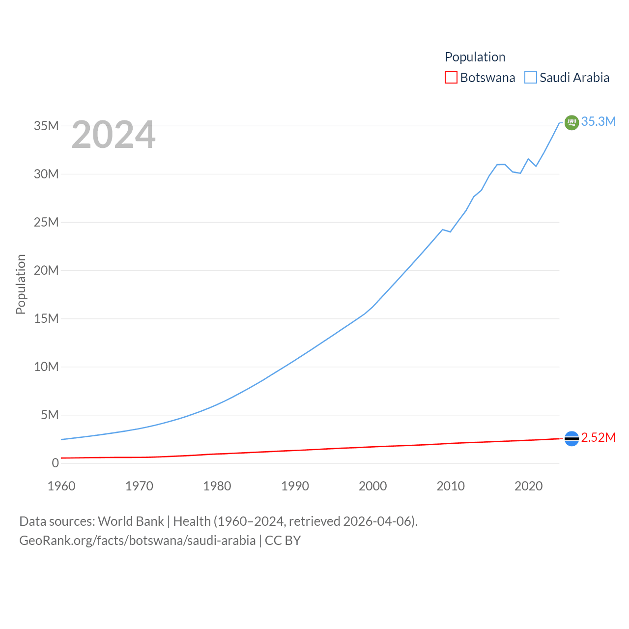 Botswana has a population of 2.52M (ranked 142/197), compared with 35.3M in Saudi Arabia (ranked 45/197). Botswana's land area is 218,816 sq mi versus 830,000 sq mi for Saudi Arabia (ranked 47th vs. 12th).