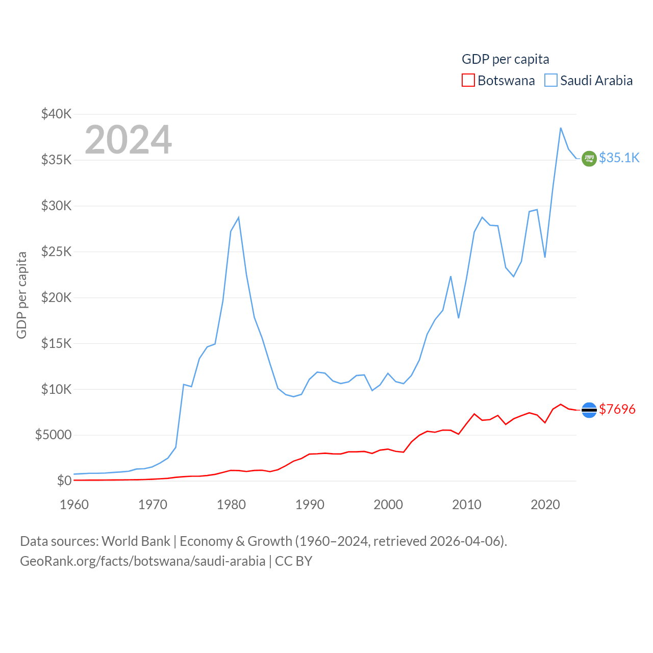 By GDP, Botswana ranks 133/197 ($19.4B) and Saudi Arabia ranks 18/197 ($1.24T). By GDP per capita, Botswana ranks 97/197 ($7,696), while Saudi Arabia ranks 33/197 ($35,122).