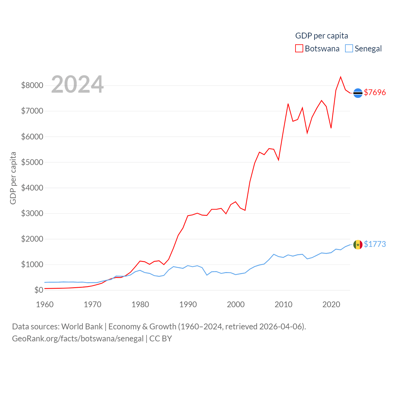 By GDP, Botswana ranks 133/197 ($19.4B) and Senegal ranks 109/197 ($32.8B). By GDP per capita, Botswana ranks 97/197 ($7,696), while Senegal ranks 159/197 ($1,773).