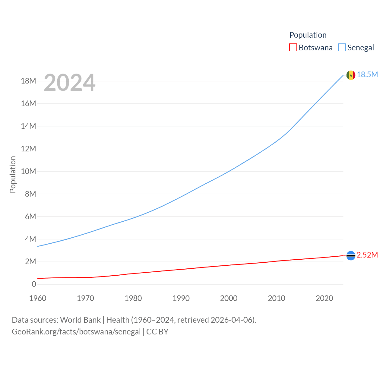 Botswana has a population of 2.52M (ranked 142/197), compared with 18.5M in Senegal (ranked 69/197). Botswana's land area is 218,816 sq mi versus 74,336 sq mi for Senegal (ranked 47th vs. 85th).