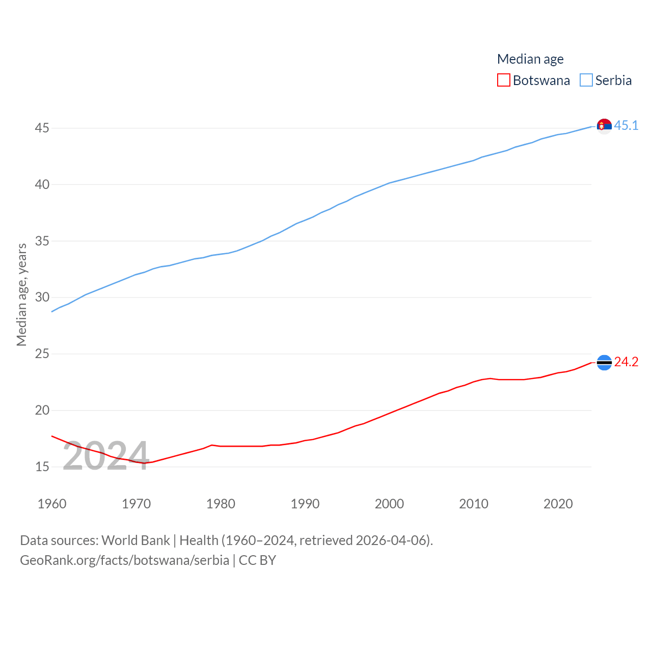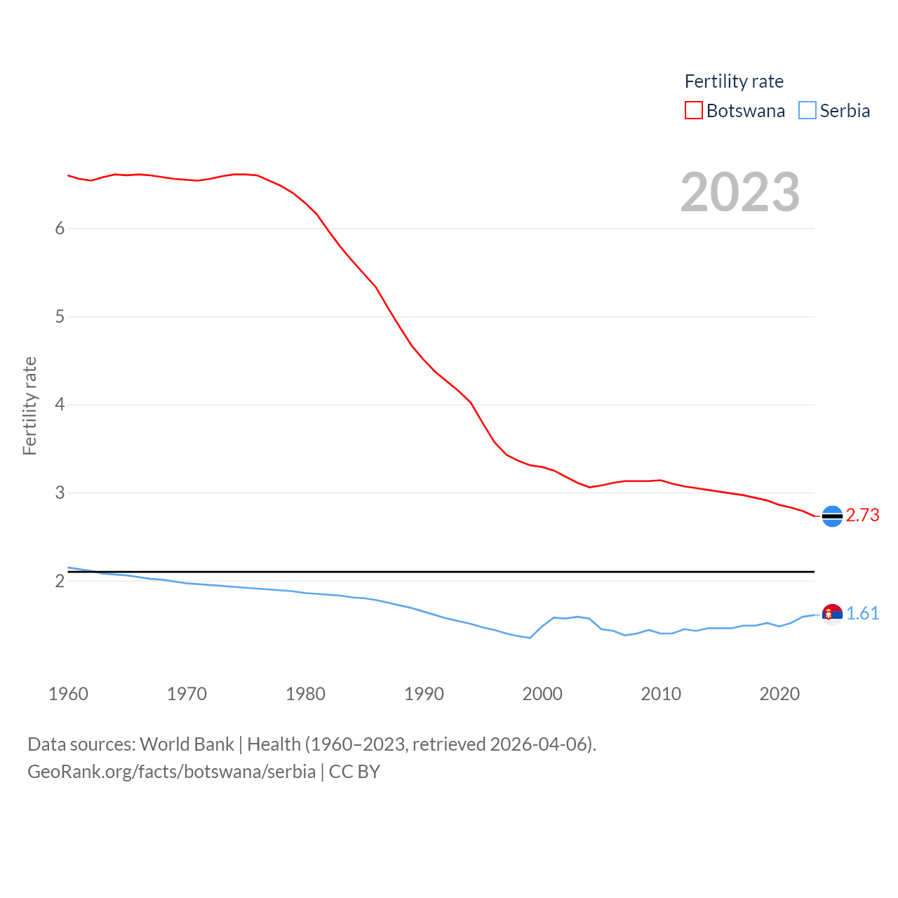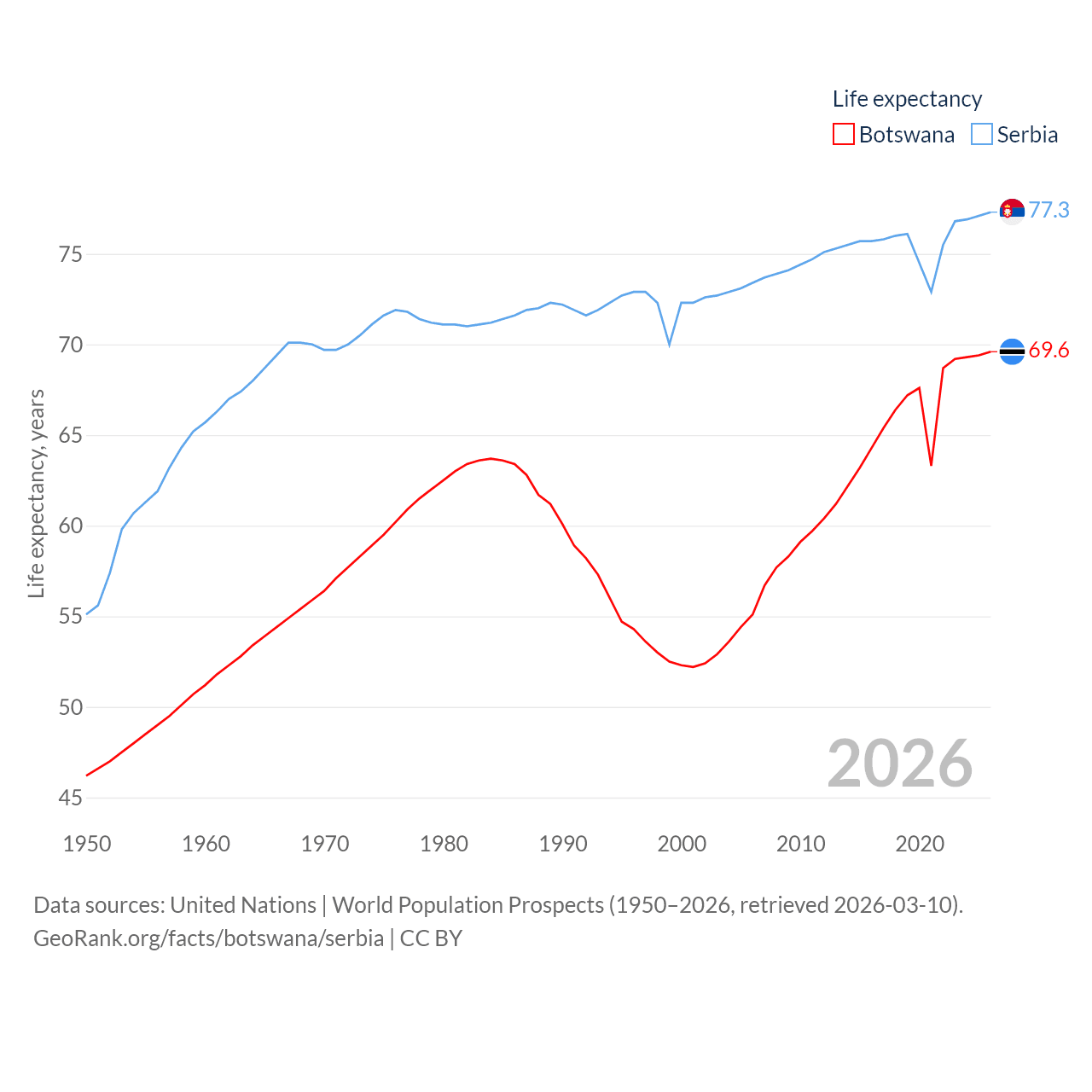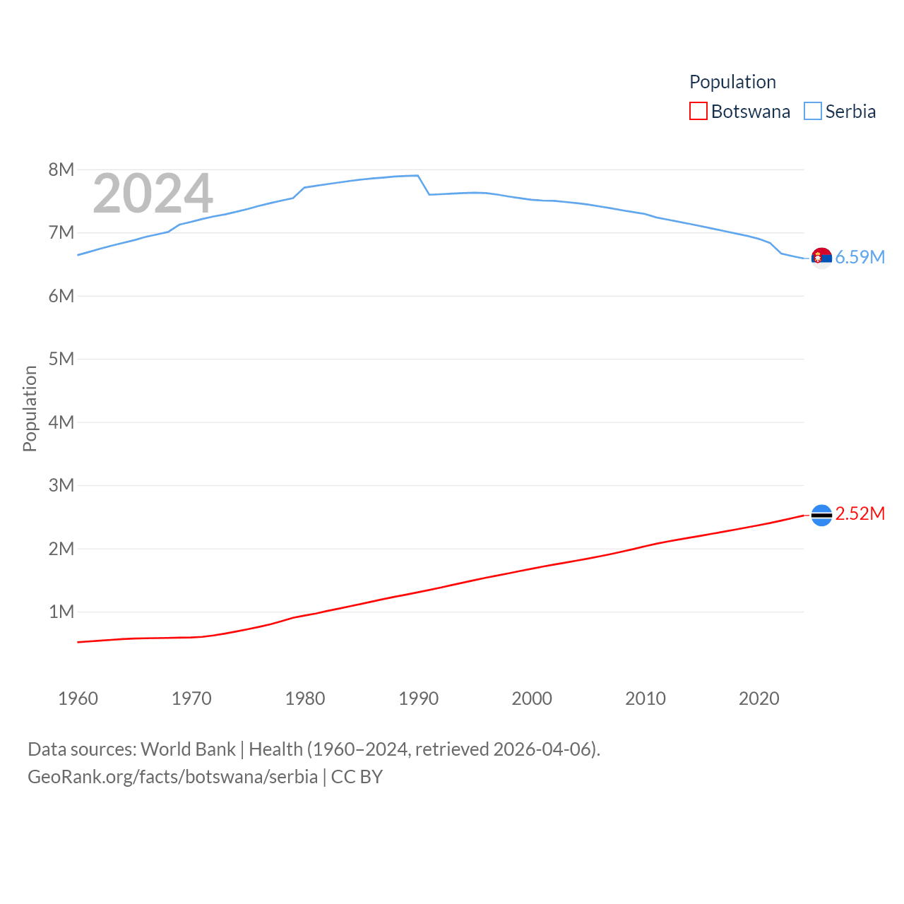 Botswana has a population of 2.52M (ranked 142/197), compared with 6.59M in Serbia (ranked 109/197). Botswana's land area is 218,816 sq mi versus 32,467 sq mi for Serbia (ranked 47th vs. 111th).