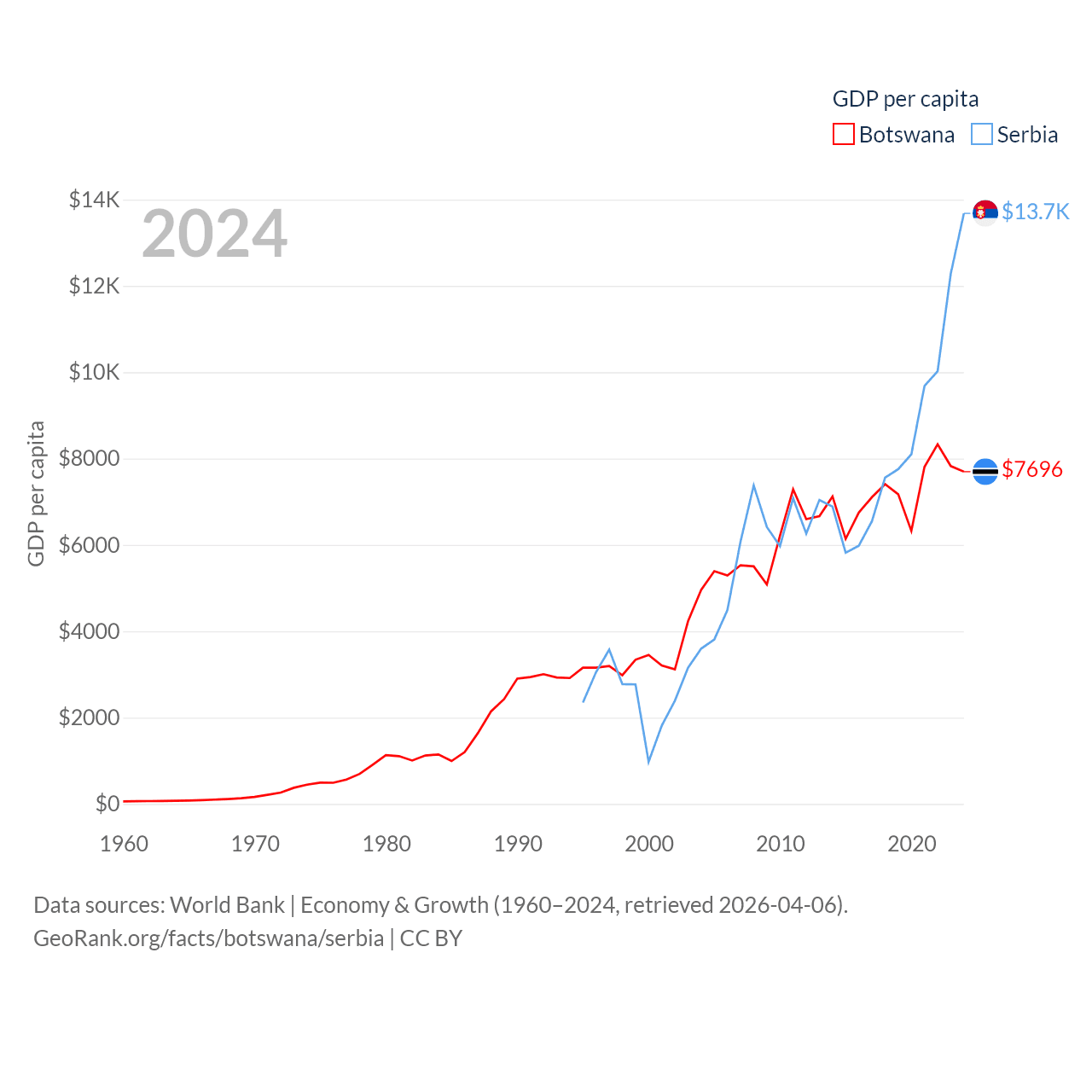 By GDP, Botswana ranks 133/197 ($19.4B) and Serbia ranks 76/197 ($90.1B). By GDP per capita, Botswana ranks 97/197 ($7,696), while Serbia ranks 73/197 ($13,679).