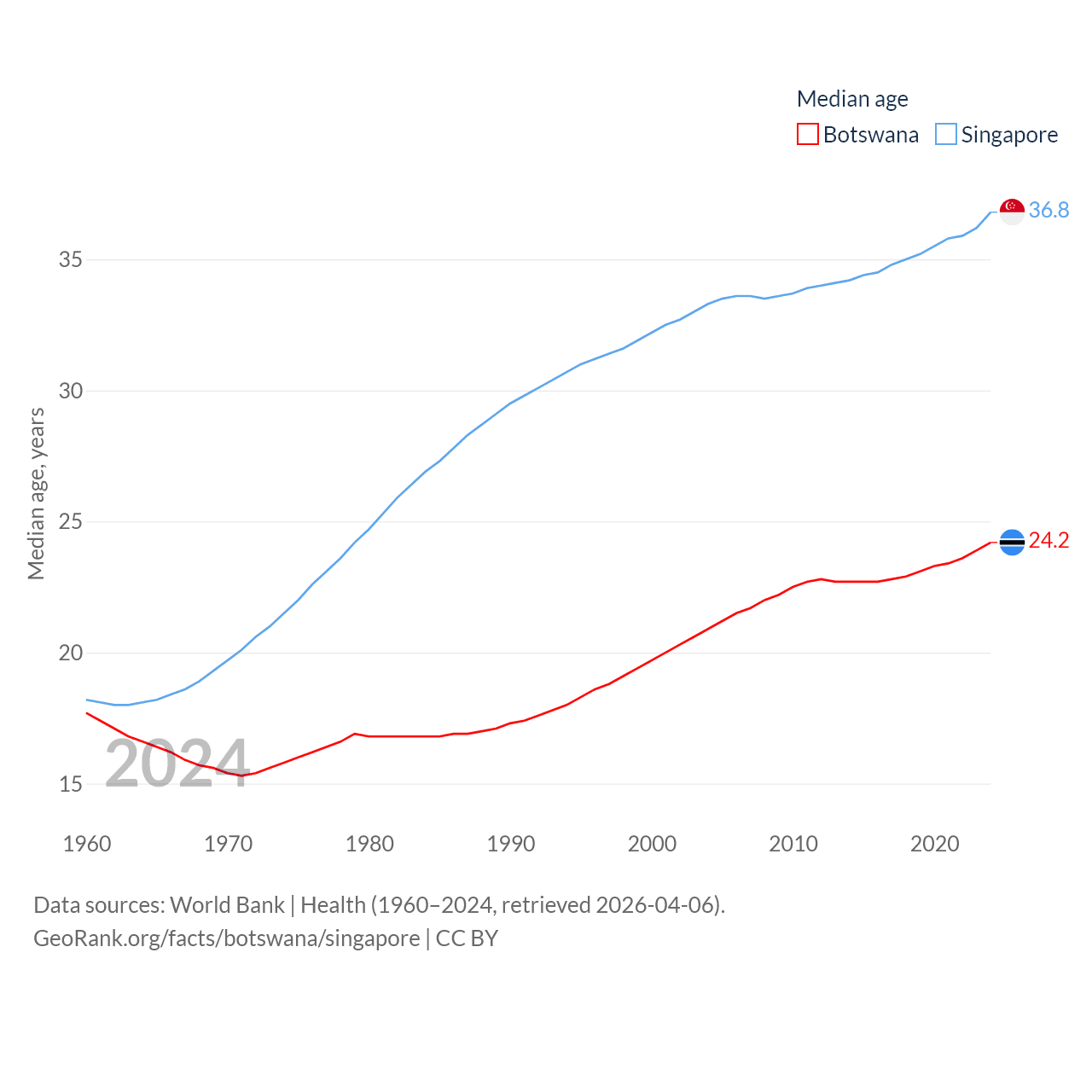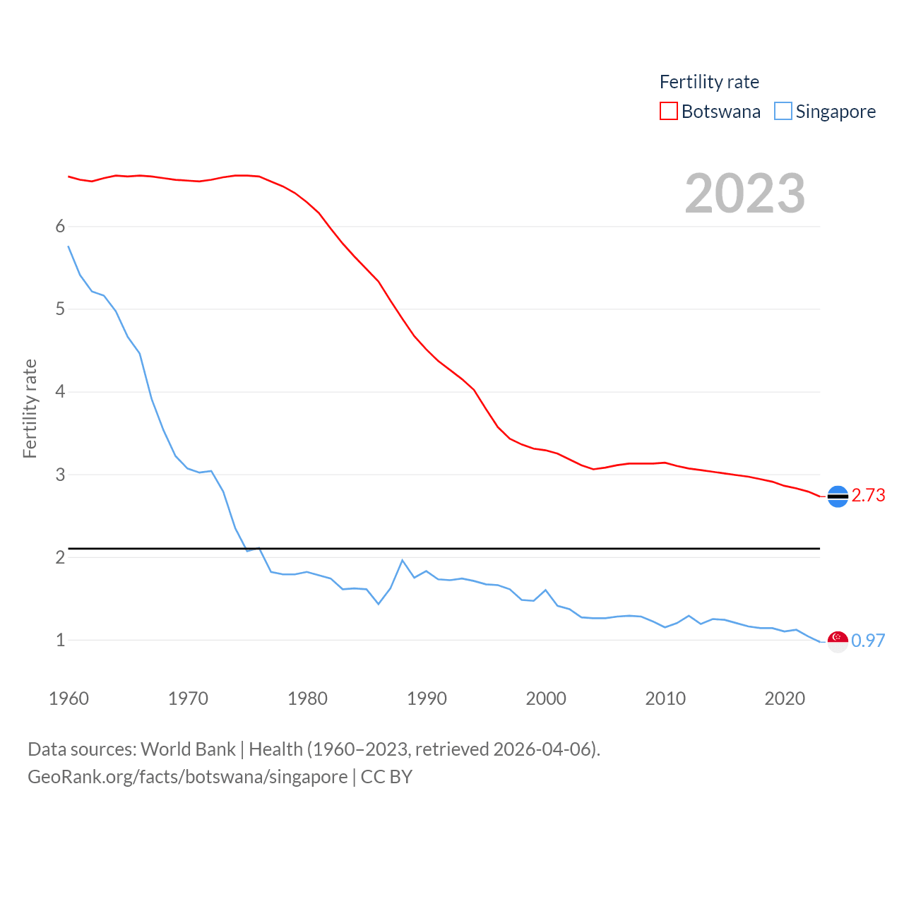 Botswana has a population of 2.52M (ranked 142/197), compared with 6.04M in Singapore (ranked 113/197). Botswana's land area is 218,816 sq mi versus 277.2 sq mi for Singapore (ranked 47th vs. 177th).