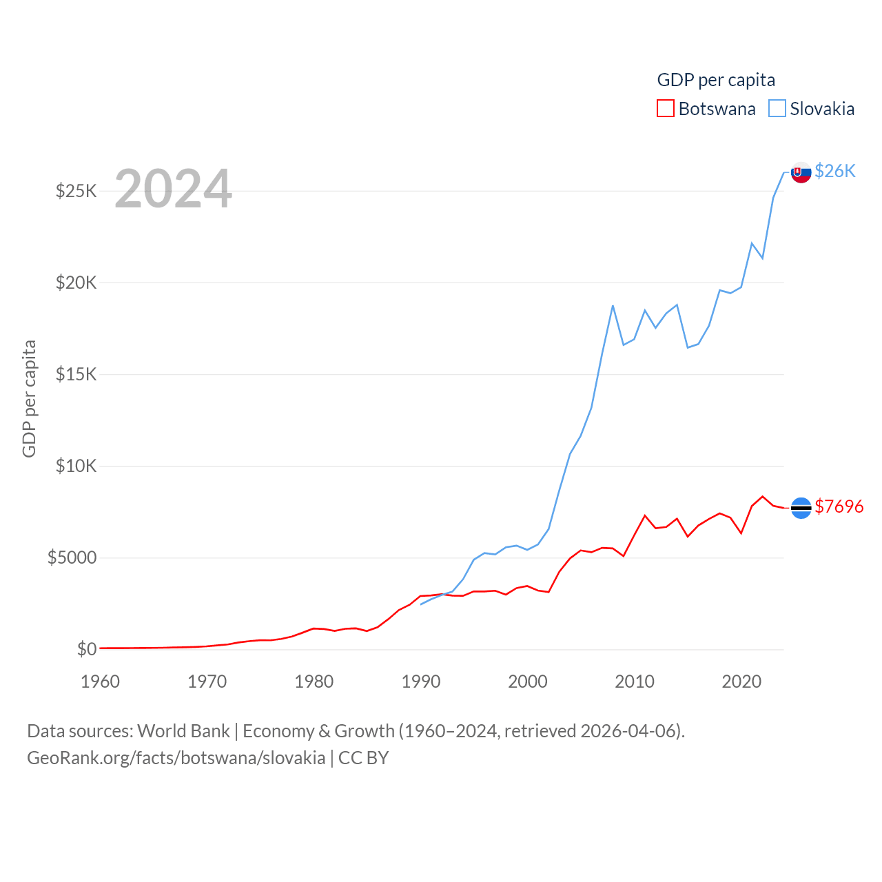 By GDP, Botswana ranks 133/197 ($19.4B) and Slovakia ranks 61/197 ($141B). By GDP per capita, Botswana ranks 97/197 ($7,696), while Slovakia ranks 47/197 ($25,993).