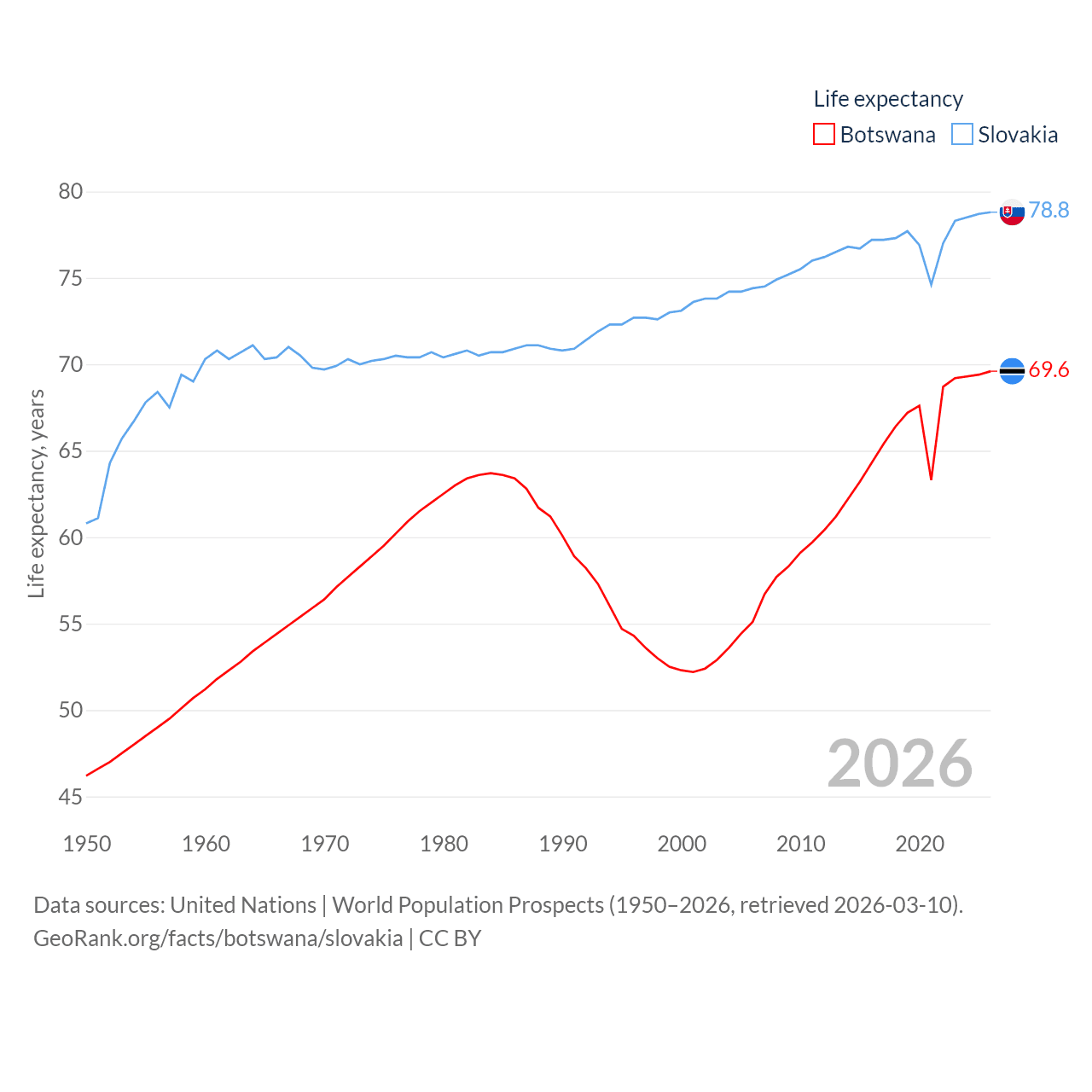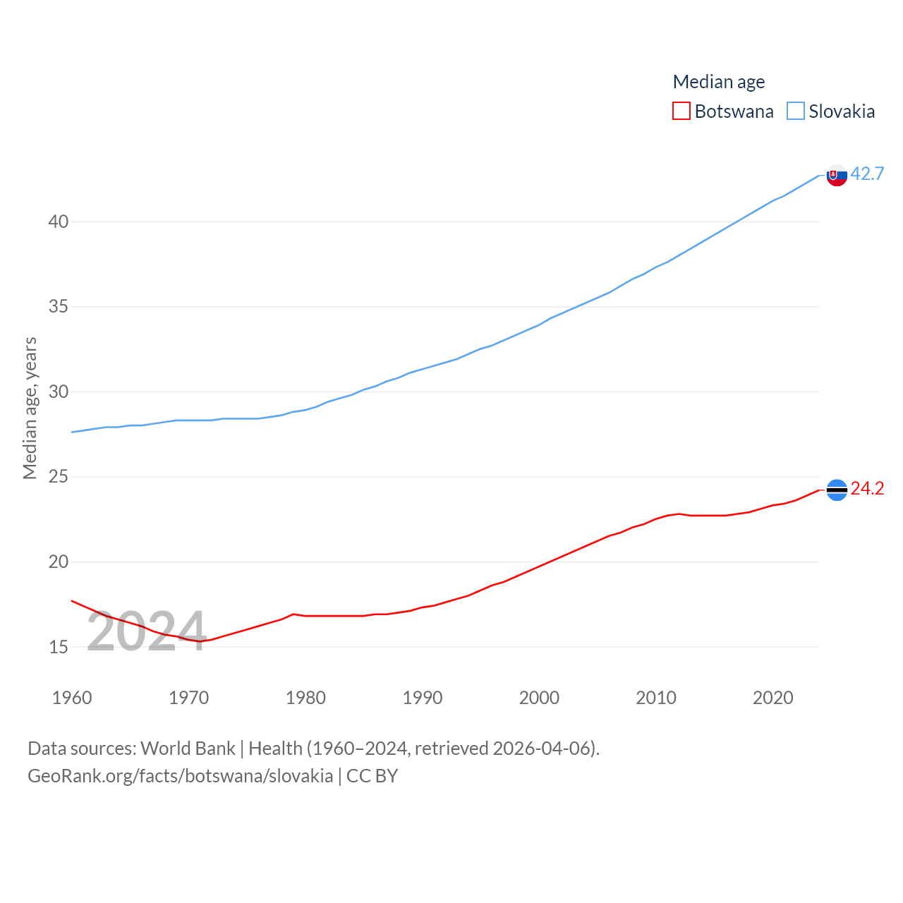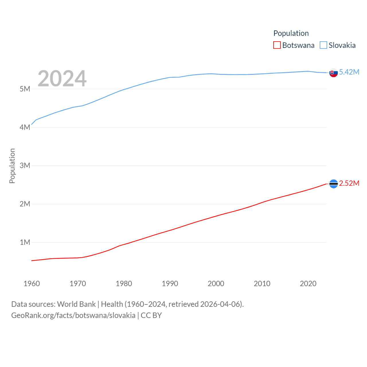 Botswana has a population of 2.52M (ranked 142/197), compared with 5.42M in Slovakia (ranked 119/197). Botswana's land area is 218,816 sq mi versus 18,564 sq mi for Slovakia (ranked 47th vs. 128th).