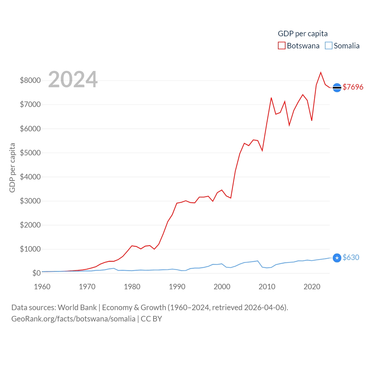 By GDP, Botswana ranks 133/197 ($19.4B) and Somalia ranks 150/197 ($12B). By GDP per capita, Botswana ranks 97/197 ($7,696), while Somalia ranks 192/197 ($630).