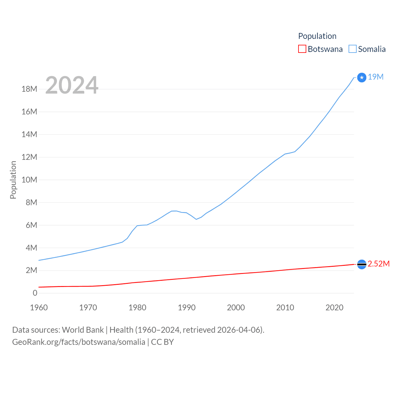 Botswana has a population of 2.52M (ranked 142/197), compared with 19M in Somalia (ranked 68/197). Botswana's land area is 218,816 sq mi versus 242,217 sq mi for Somalia (ranked 47th vs. 42nd).