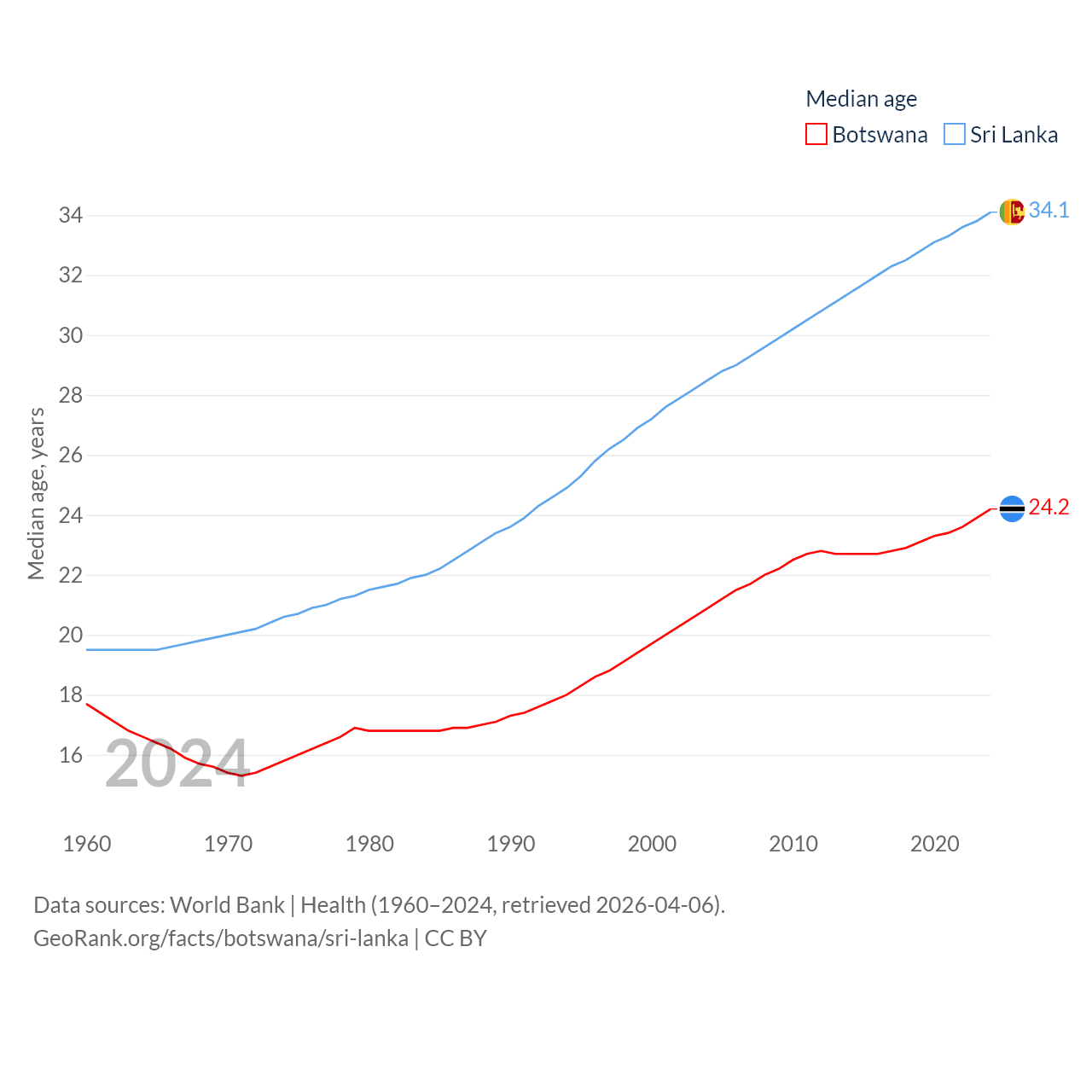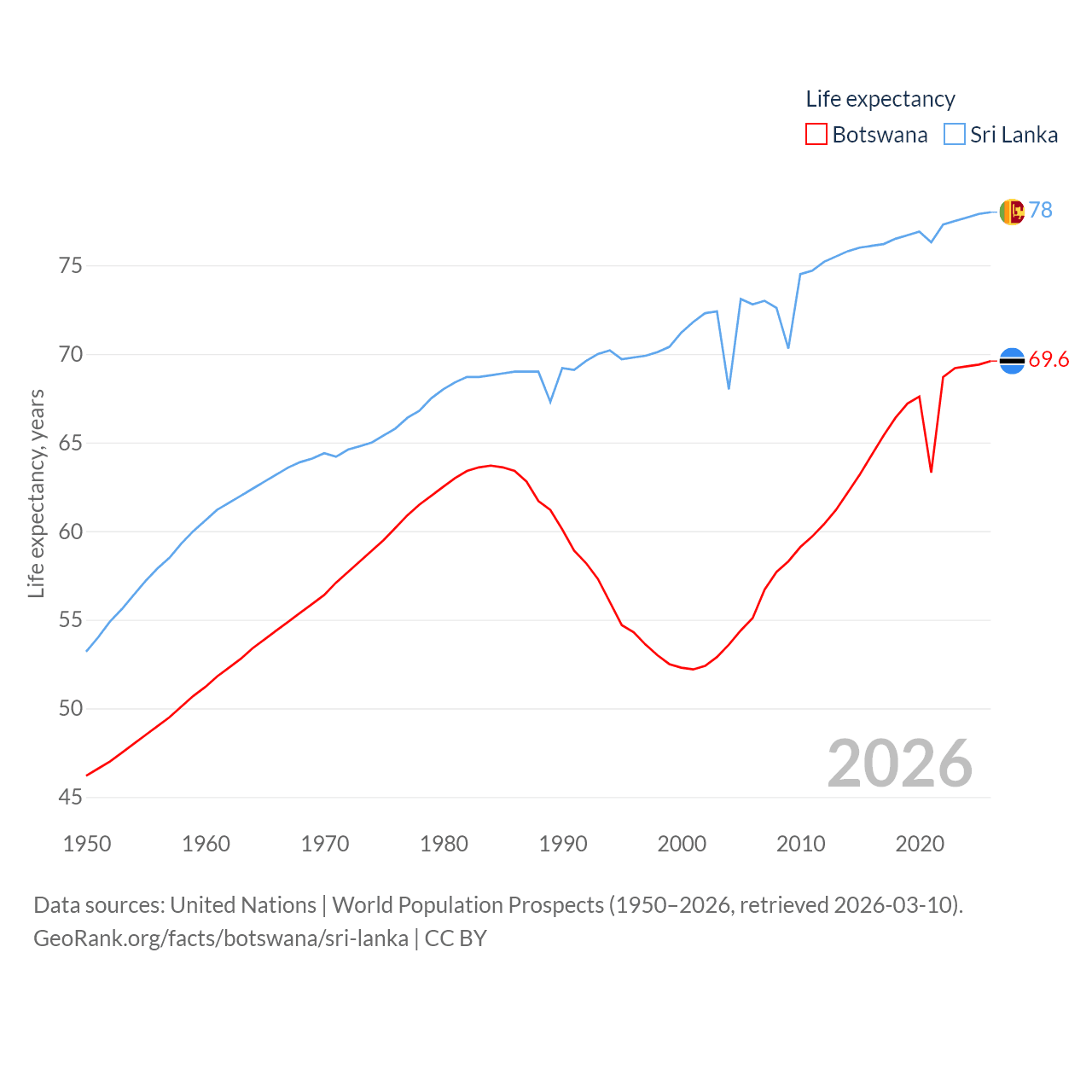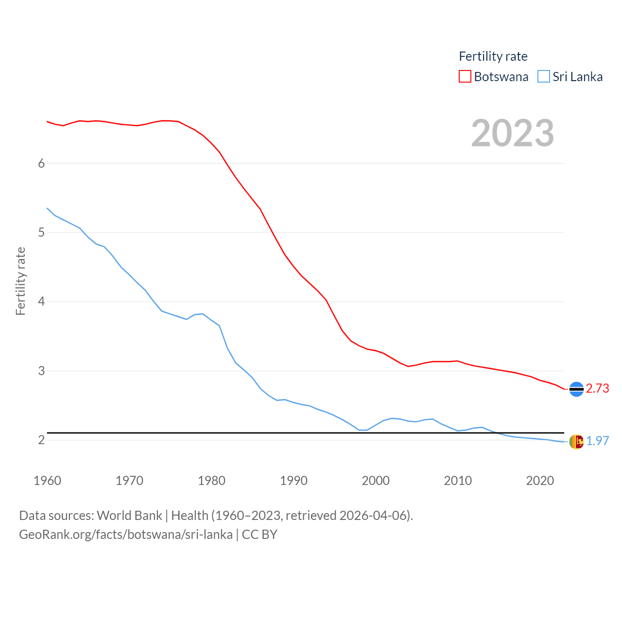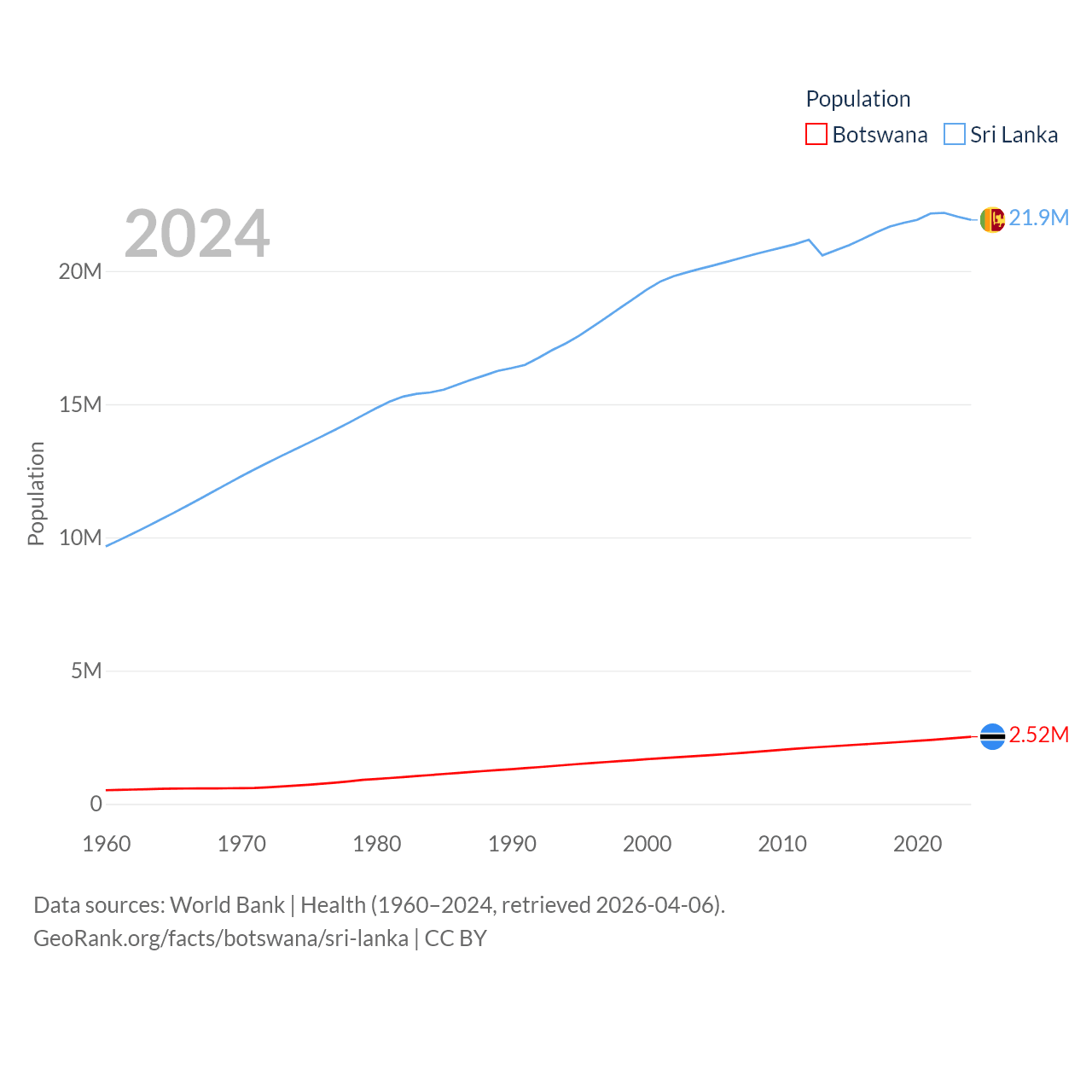 Botswana has a population of 2.52M (ranked 142/197), compared with 21.9M in Sri Lanka (ranked 61/197). Botswana's land area is 218,816 sq mi versus 23,884 sq mi for Sri Lanka (ranked 47th vs. 122nd).