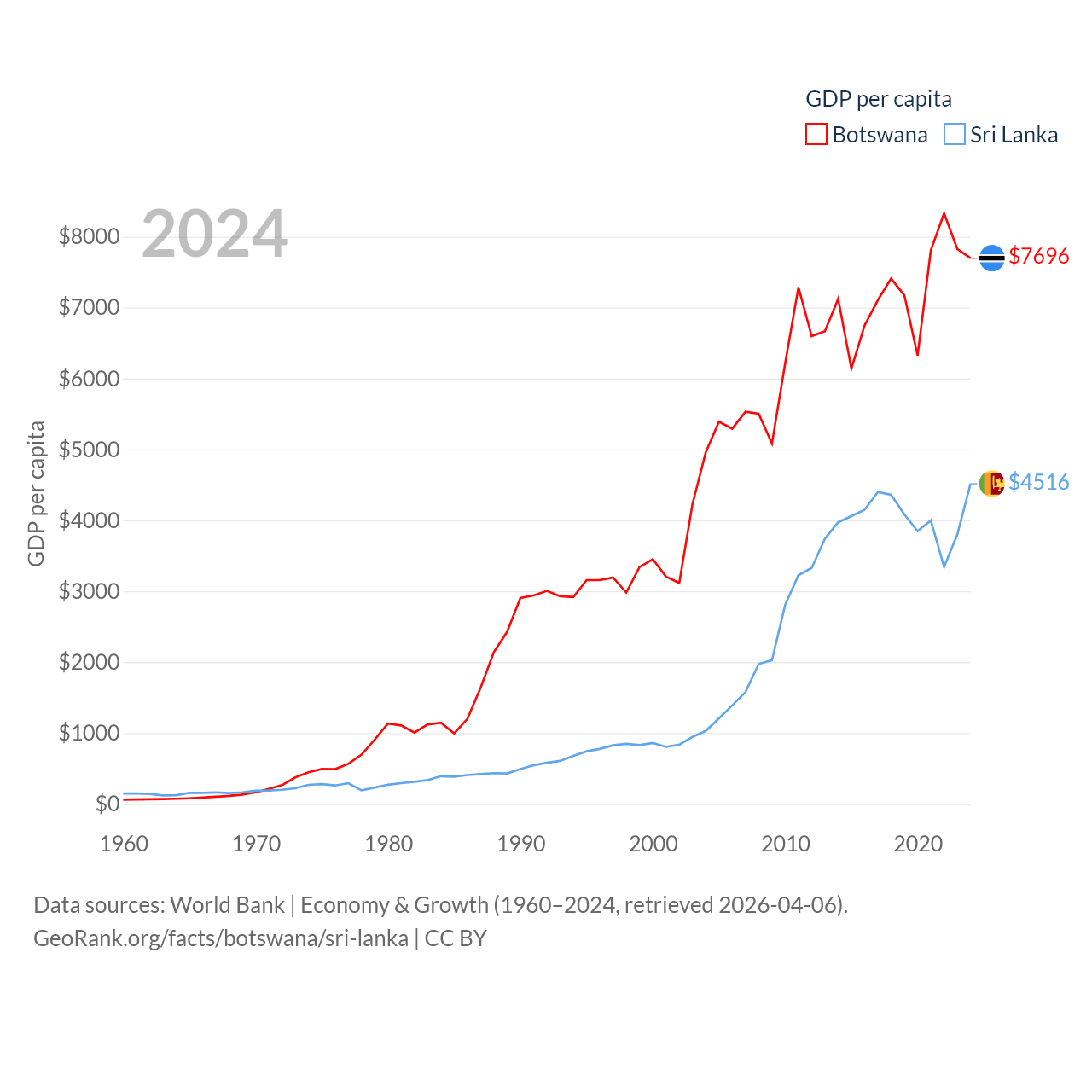 By GDP, Botswana ranks 133/197 ($19.4B) and Sri Lanka ranks 72/197 ($99B). By GDP per capita, Botswana ranks 97/197 ($7,696), while Sri Lanka ranks 124/197 ($4,516).