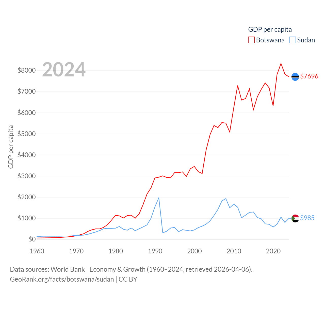 By GDP, Botswana ranks 133/197 ($19.4B) and Sudan ranks 94/197 ($49.7B). By GDP per capita, Botswana ranks 97/197 ($7,696), while Sudan ranks 179/197 ($985).