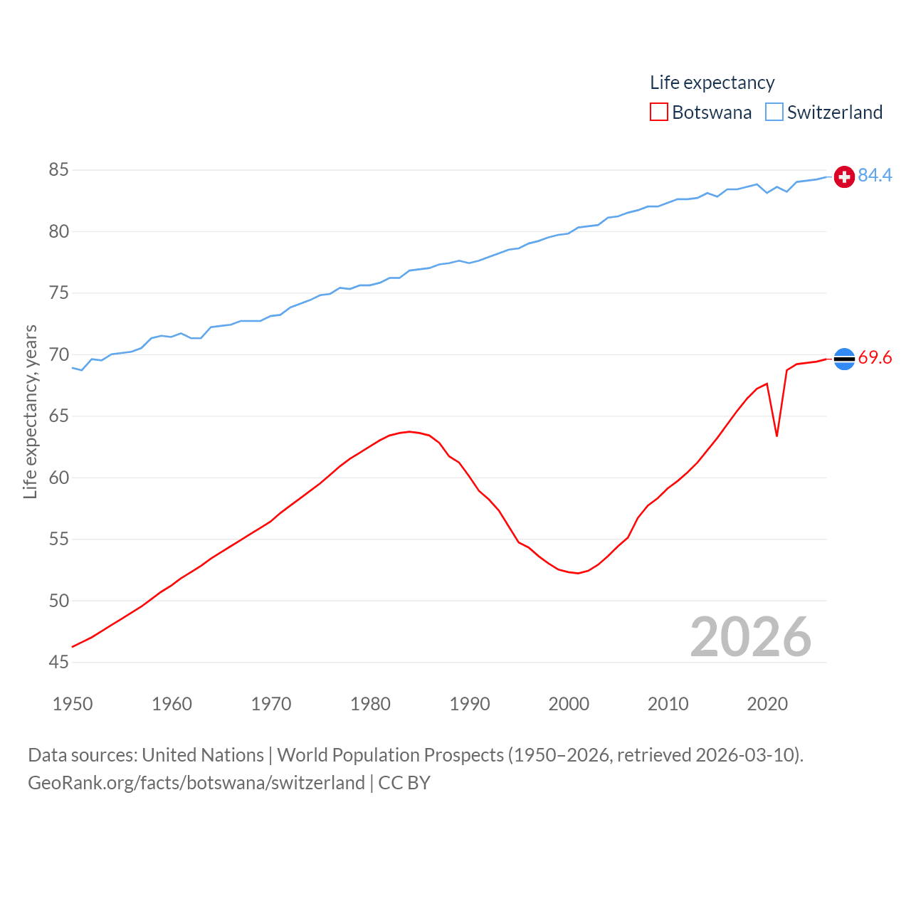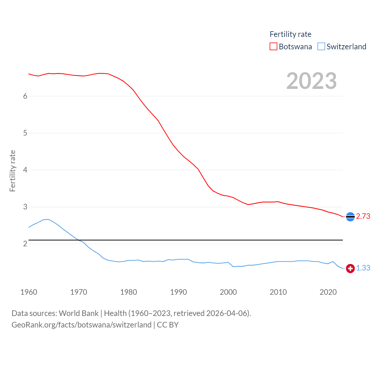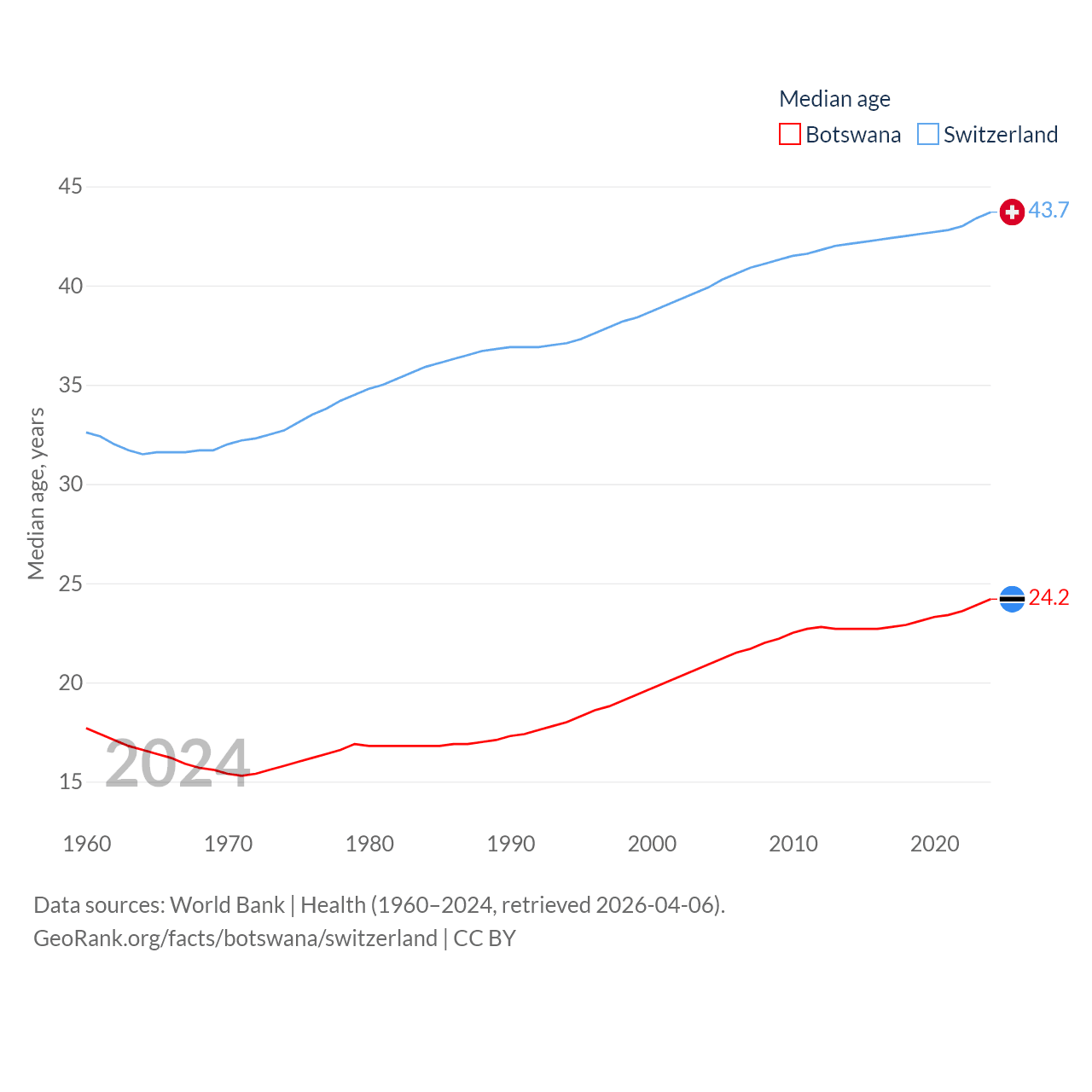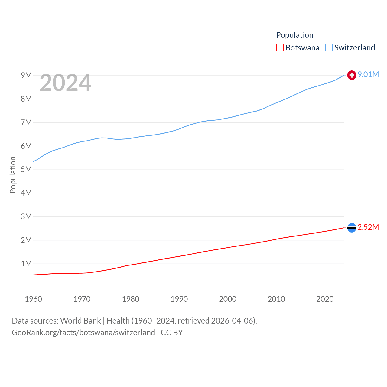 Botswana has a population of 2.52M (ranked 142/197), compared with 9.01M in Switzerland (ranked 101/197). Botswana's land area is 218,816 sq mi versus 15,255 sq mi for Switzerland (ranked 47th vs. 131st).