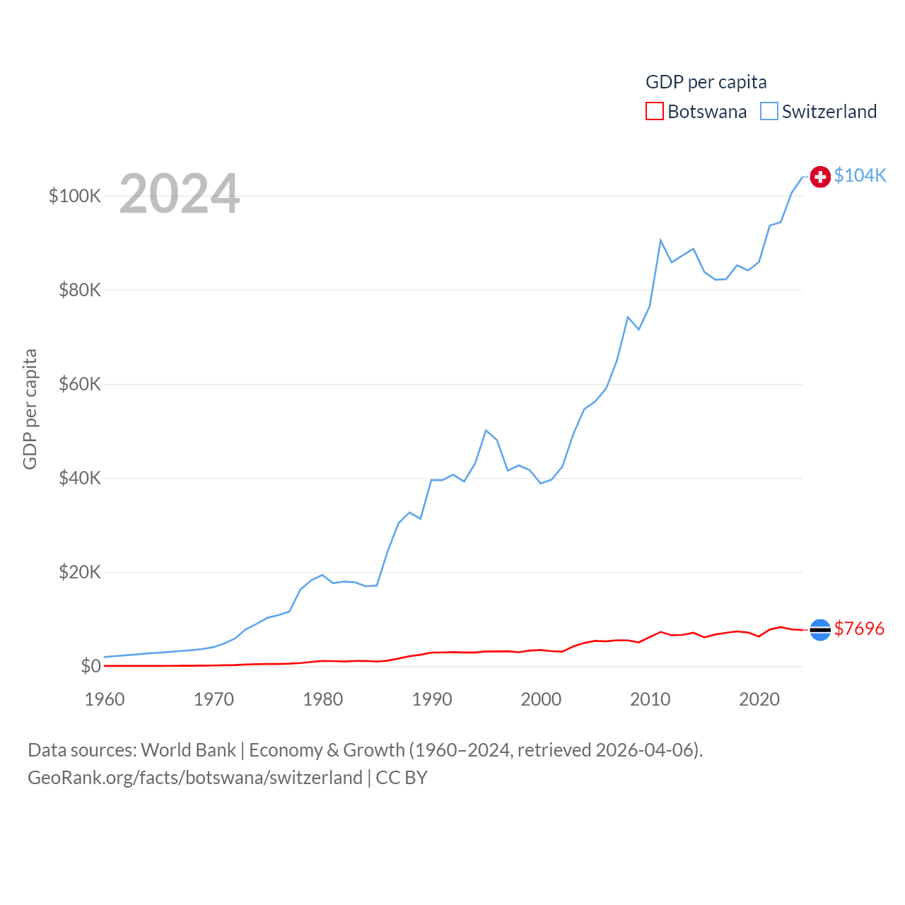 By GDP, Botswana ranks 133/197 ($19.4B) and Switzerland ranks 20/197 ($937B). By GDP per capita, Botswana ranks 97/197 ($7,696), while Switzerland ranks 5/197 ($103,998).