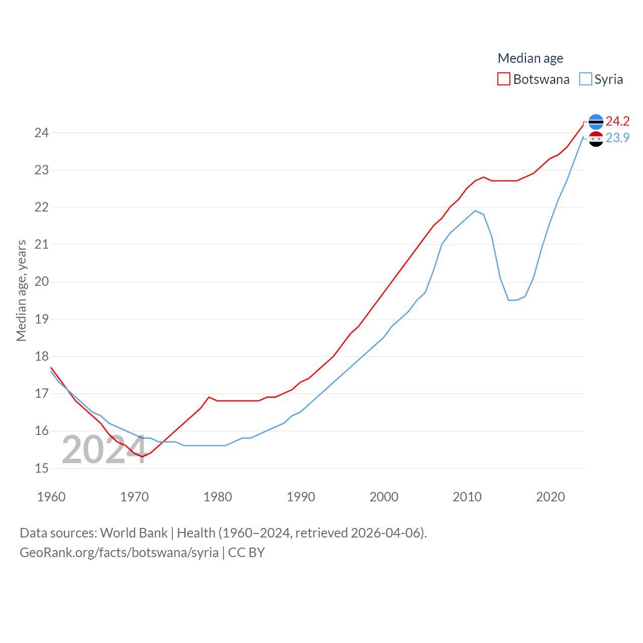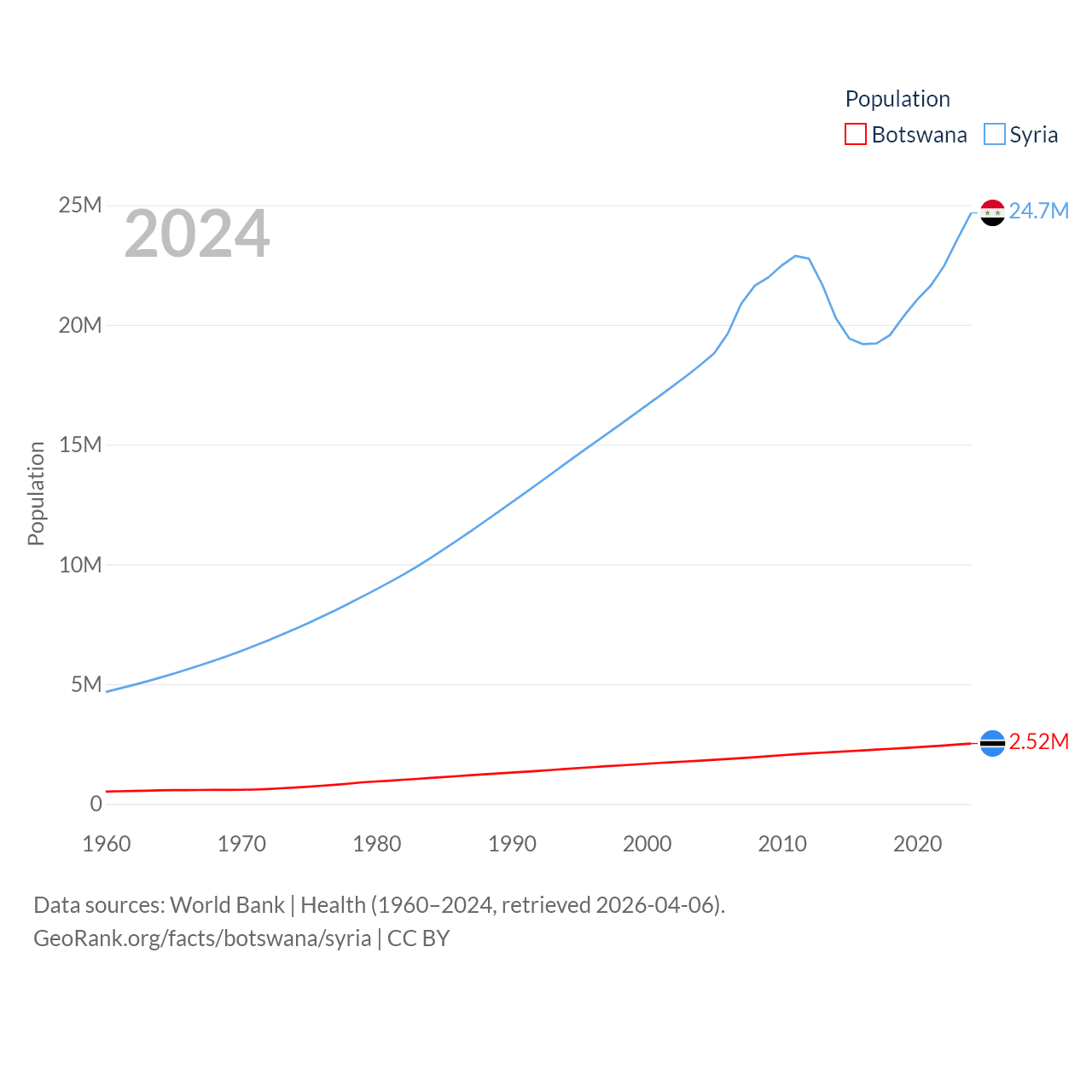 Botswana has a population of 2.52M (ranked 142/197), compared with 24.7M in Syria (ranked 57/197). Botswana's land area is 218,816 sq mi versus 70,900 sq mi for Syria (ranked 47th vs. 87th).
