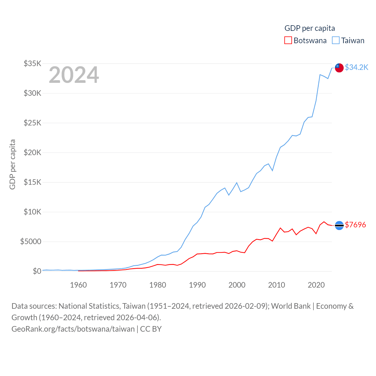 By GDP, Botswana ranks 133/197 ($19.4B) and Taiwan ranks 22/197 ($802B). By GDP per capita, Botswana ranks 97/197 ($7,696), while Taiwan ranks 35/197 ($34,238).