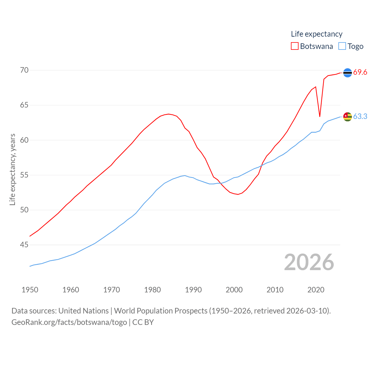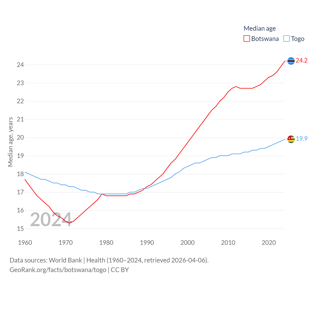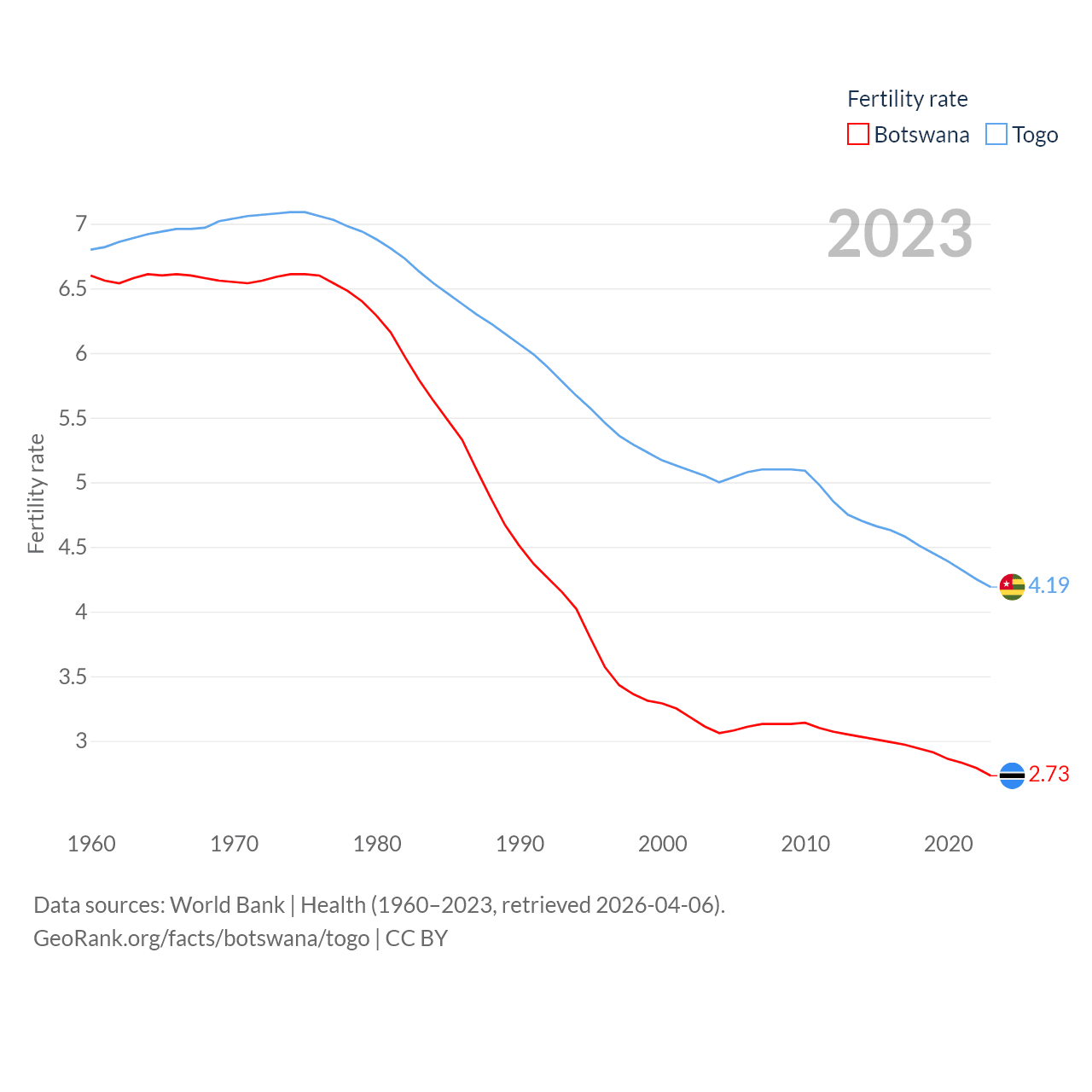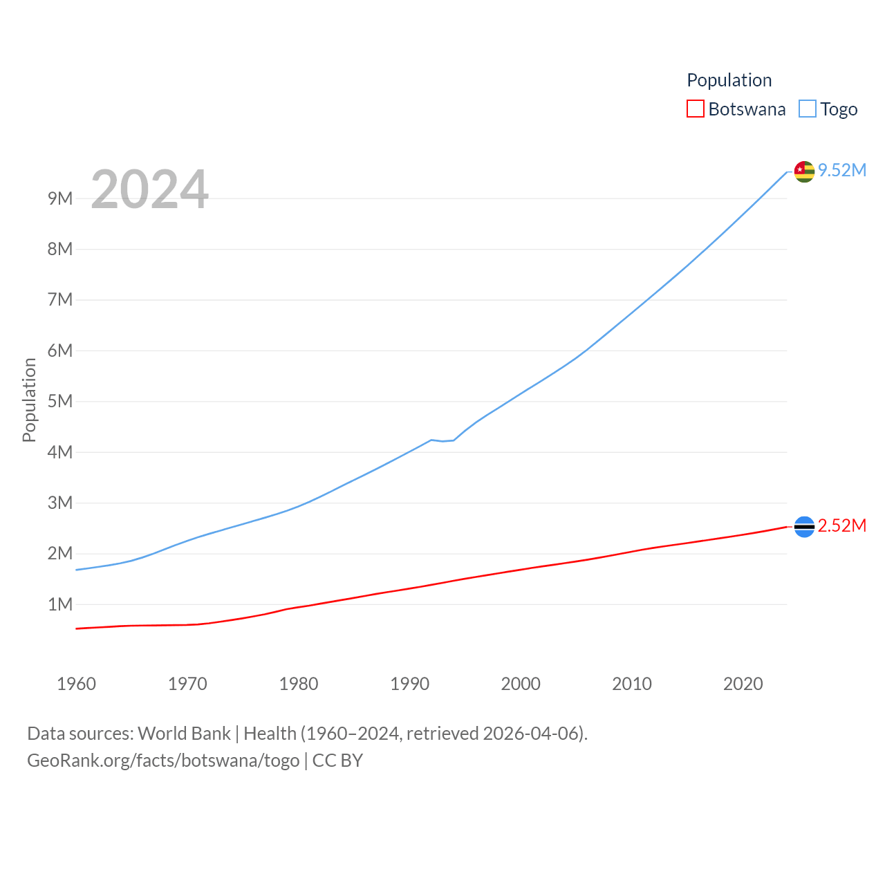 Botswana has a population of 2.52M (ranked 142/197), compared with 9.52M in Togo (ranked 98/197). Botswana's land area is 218,816 sq mi versus 21,000 sq mi for Togo (ranked 47th vs. 124th).