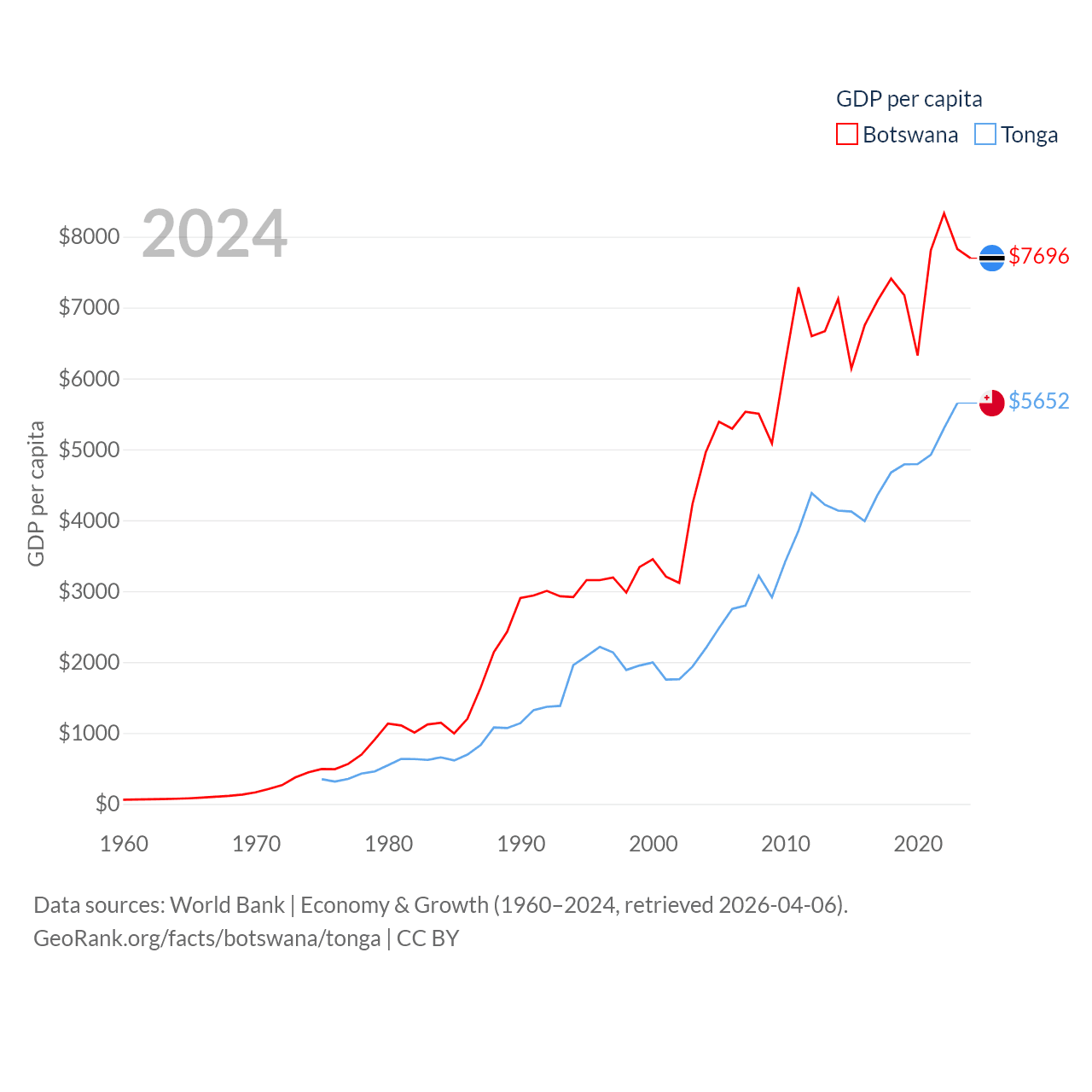 By GDP, Botswana ranks 133/197 ($19.4B) and Tonga ranks 191/197 ($591M). By GDP per capita, Botswana ranks 97/197 ($7,696), while Tonga ranks 115/197 ($5,652).