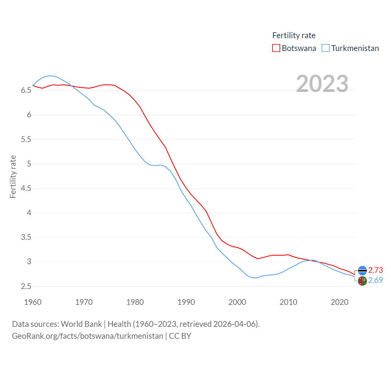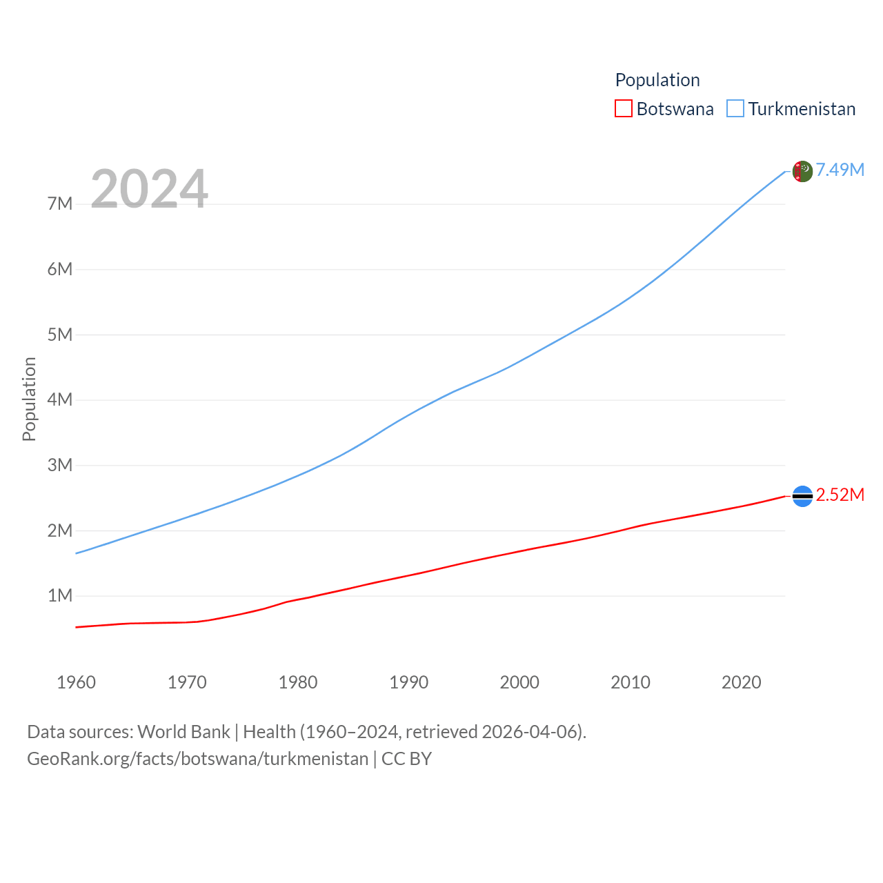 Botswana has a population of 2.52M (ranked 142/197), compared with 7.49M in Turkmenistan (ranked 104/197). Botswana's land area is 218,816 sq mi versus 181,441 sq mi for Turkmenistan (ranked 47th vs. 53rd).