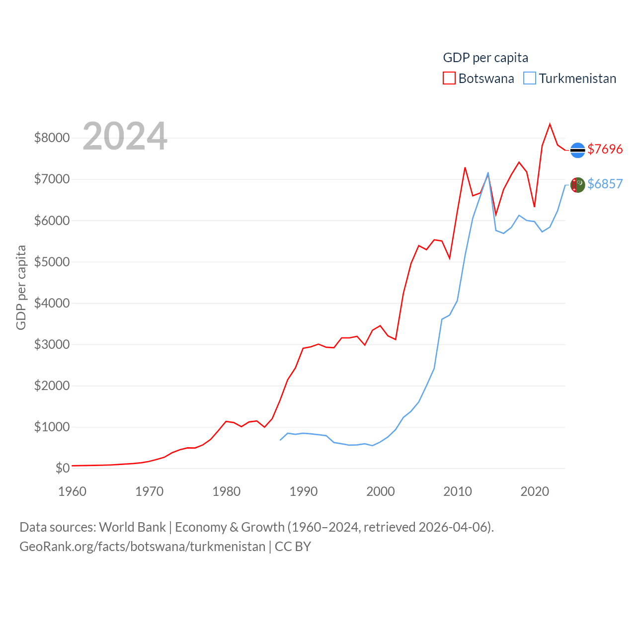 By GDP, Botswana ranks 133/197 ($19.4B) and Turkmenistan ranks 92/197 ($51.4B). By GDP per capita, Botswana ranks 97/197 ($7,696), while Turkmenistan ranks 104/197 ($6,857).