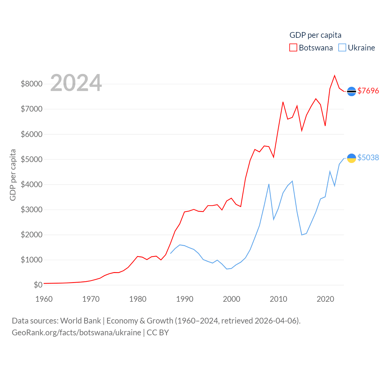 By GDP, Botswana ranks 133/197 ($19.4B) and Ukraine ranks 57/197 ($191B). By GDP per capita, Botswana ranks 97/197 ($7,696), while Ukraine ranks 120/197 ($5,038).