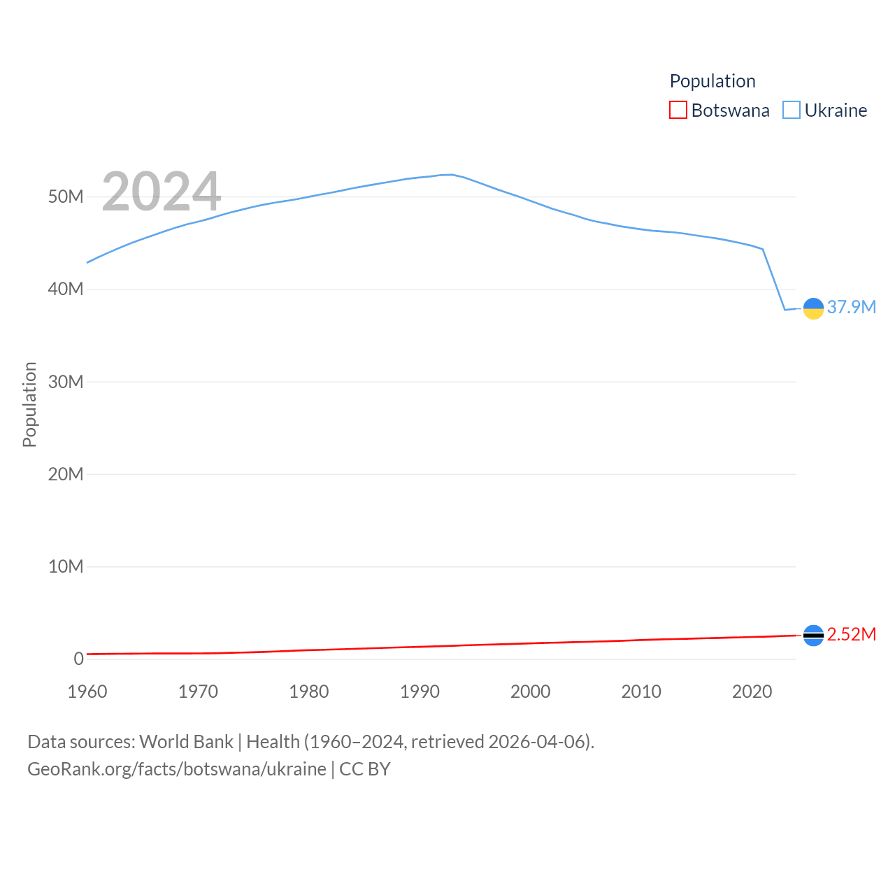 Botswana has a population of 2.52M (ranked 142/197), compared with 37.9M in Ukraine (ranked 41/197). Botswana's land area is 218,816 sq mi versus 223,708 sq mi for Ukraine (ranked 47th vs. 46th).