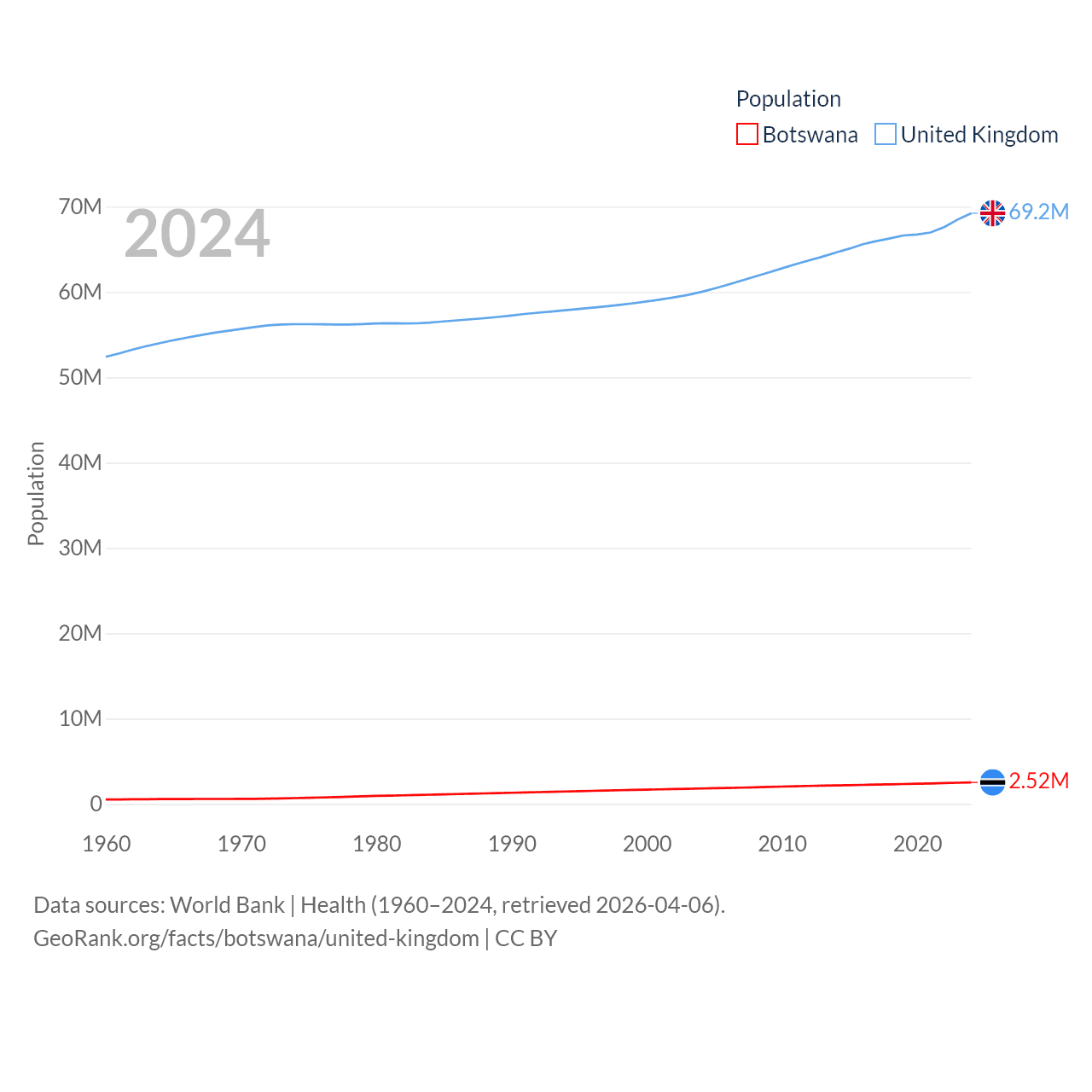Botswana has a population of 2.52M (ranked 142/197), compared with 69.2M in The United Kingdom (ranked 21/197). Botswana's land area is 218,816 sq mi versus 93,410 sq mi for The United Kingdom (ranked 47th vs. 78th).