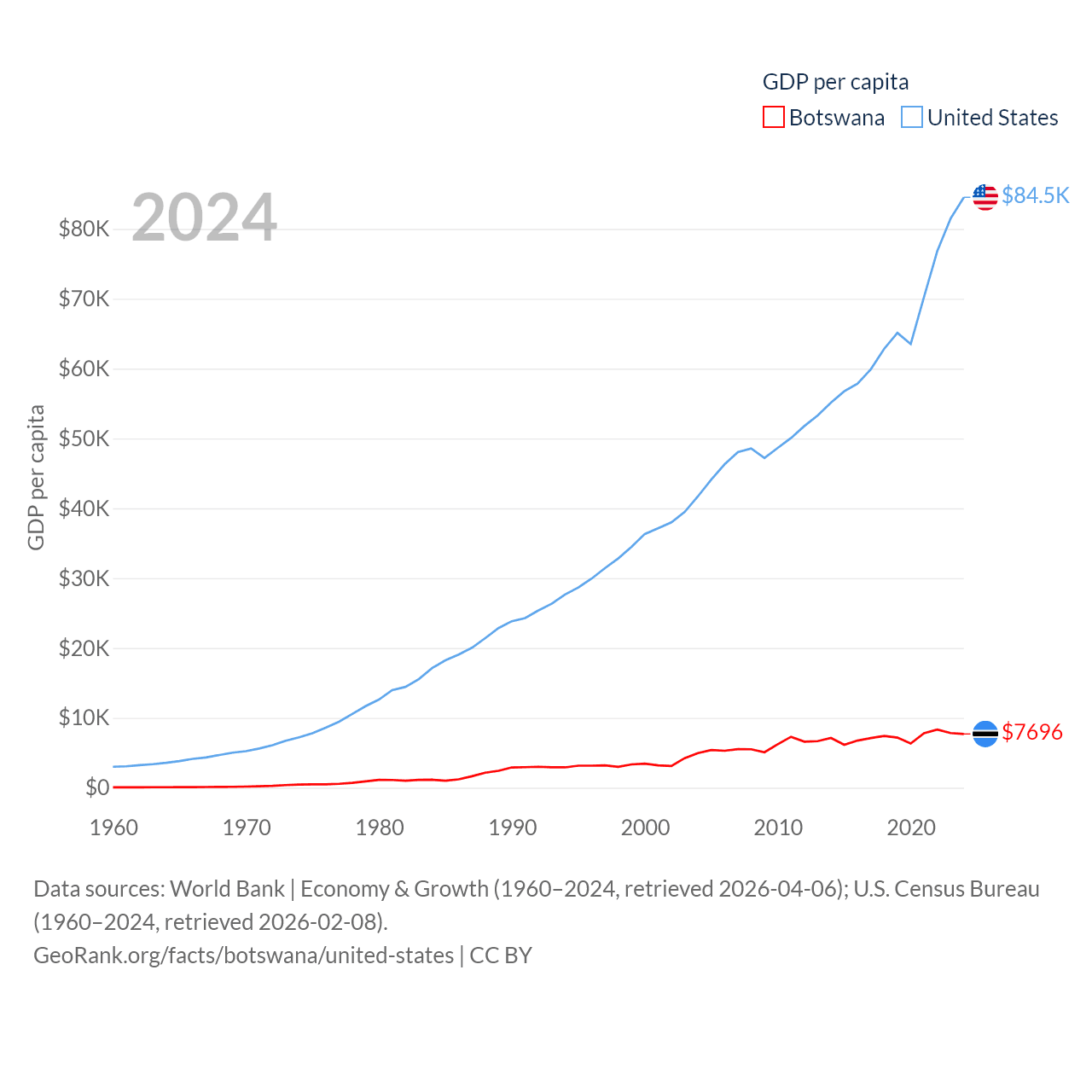 By GDP, Botswana ranks 133/197 ($19.4B) and The United States ranks 1/197 ($28.8T). By GDP per capita, Botswana ranks 97/197 ($7,696), while The United States ranks 10/197 ($84,534).