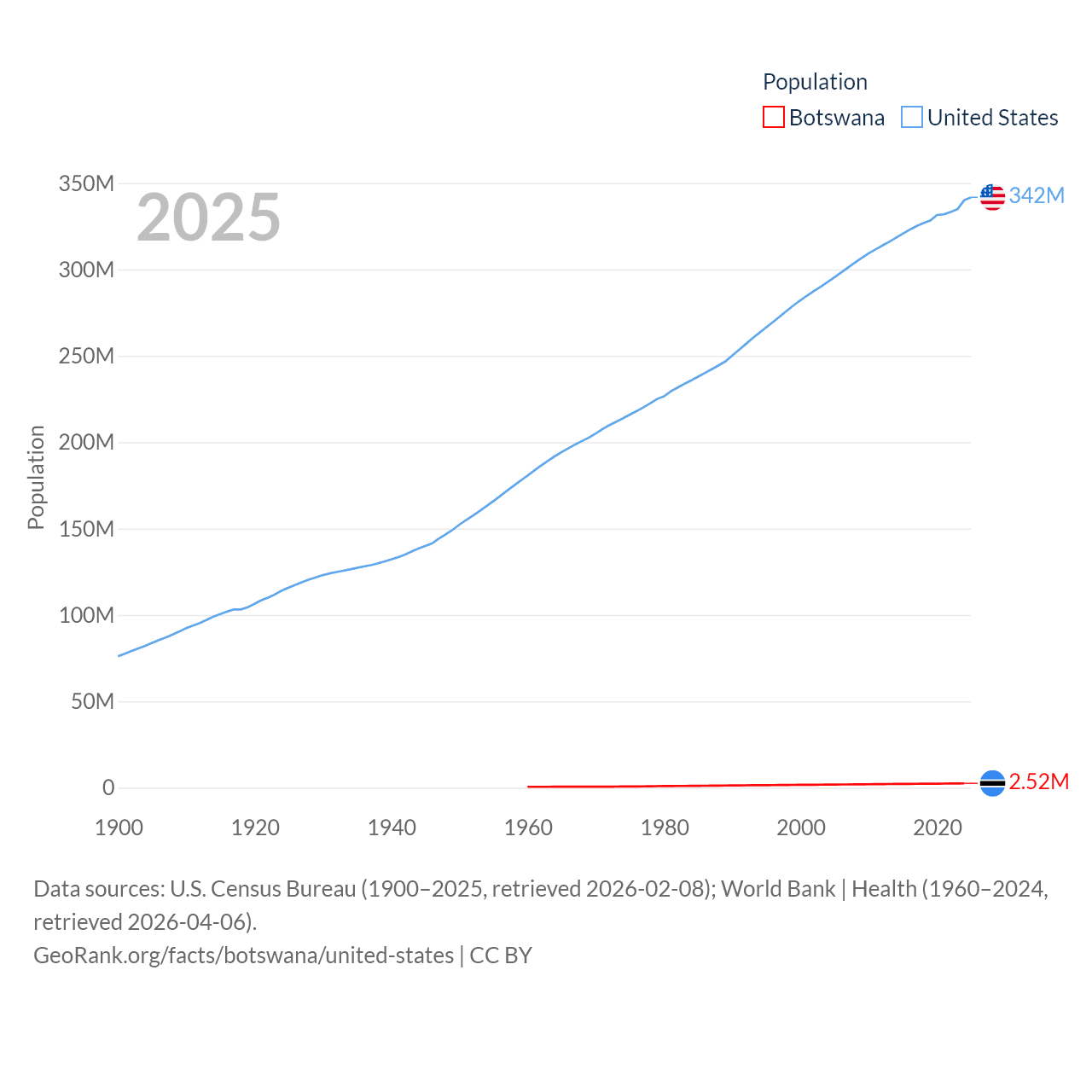 Botswana has a population of 2.52M (ranked 142/197), compared with 342M in The United States (ranked 3/197). Botswana's land area is 218,816 sq mi versus 3,531,839 sq mi for The United States (ranked 47th vs. 3rd).