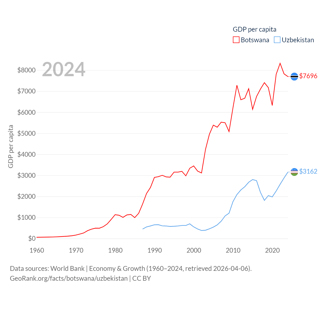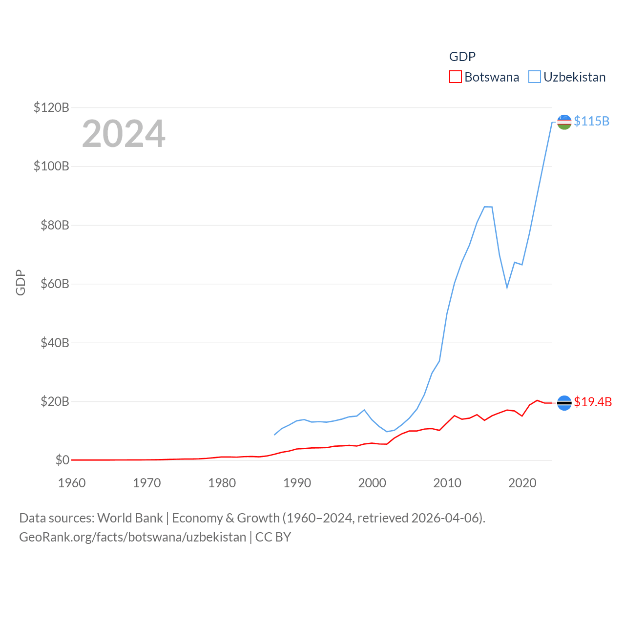 By GDP, Botswana ranks 133/197 ($19.4B) and Uzbekistan ranks 66/197 ($115B). By GDP per capita, Botswana ranks 97/197 ($7,696), while Uzbekistan ranks 139/197 ($3,162).
