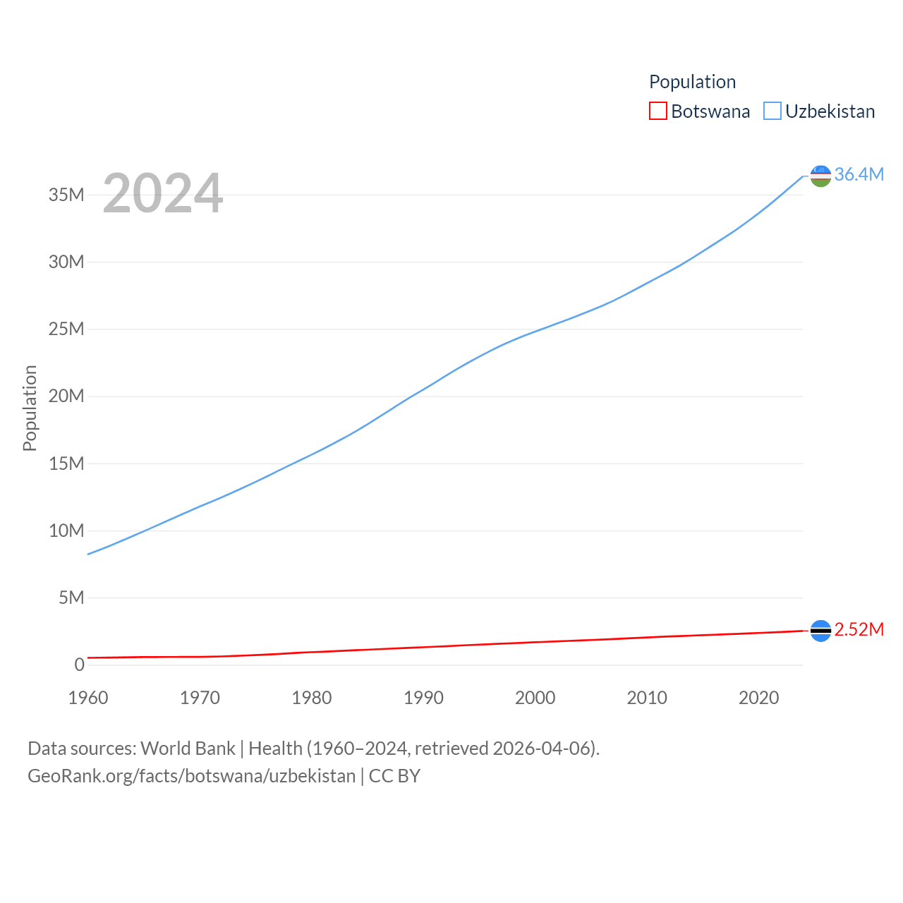 Botswana has a population of 2.52M (ranked 142/197), compared with 36.4M in Uzbekistan (ranked 43/197). Botswana's land area is 218,816 sq mi versus 170,136 sq mi for Uzbekistan (ranked 47th vs. 56th).