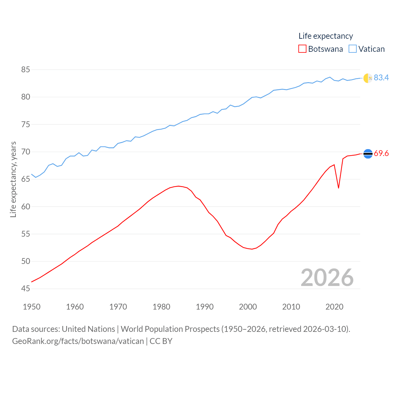 Botswana vs. Vatican life expectancy calculator