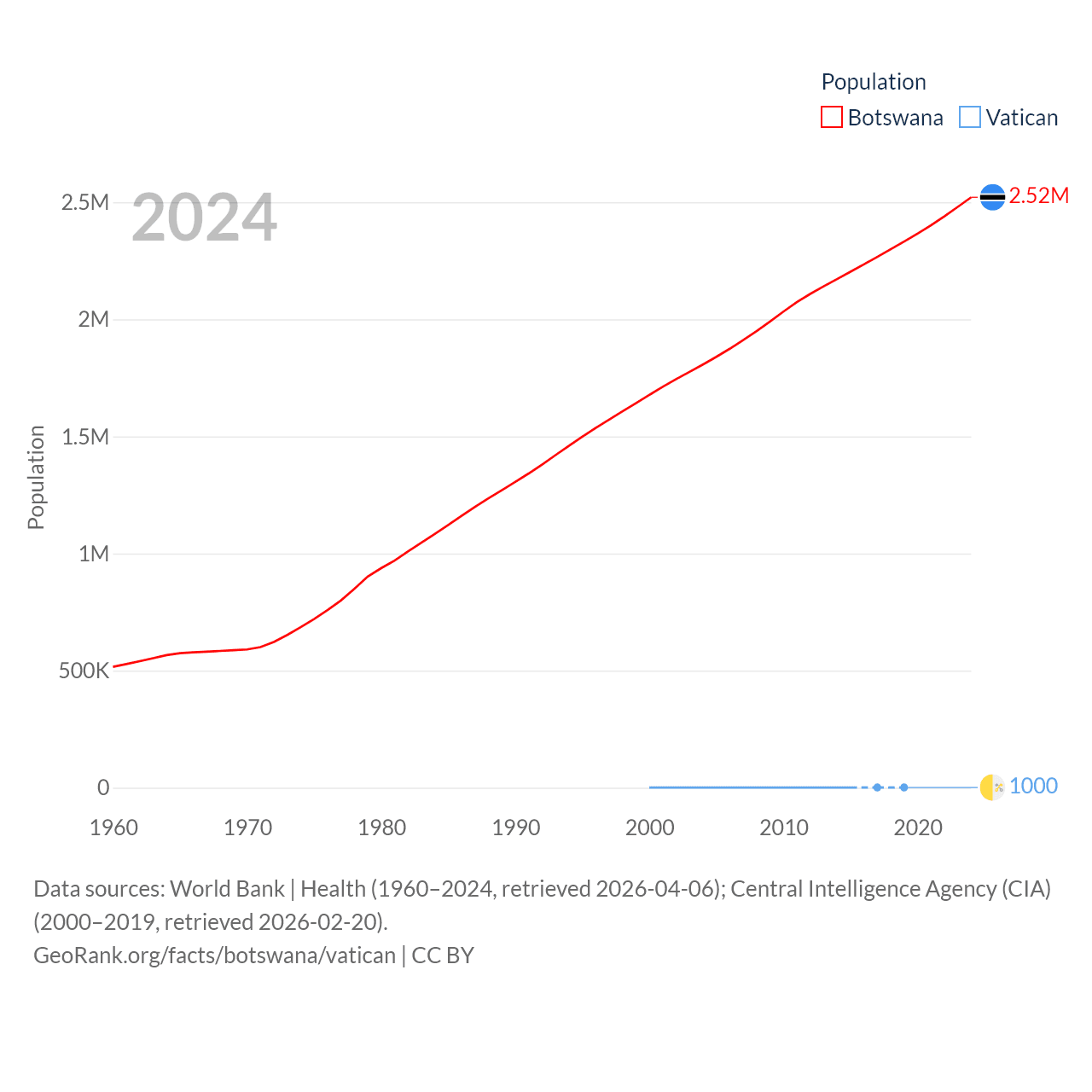 Botswana has a population of 2.52M (ranked 142/197), compared with 1K in The Vatican (ranked 197/197). Botswana's land area is 218,816 sq mi versus 0.17 sq mi for The Vatican (ranked 47th vs. 197th).