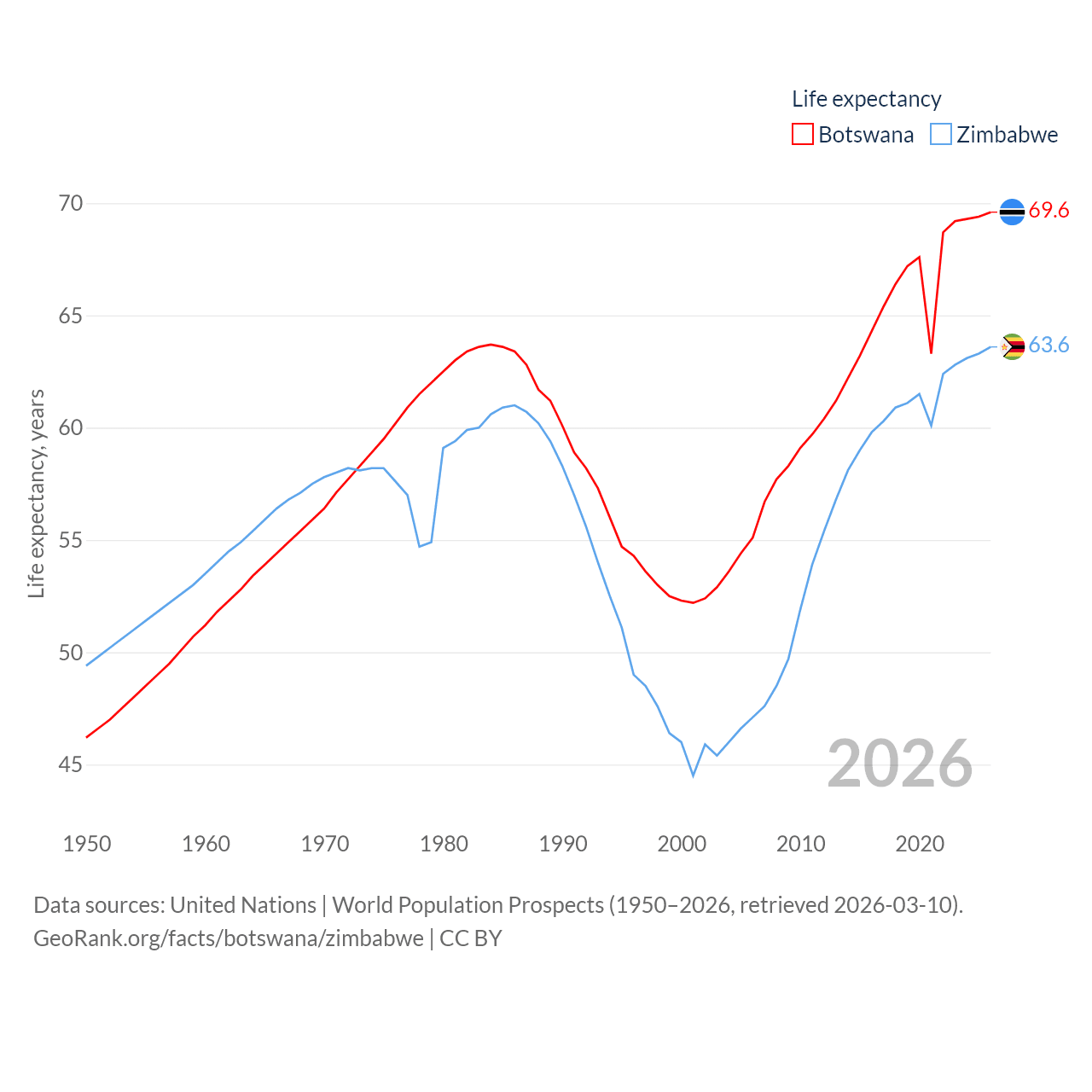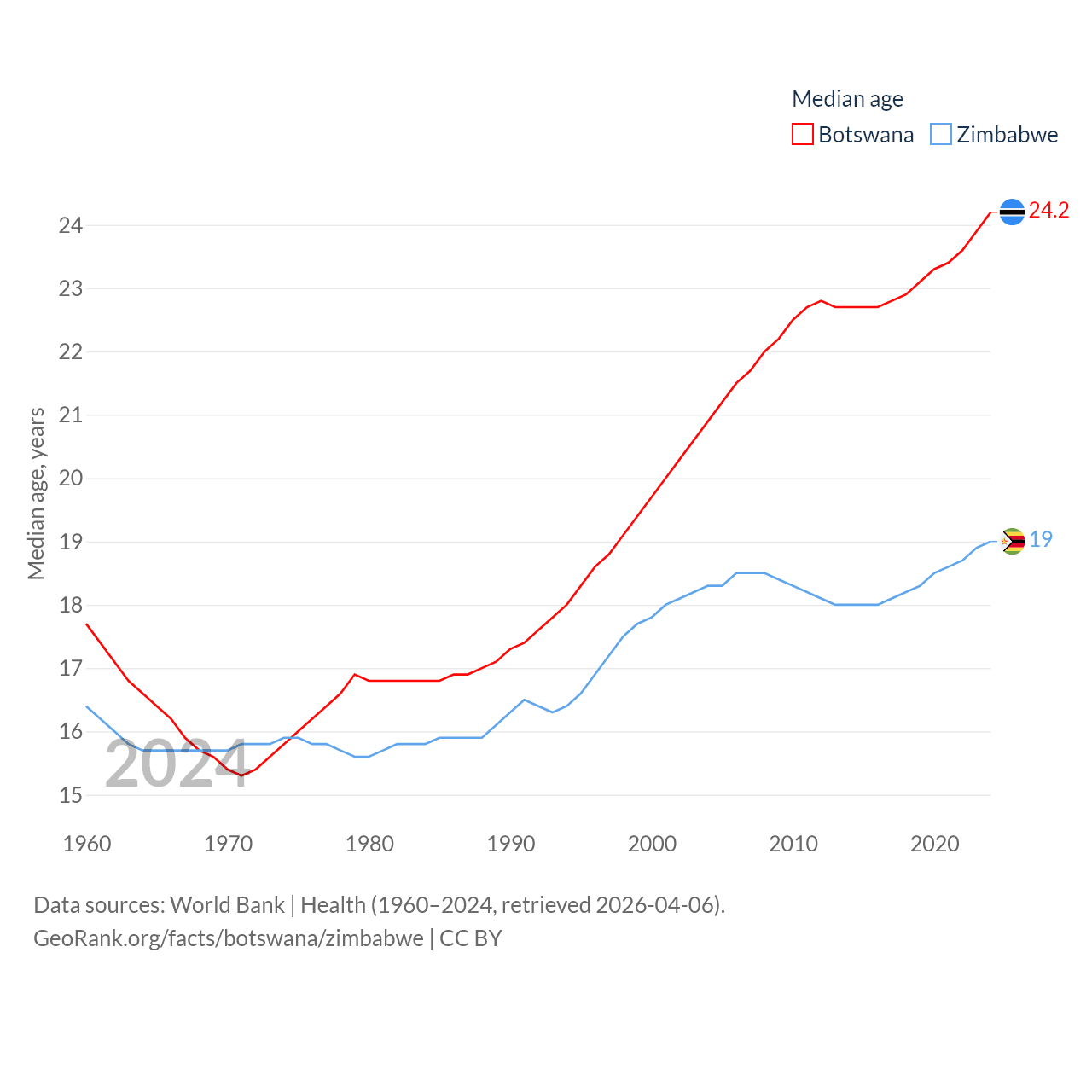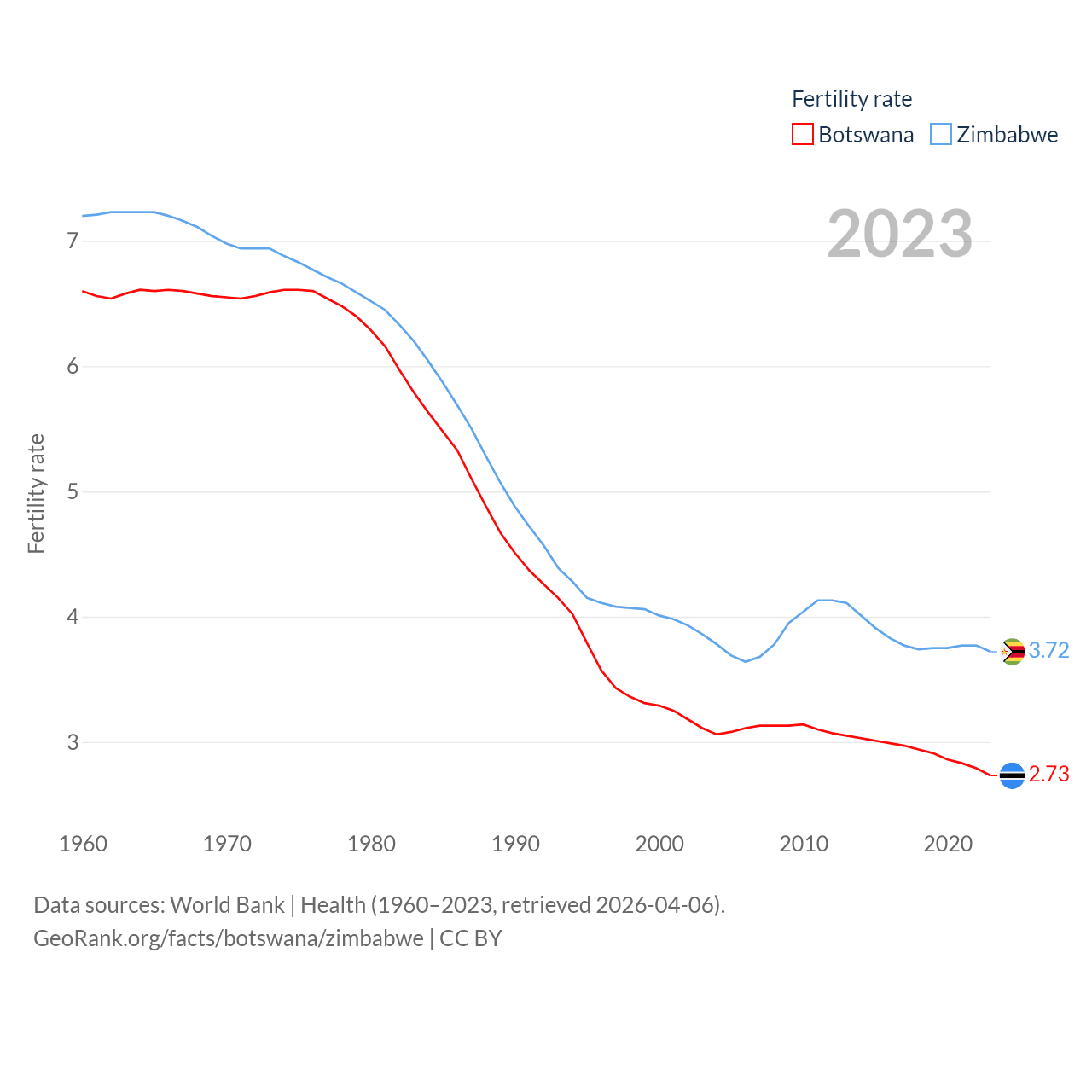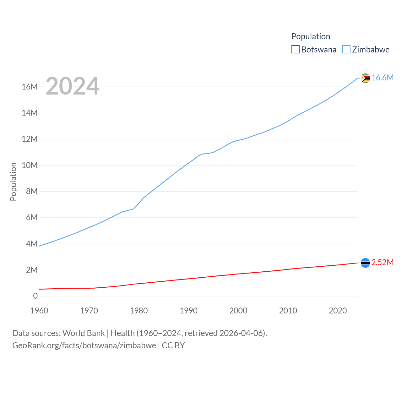 Botswana has a population of 2.52M (ranked 142/197), compared with 16.6M in Zimbabwe (ranked 74/197). Botswana's land area is 218,816 sq mi versus 149,364 sq mi for Zimbabwe (ranked 47th vs. 60th).