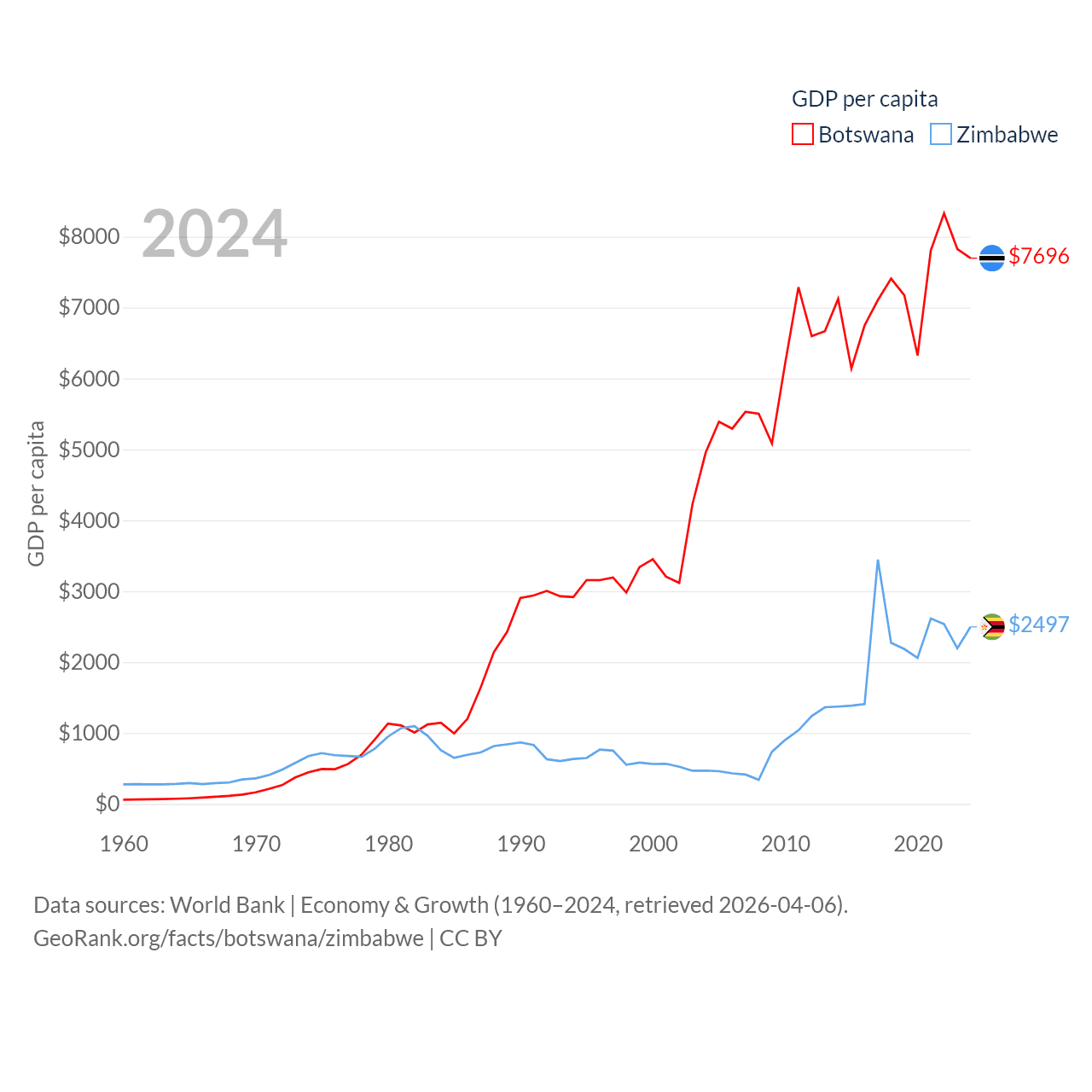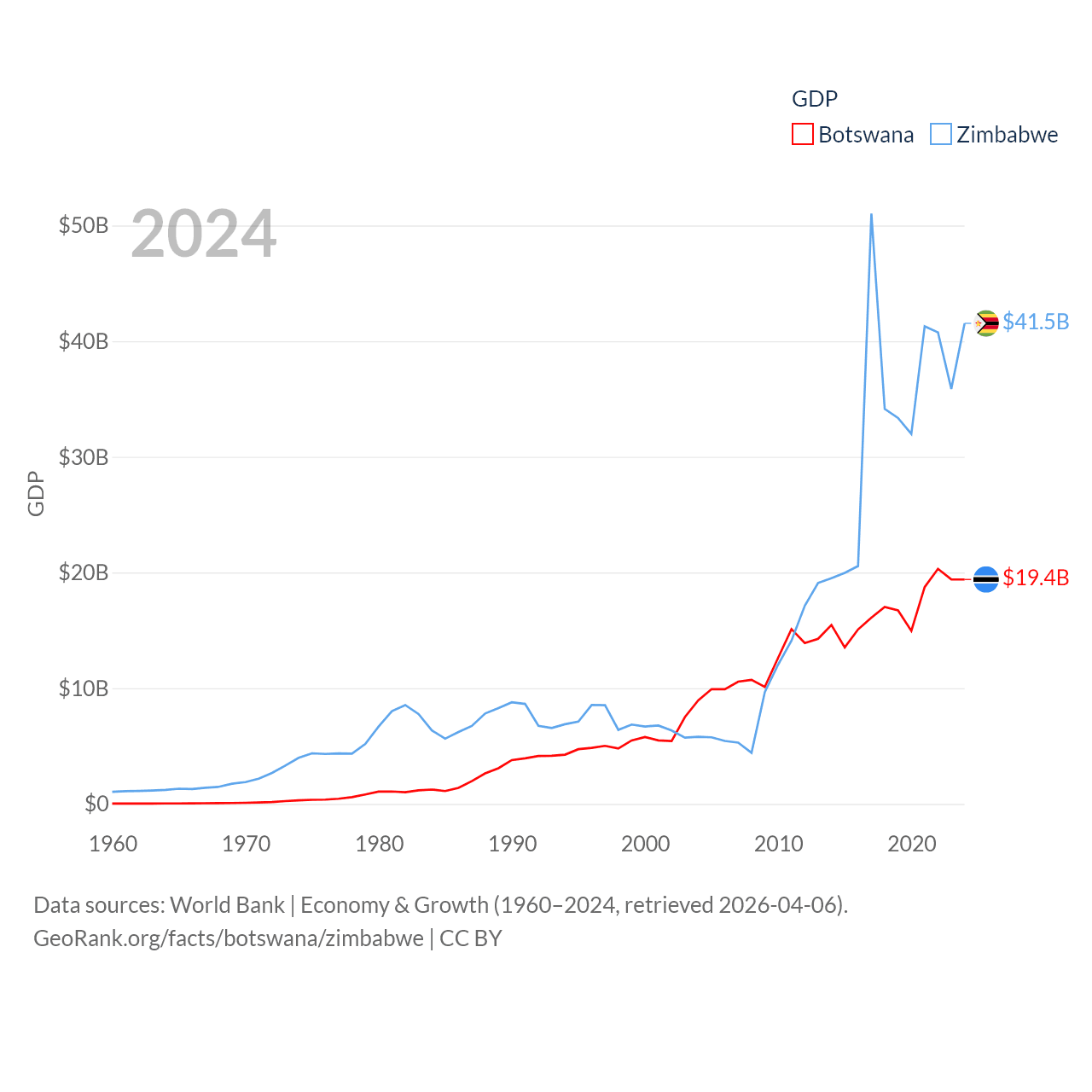 By GDP, Botswana ranks 133/197 ($19.4B) and Zimbabwe ranks 102/197 ($41.5B). By GDP per capita, Botswana ranks 97/197 ($7,696), while Zimbabwe ranks 148/197 ($2,497).
