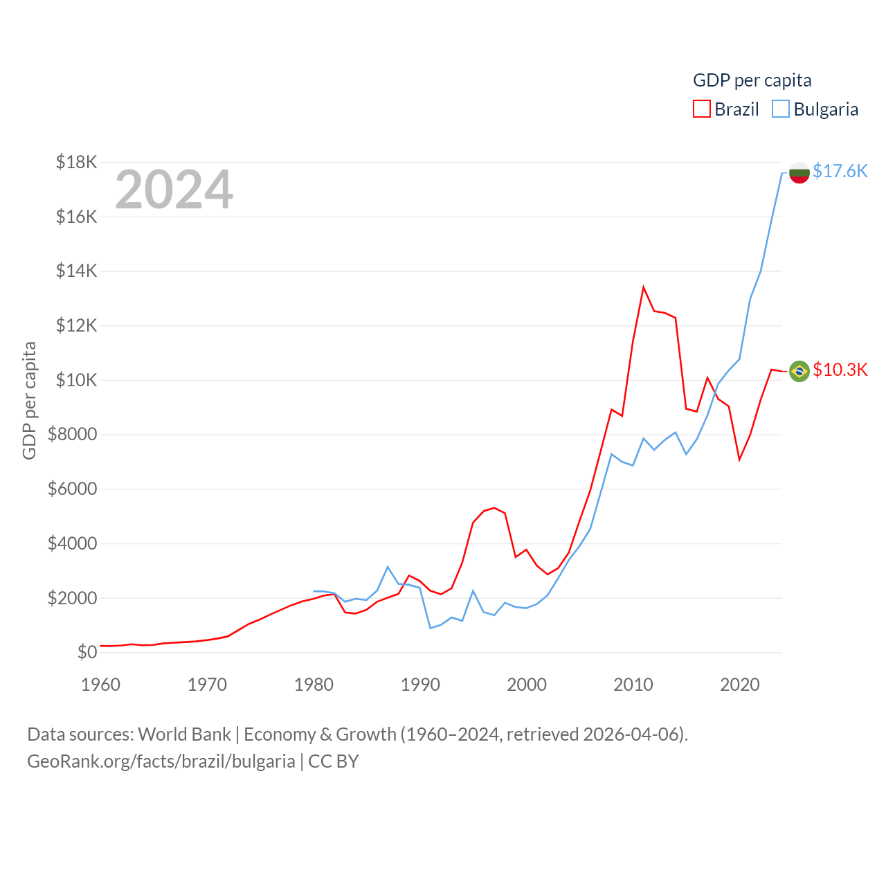 By GDP, Brazil ranks 10/197 ($2.19T) and Bulgaria ranks 67/197 ($113B). By GDP per capita, Brazil ranks 85/197 ($10,311), while Bulgaria ranks 64/197 ($17,596).