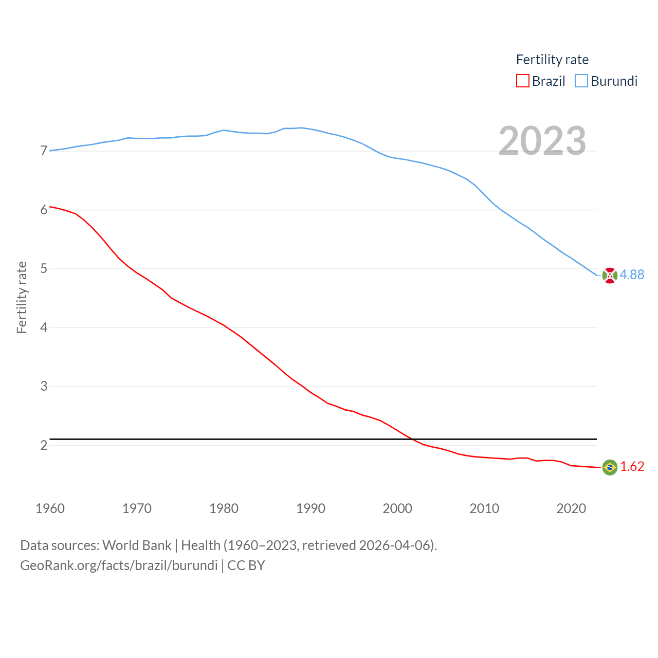 Brazil has a population of 212M (ranked 7/197), compared with 14M in Burundi (ranked 78/197). Brazil's land area is 3,227,096 sq mi versus 9,915 sq mi for Burundi (ranked 5th vs. 144th).