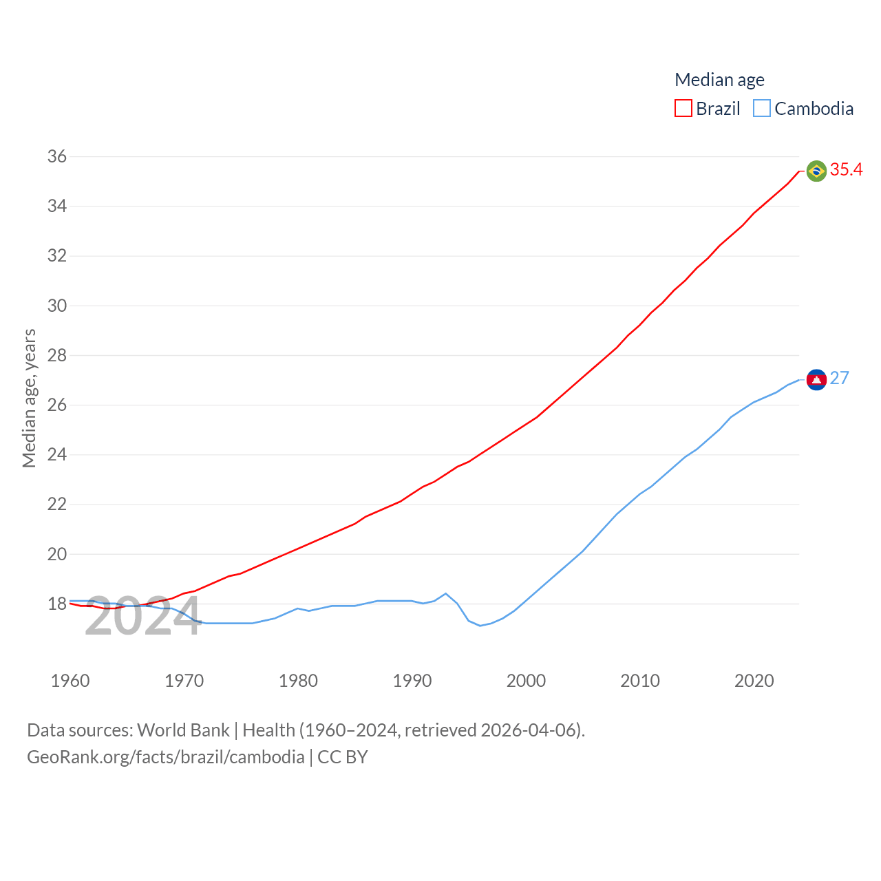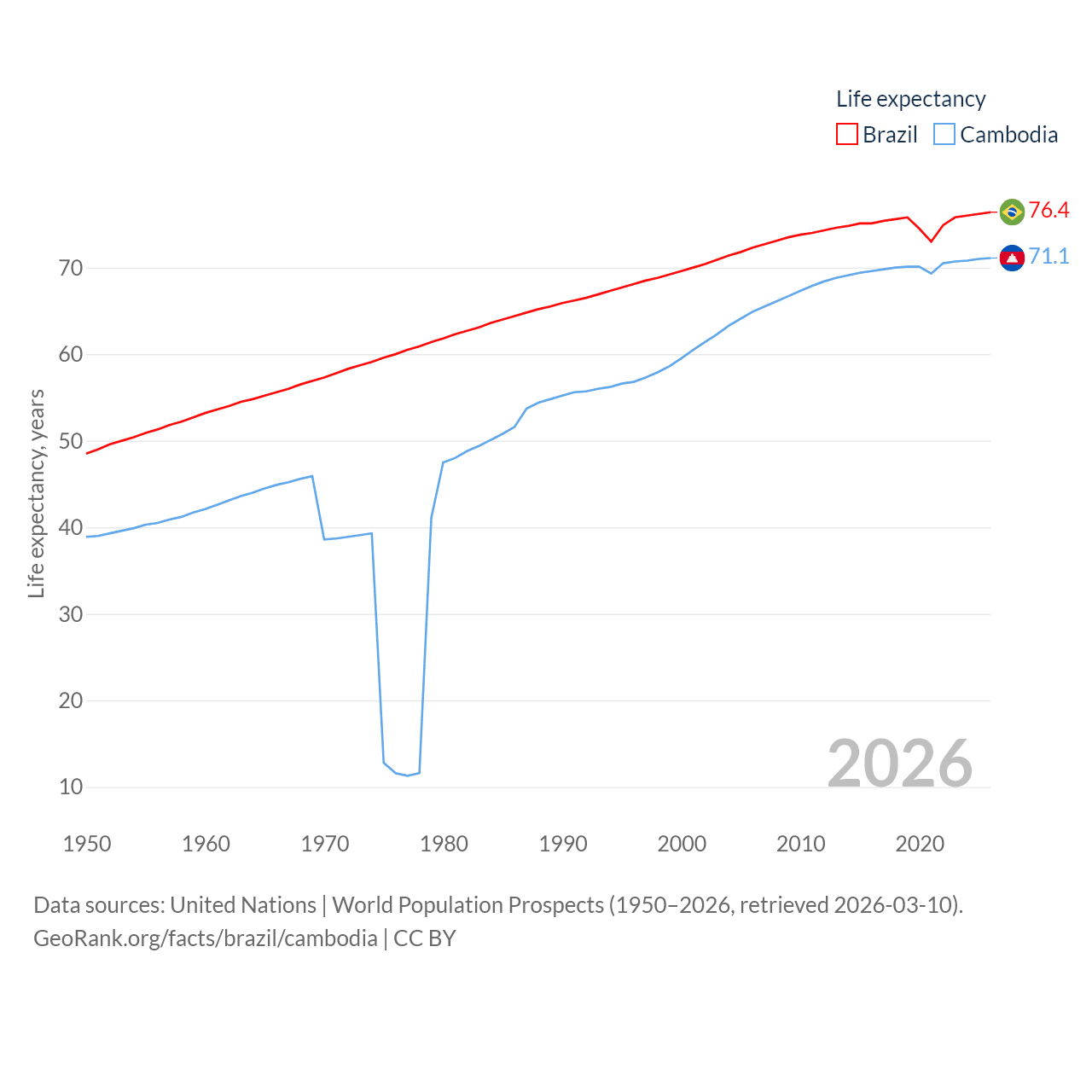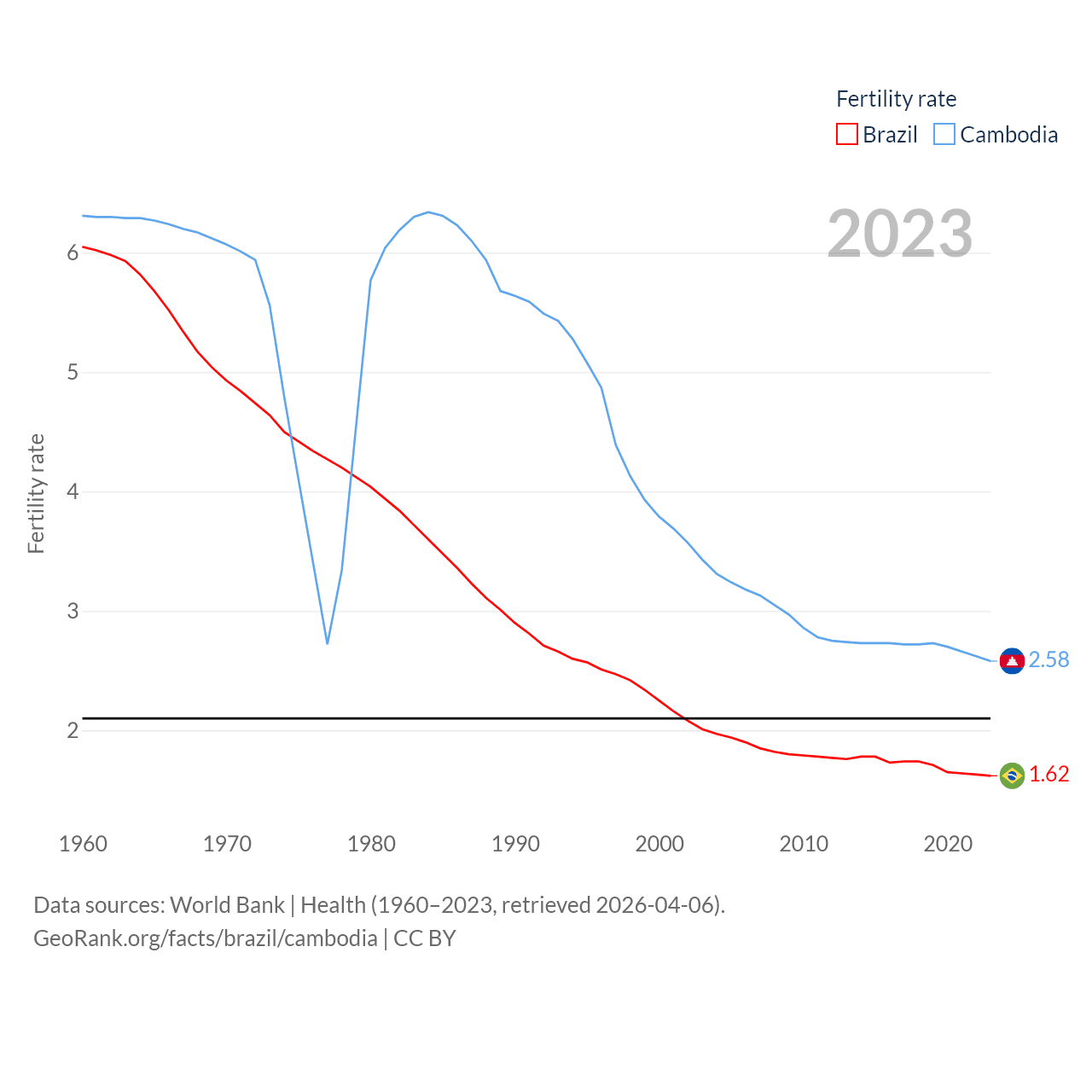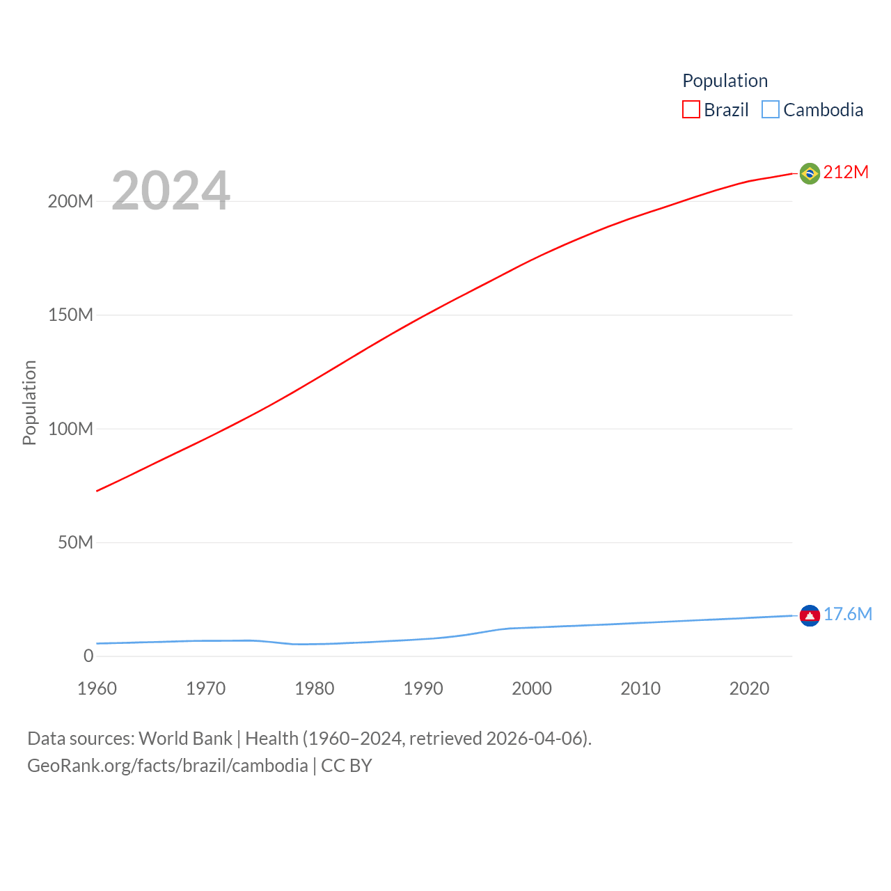 Brazil has a population of 212M (ranked 7/197), compared with 17.6M in Cambodia (ranked 73/197). Brazil's land area is 3,227,096 sq mi versus 68,155 sq mi for Cambodia (ranked 5th vs. 88th).