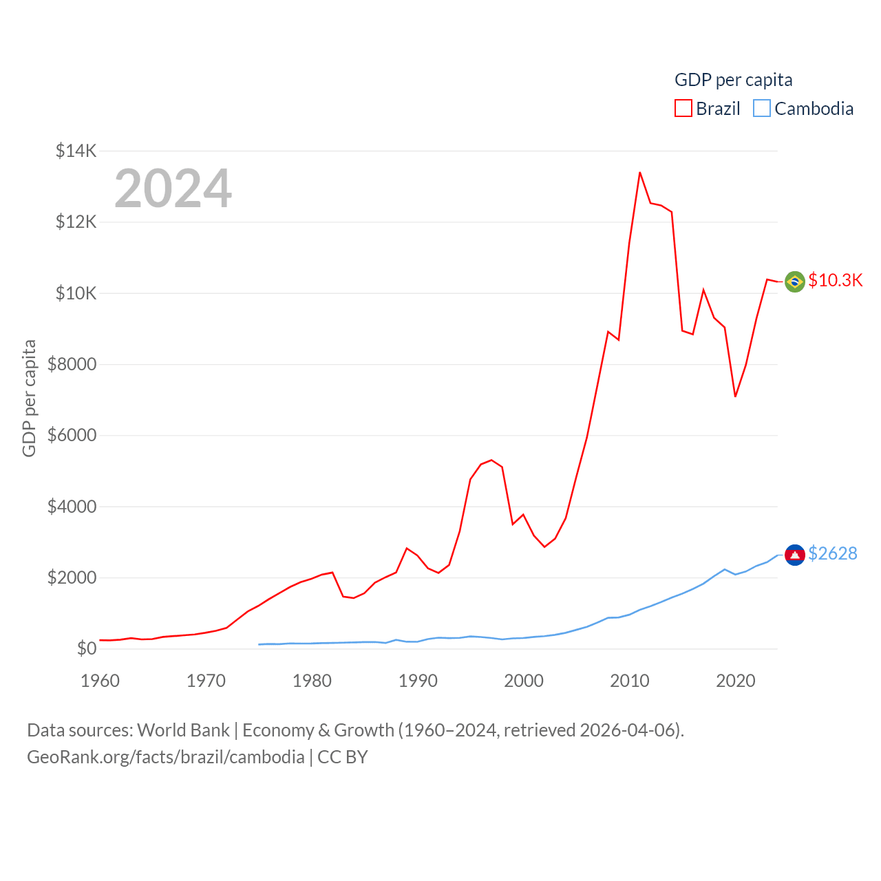 By GDP, Brazil ranks 10/197 ($2.19T) and Cambodia ranks 97/197 ($46.4B). By GDP per capita, Brazil ranks 85/197 ($10,311), while Cambodia ranks 145/197 ($2,628).