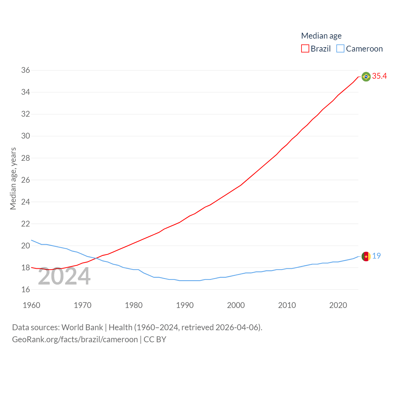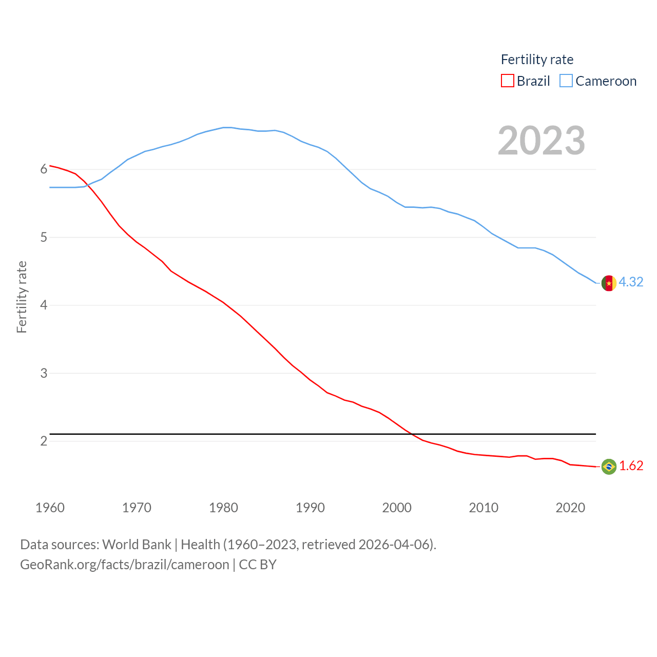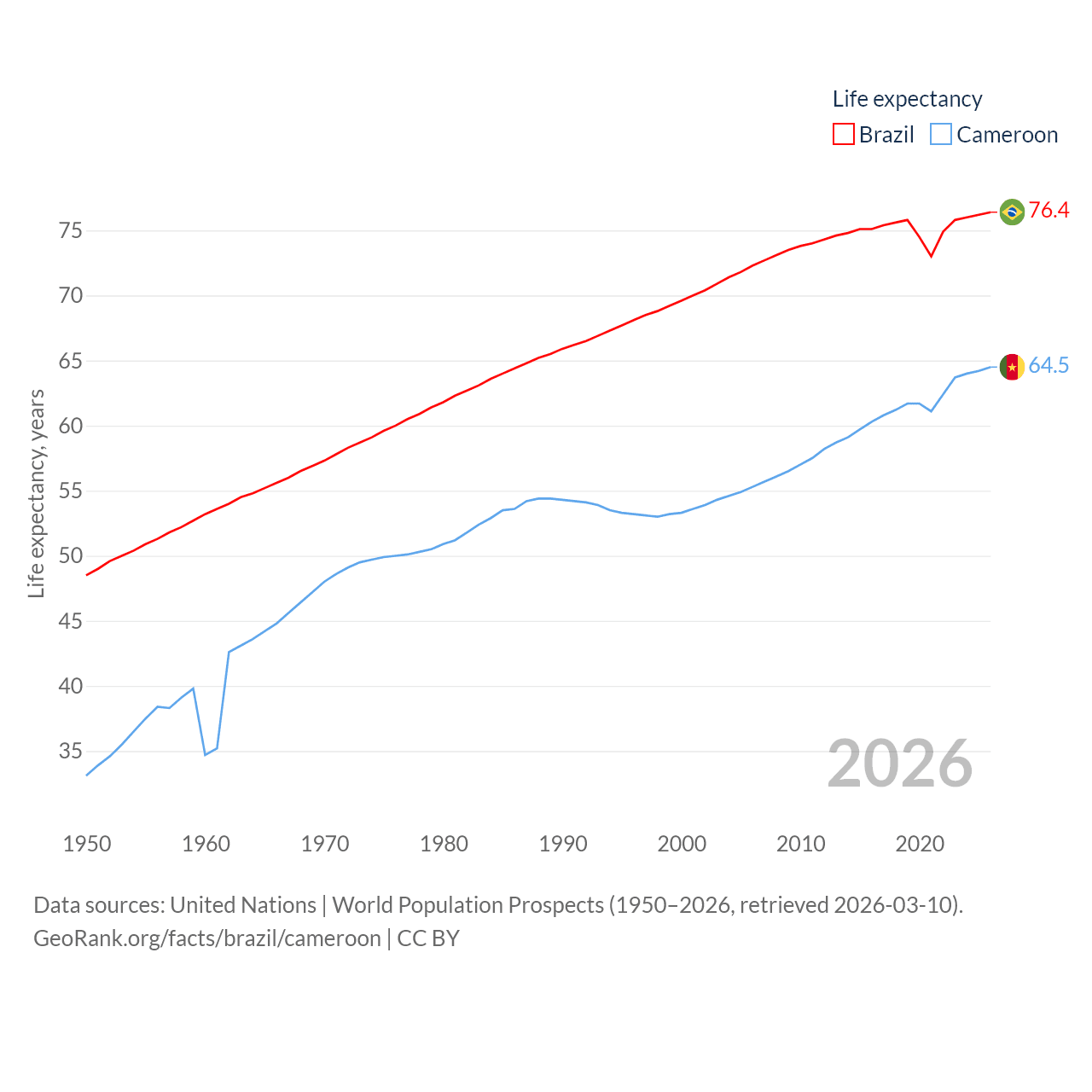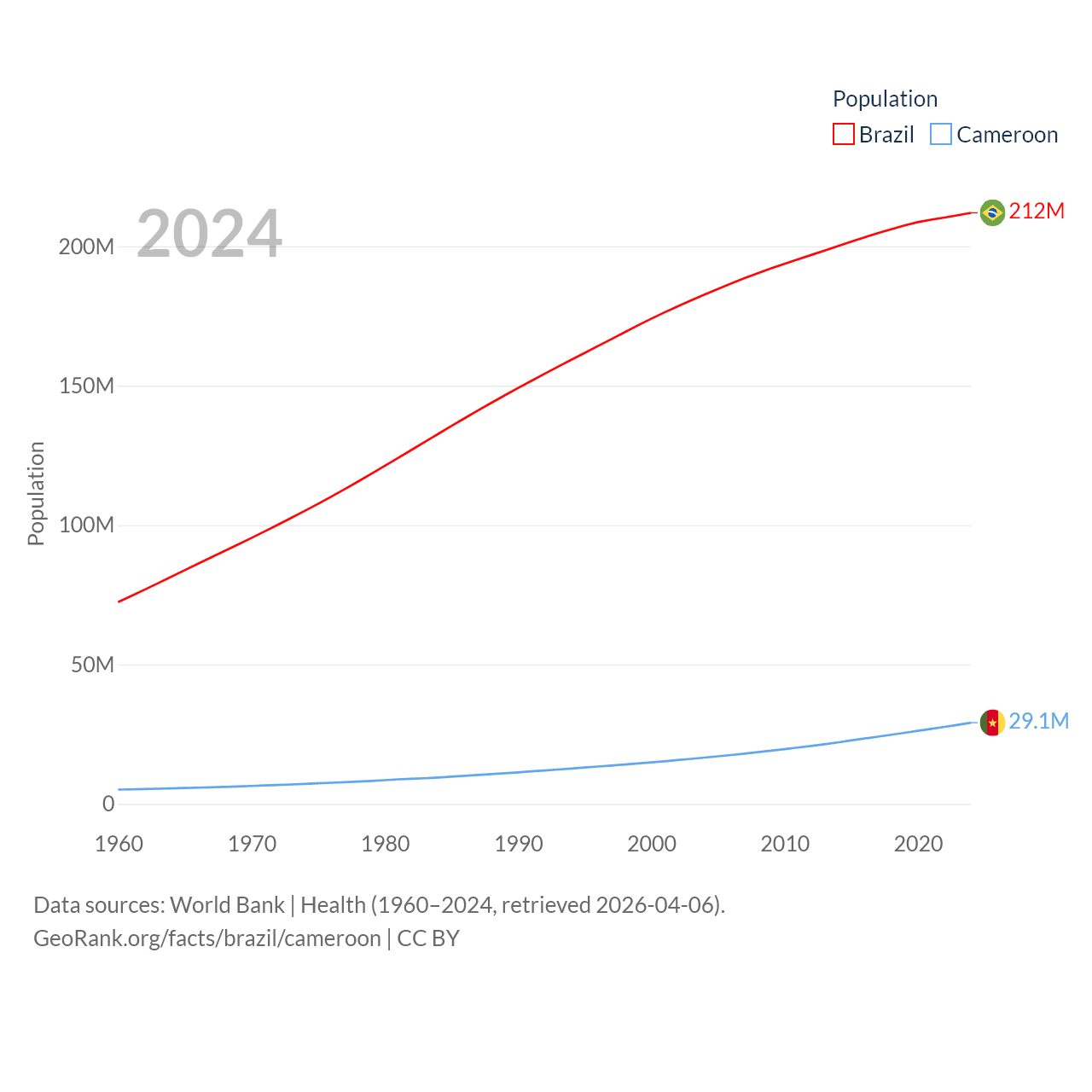Brazil has a population of 212M (ranked 7/197), compared with 29.1M in Cameroon (ranked 52/197). Brazil's land area is 3,227,096 sq mi versus 182,514 sq mi for Cameroon (ranked 5th vs. 52nd).