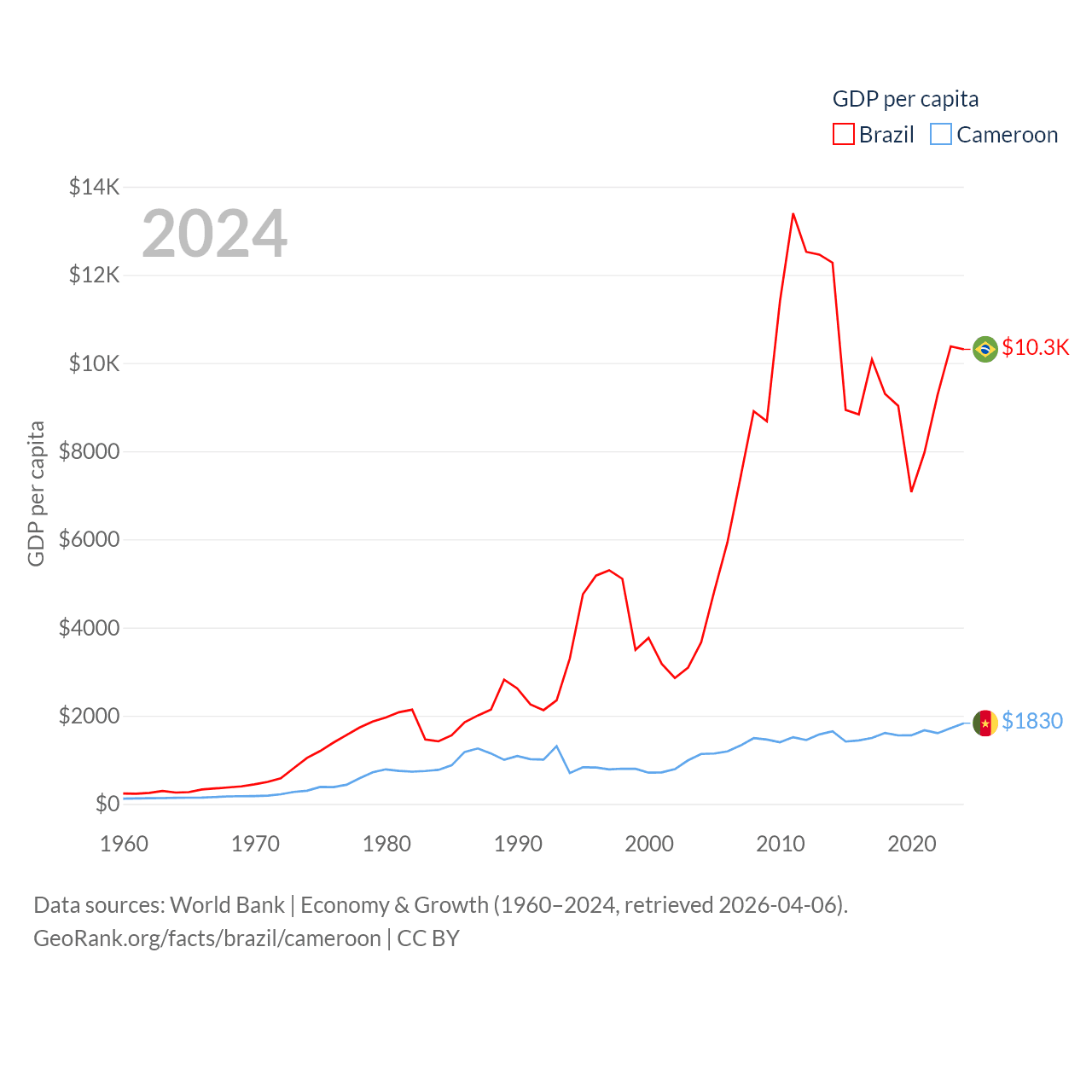 By GDP, Brazil ranks 10/197 ($2.19T) and Cameroon ranks 91/197 ($53.3B). By GDP per capita, Brazil ranks 85/197 ($10,311), while Cameroon ranks 158/197 ($1,830).