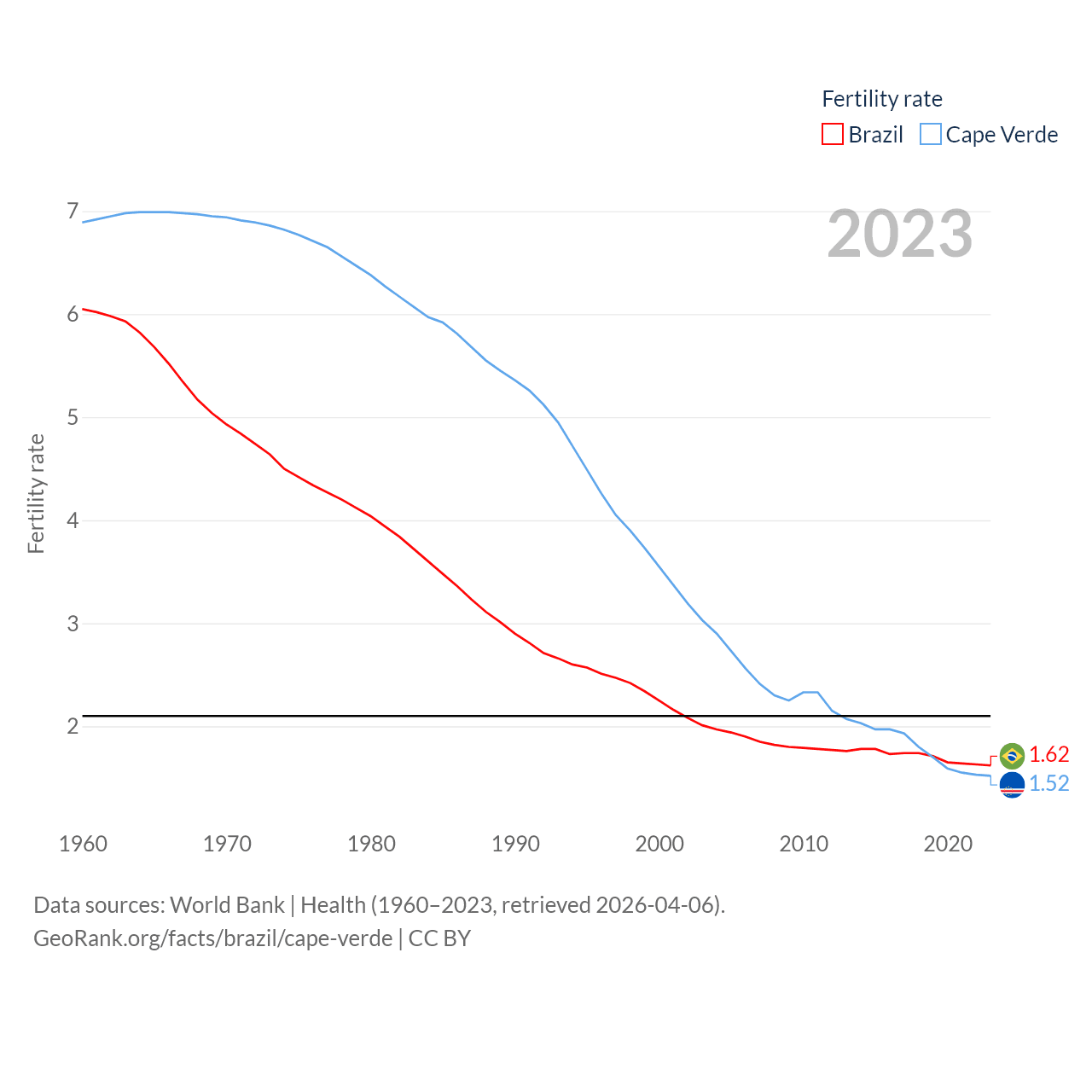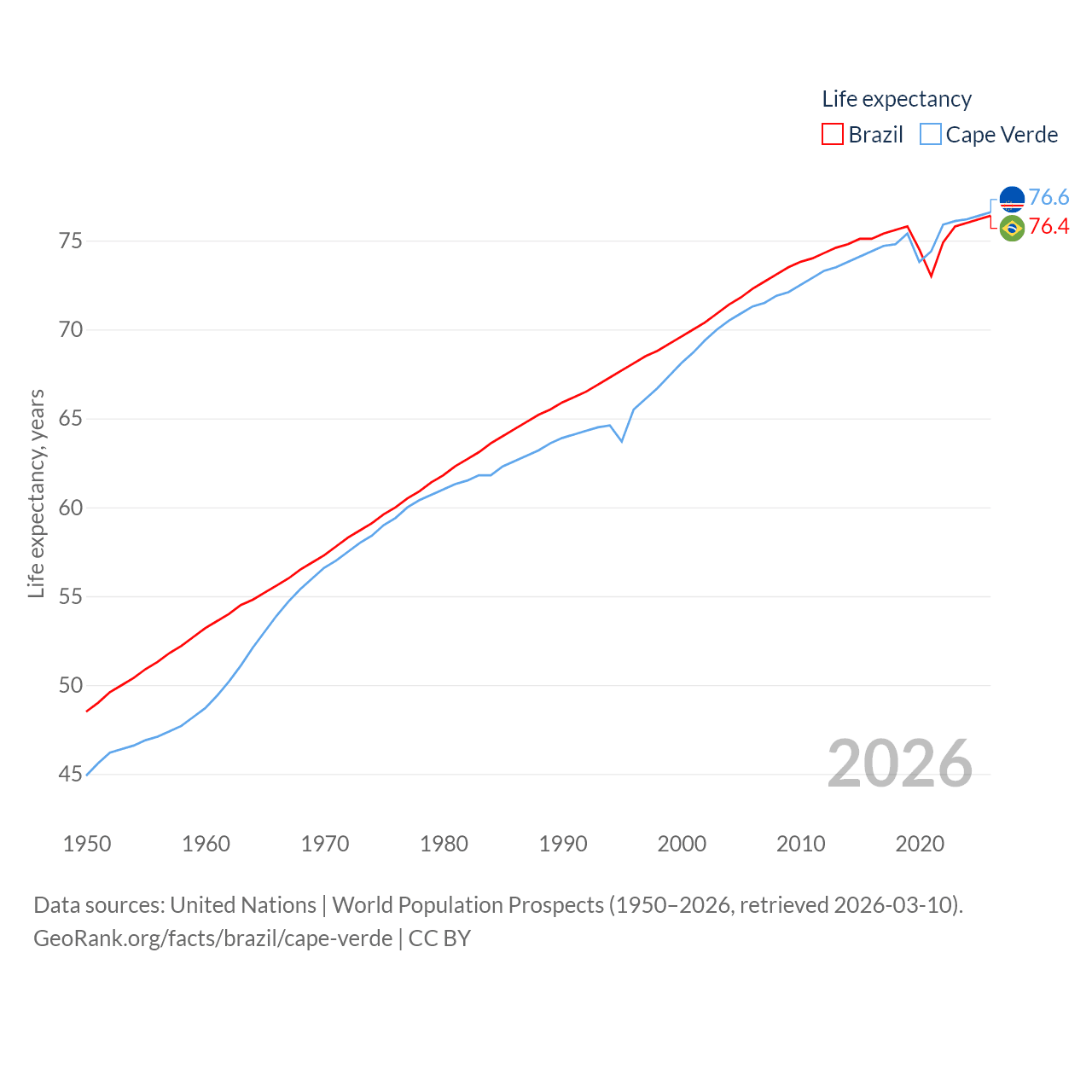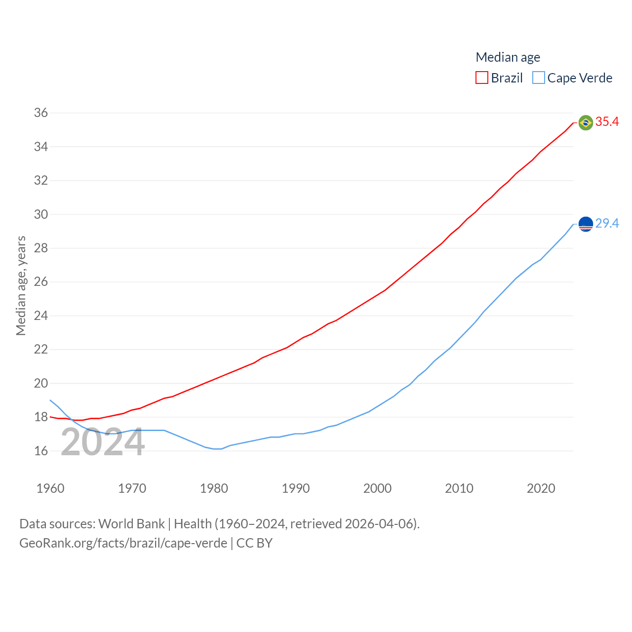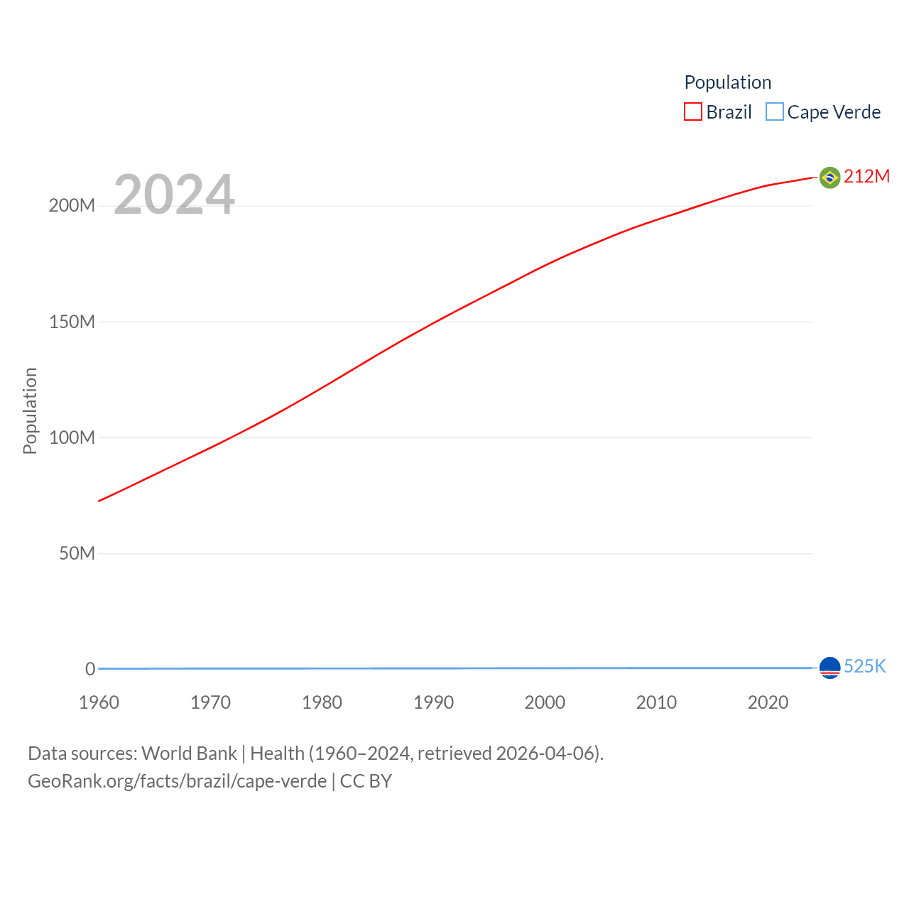 Brazil has a population of 212M (ranked 7/197), compared with 525K in Cape Verde (ranked 169/197). Brazil's land area is 3,227,096 sq mi versus 1,556 sq mi for Cape Verde (ranked 5th vs. 167th).