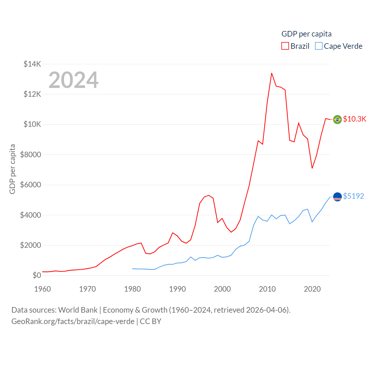 By GDP, Brazil ranks 10/197 ($2.19T) and Cape Verde ranks 172/197 ($2.73B). By GDP per capita, Brazil ranks 85/197 ($10,311), while Cape Verde ranks 118/197 ($5,192).